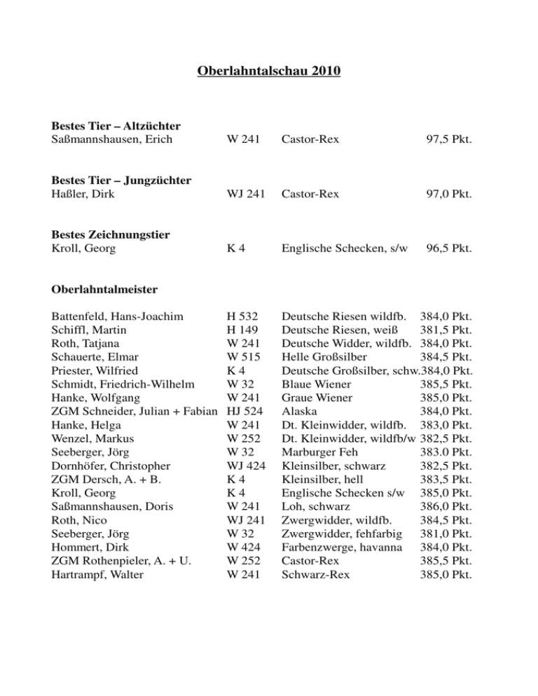 Oberlahntalschau 2010 Bestes Tier – Altzüchter Saßmannshausen, Erich W 241 Castor-Rex 97,5 Pkt. Bestes Tier – Jungzüchter Haßler, Dirk WJ 241 Castor-Rex 97,0 Pkt. Bestes Zeichnungstier Kroll, Georg K4 Englische Schecken, s/w 96,5 Pkt. H 532 H 149 W 241 W 515 K4 W 32 W 241 HJ 524 W 241 W 252 W 32 WJ 424 K4 K4 W 241 WJ 241 W 32 W 424 W 252 W 241 Deutsche Riesen wildfb. 384,0 Pkt. Deutsche Riesen, weiß 381,5 Pkt. Deutsche Widder, wildfb. 384,0 Pkt. Helle Großsilber 384,5 Pkt. Deutsche Großsilber, schw.384,0 Pkt. Blaue Wiener 385,5 Pkt. Graue Wiener 385,0 Pkt. Alaska 384,0 Pkt. Dt. Kleinwidder, wildfb. 383,0 Pkt. Dt. Kleinwidder, wildfb/w 382,5 Pkt. Marburger Feh 383.0 Pkt. Kleinsilber, schwarz 382,5 Pkt. Kleinsilber, hell 383,5 Pkt. Englische Schecken s/w 385,0 Pkt. Loh, schwarz 386,0 Pkt. Zwergwidder, wildfb. 384,5 Pkt. Zwergwidder, fehfarbig 381,0 Pkt. Farbenzwerge, havanna 384,0 Pkt. Castor-Rex 385,5 Pkt. Schwarz-Rex 385,0 Pkt. Oberlahntalmeister Battenfeld, Hans-Joachim Schiffl, Martin Roth, Tatjana Schauerte, Elmar Priester, Wilfried Schmidt, Friedrich-Wilhelm Hanke, Wolfgang ZGM Schneider, Julian + Fabian Hanke, Helga Wenzel, Markus Seeberger, Jörg Dornhöfer, Christopher ZGM Dersch, A. + B. Kroll, Georg Saßmannshausen, Doris Roth, Nico Seeberger, Jörg Hommert, Dirk ZGM Rothenpieler, A. + U. Hartrampf, Walter Beste Zuchtgruppen SE 1 – Saßmannshausen, Erich SE 2 - Haßler, Dirk SE 3 – Diehl, Toni SE 4 – Riechel, Uwe SE 5 – Kroll, Georg SE 6 – Hanke, Wolfgang SE 7 – Hartrampf, Walter SE 8 – Hammer, Lars + Nils SE 9 – Münker, Lorena + Leonie SE 10 – Roth, Tobias + Lisa SE 11 – Teichmann, Luca W 241 WJ 241 W 361 H 532 K4 W 241 W 241 WJ 241 WJ 424 WJ 424 WJ 361 Castor-Rex Castor-Rex Helle Großsilber Loh, schwarz Englische Schecken s/w Graue Wiener Schwarz-Rex Castor-Rex Zwergwidder, schwarz Farbenzwerge, hotot Blaue Wiener 385,5 Pkt. 385,0 Pkt. 384,5 Pkt. 384,5 Pkt. 384,5 Pkt. 384,0 Pkt. 384,0 Pkt. 384,0 Pkt. 383,5 Pkt. 383,5 Pkt. 383,5 Pkt. Vereinsmeisterschaft Oberlahntalschau 1.Platz 2.Platz 3.Platz W 361 Netphen K 4 Frankenberg W 252 Erndtebrück e.V. 963,5 Pkt. 962,0 Pkt. 961,0 Pkt. Lokalschau 2010 Altzüchter LVM LVM LVM KVM KVM KVM BVE Saßmannshausen, Doris Schmidt, Friedr.-Wilhelm Saßmannshausen, Erich Hanke, Wolfgang Hartrampf, Walter Roth, Tatjana Saßmannshausen, Erich W 241 W 32 W 241 W 241 W 241 W 241 W 241 Loh, schw. Blaue Wiener Castor-Rex Graue Wiener Schwarz-Rex Deutsche Widder, wf Castor-Rex 386,0 Pkt. 385,5 Pkt. 385,5 Pkt. 385,0 Pkt. 385,0 Pkt. 384,0 Pkt. 97,5 Pkt. WJ 241 WJ 241 WJ 241 Castor-Rex 385,0 Pkt. Zwergwidder, wildf. 384,5 Pkt. Zwergwidder, wildf. 97,0 Pkt. Jungzüchter LVM KVM BVE Haßler, Dirk Roth, Nico Roth, Nico