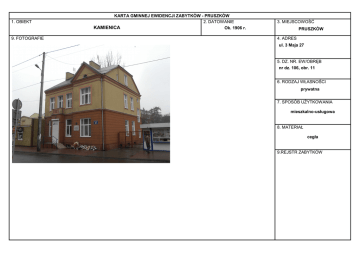 1. OBIEKT 9. FOTOGRAFIE KARTA GMINNEJ EWIDENCJI ZABYTKÓW - PRUSZKÓW 2. DATOWANIE KAMIENICA Ok. 1906 r. 3. MIEJSCOWOŚĆ PRUSZKÓW 4. ADRES ul. 3 Maja 27 5. DZ. NR. EW/OBRĘB nr dz. 106, obr. 11 6. RODZAJ WŁASNOŚCI prywatna 7. SPOSÓB UśYTKOWANIA mieszkalno-usługowa 8. MATERIAŁ cegła 9.REJSTR ZABYTKÓW 10. UWAGI INFORMACJE HISTORYCZNE Kamienica wzniesiona ok. 1906 r., w części parteru mieściła się apteka Józefa Bielawskiego (funkcja apteki przetrwała do 2003 r.). W roku 1916 mieściła się w budynku miejscowa komenda Polskiej Organizacji Wojskowej nr 1 obwodu 11 Warszawa-Prowincja okręgu 1. o czym mówi zawieszona od strony ulicy marmurowa tablica. KRÓTKA CHARAKTERYSTYKA Kamienica wolnostojąca, usytuowana w zabudowie pierzejowej. Budynek murowany, otynkowany wzniesiony w oszczędnych historyzujących formach. Posiada zwartą, dwukondygnacyjną bryłę zróŜnicowaną bocznym, szczytowo zamkniętym ryzalitem w bocznej pn. części elewacji przyulicznej oraz jednokondygnacyjnym ryzalitem zakończonym płytkim tarasem mieszczącym w części parteru wejście do punktu usługowego. Bryłę zamyka wielopołaciowa, naczółkowa od strony elewacji szczytowych forma zadaszenia kryta blachą trapezową. Partia przyziemia uzyskała pasową formę boniowania, pozostała artykulacja elewacji ogranicza się do profilowanego gzymsu wieńczącego i kordonowego oraz płaskich, uszatych opasek okiennych. STAN ZACHOWANIA Dobry. BIBLIOGRAFIA M. Skwara, Historia Pruszkowa w zarysie, Pruszków 2005 AUTOR I DATA WYKONANIA KARTY EWIDENCYJNEJ: Jan Szuliński – Listopad 2009 Karta po wypełnieniu podlega ochronie na podstawie przepisów Prawa Autorskiego