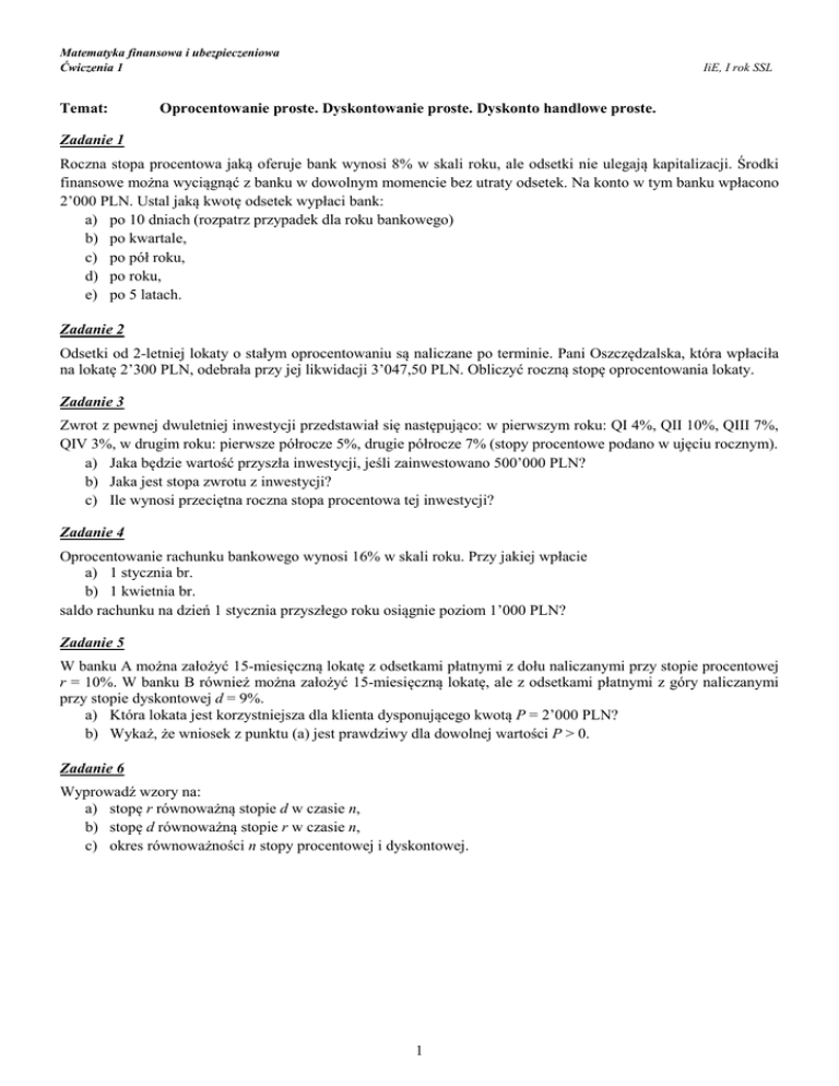Matematyka finansowa i ubezpieczeniowa Ćwiczenia 1 Temat: IiE, I rok SSL Oprocentowanie proste. Dyskontowanie proste. Dyskonto handlowe proste. Zadanie 1 Roczna stopa procentowa jaką oferuje bank wynosi 8% w skali roku, ale odsetki nie ulegają kapitalizacji. Środki finansowe można wyciągnąć z banku w dowolnym momencie bez utraty odsetek. Na konto w tym banku wpłacono 2’000 PLN. Ustal jaką kwotę odsetek wypłaci bank: a) po 10 dniach (rozpatrz przypadek dla roku bankowego) b) po kwartale, c) po pół roku, d) po roku, e) po 5 latach. Zadanie 2 Odsetki od 2-letniej lokaty o stałym oprocentowaniu są naliczane po terminie. Pani Oszczędzalska, która wpłaciła na lokatę 2’300 PLN, odebrała przy jej likwidacji 3’047,50 PLN. Obliczyć roczną stopę oprocentowania lokaty. Zadanie 3 Zwrot z pewnej dwuletniej inwestycji przedstawiał się następująco: w pierwszym roku: QI 4%, QII 10%, QIII 7%, QIV 3%, w drugim roku: pierwsze półrocze 5%, drugie półrocze 7% (stopy procentowe podano w ujęciu rocznym). a) Jaka będzie wartość przyszła inwestycji, jeśli zainwestowano 500’000 PLN? b) Jaka jest stopa zwrotu z inwestycji? c) Ile wynosi przeciętna roczna stopa procentowa tej inwestycji? Zadanie 4 Oprocentowanie rachunku bankowego wynosi 16% w skali roku. Przy jakiej wpłacie a) 1 stycznia br. b) 1 kwietnia br. saldo rachunku na dzień 1 stycznia przyszłego roku osiągnie poziom 1’000 PLN? Zadanie 5 W banku A można założyć 15-miesięczną lokatę z odsetkami płatnymi z dołu naliczanymi przy stopie procentowej r = 10%. W banku B również można założyć 15-miesięczną lokatę, ale z odsetkami płatnymi z góry naliczanymi przy stopie dyskontowej d = 9%. a) Która lokata jest korzystniejsza dla klienta dysponującego kwotą P = 2’000 PLN? b) Wykaż, że wniosek z punktu (a) jest prawdziwy dla dowolnej wartości P > 0. Zadanie 6 Wyprowadź wzory na: a) stopę r równoważną stopie d w czasie n, b) stopę d równoważną stopie r w czasie n, c) okres równoważności n stopy procentowej i dyskontowej. 1 Matematyka finansowa i ubezpieczeniowa Ćwiczenia 1 IiE, I rok SSL Zadanie 7 Uzupełnij poniższą tabelę tak, aby w każdym jej wierszu stopa dyskontowa d oraz stopa procentowa r były równoważne w czasie n . Lp. d r 1 2,5% 5% 2 12% 20/12 3 9% 4 2,5% 5 8% n 4 1,5% 13 Co powiesz o wynikach w wierszach 4 i 5? Zadanie 8 Do Pana Samochodzika zgłosiło się trzech kupców oferujących następujące warunki kupna samochodu: 1. pierwszy gotowy jest zapłacić 300’000 PLN w momencie podpisania umowy, 2. drugi proponuje dokonać wpłaty 325’000 PLN po upływie dwóch miesięcy, 3. trzeci wpłaca 150’000 PLN natychmiast i 175’000 PLN po upływie 3 miesięcy. Która z ofert jest najlepsza ze względu na: a) wartość bieżącą wpłacanej kwoty, b) wartość końcową wpłacanej kwoty na okres po 3 miesiącach od podpisania umowy? Obliczenia wykonaj zakładając, że roczna stopa procentowa wynosi 24% i kapitalizacja jest roczna. 2 Matematyka finansowa i ubezpieczeniowa Ćwiczenia 1 IiE, I rok SSL ODPOWIEDZI Zadanie 1 a) b) c) d) e) 4,44 PLN 40 PLN 80 PLN 160 PLN 800 PLN Zadanie 2 r = 16,25% Zadanie 3 a) 560'000 PLN b) r = 12% c) r = 6% Zadanie 4 a) 862,07 PLN b) 892,86 PLN Zadanie 7 Lp. d r n 1 2,5% 5% 20 2 12% 15% 20/12 3 6,62% 9% 4 4 2,5% 1,5% -26,67 5 8% -200% 13 Zadanie 8 1. PV = 300'000,00 PLN 2. PV = 312'500,00 PLN 3. PV = 315'094,34 PLN FV = 318'000,00 PLN FV = 331'500,00 PLN FV = 334'000,00 PLN 3