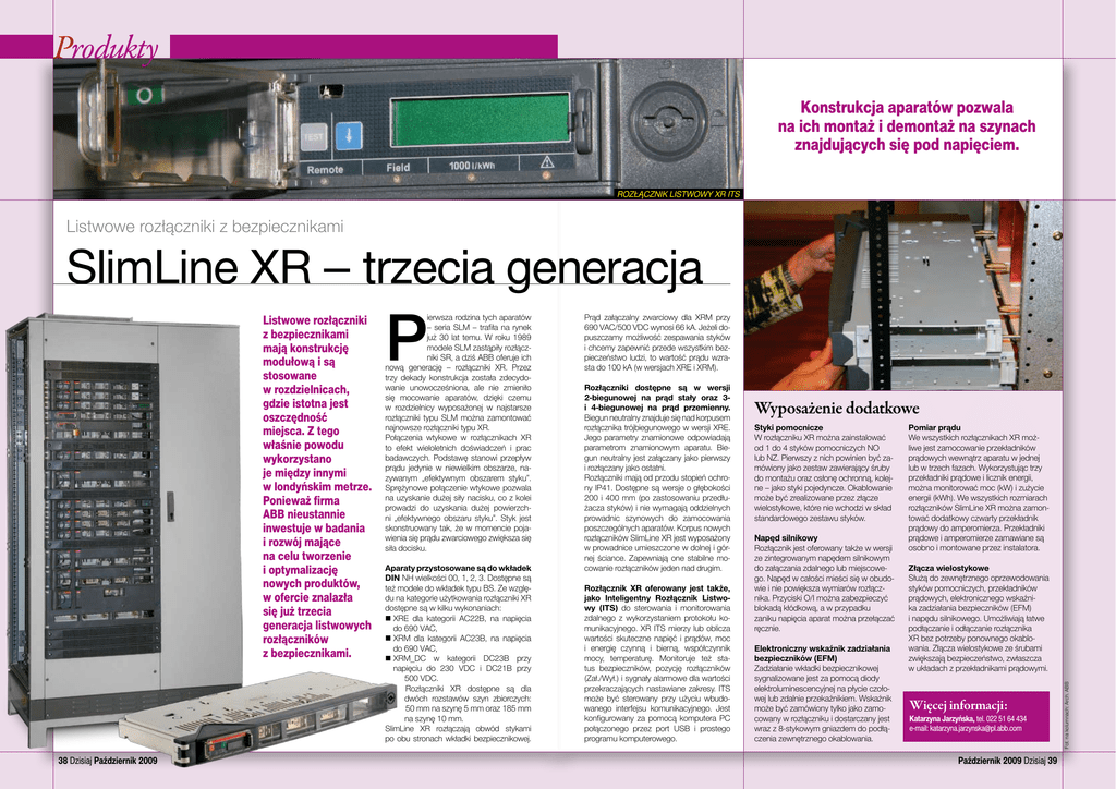 Produkty Konstrukcja aparatów pozwala na ich montaż i demontaż na szynach znajdujących się pod napięciem. rozłącznik listwowy xr its Listwowe rozłączniki z bezpiecznikami SlimLine XR – trzecia generacja 38 Dzisiaj Październik 2009 P ierwsza rodzina tych aparatów – seria SLM – trafiła na rynek już 30 lat temu. W roku 1989 modele SLM zastąpiły rozłączniki SR, a dziś ABB oferuje ich nową generację – rozłączniki XR. Przez trzy dekady konstrukcja została zdecydowanie unowocześniona, ale nie zmieniło się mocowanie aparatów, dzięki czemu w rozdzielnicy wyposażonej w najstarsze rozłączniki typu SLM można zamontować najnowsze rozłączniki typu XR. Połączenia wtykowe w rozłącznikach XR to efekt wieloletnich doświadczeń i prac badawczych. Podstawę stanowi przepływ prądu jedynie w niewielkim obszarze, nazywanym „efektywnym obszarem styku”. Sprężynowe połączenie wtykowe pozwala na uzyskanie dużej siły nacisku, co z kolei prowadzi do uzyskania dużej powierzchni „efektywnego obszaru styku”. Styk jest skonstruowany tak, że w momencie pojawienia się prądu zwarciowego zwiększa się siła docisku. Aparaty przystosowane są do wkładek DIN NH wielkości 00, 1, 2, 3. Dostępne są też modele do wkładek typu BS. Ze względu na kategorie użytkowania rozłączniki XR dostępne są w kilku wykonaniach: n XRE dla kategorii AC22B, na napięcia do 690 VAC, n XRM dla kategorii AC23B, na napięcia do 690 VAC, n XRM_DC w kategorii DC23B przy napięciu do 230 VDC i DC21B przy 500 VDC. Rozłączniki XR dostępne są dla dwóch rozstawów szyn zbiorczych: 50 mm na szynę 5 mm oraz 185 mm na szynę 10 mm. SlimLine XR rozłączają obwód stykami po obu stronach wkładki bezpiecznikowej. Prąd załączalny zwarciowy dla XRM przy 690 VAC/500 VDC wynosi 66 kA. Jeżeli dopuszczamy możliwość zespawania styków i chcemy zapewnić przede wszystkim bezpieczeństwo ludzi, to wartość prądu wzrasta do 100 kA (w wersjach XRE i XRM). Rozłączniki dostępne są w wersji 2-biegunowej na prąd stały oraz 3i 4-biegunowej na prąd przemienny. Biegun neutralny znajduje się nad korpusem rozłącznika trójbiegunowego w wersji XRE. Jego parametry znamionowe odpowiadają parametrom znamionowym aparatu. Biegun neutralny jest załączany jako pierwszy i rozłączany jako ostatni. Rozłączniki mają od przodu stopień ochrony IP41. Dostępne są wersje o głębokości 200 i 400 mm (po zastosowaniu przedłużacza styków) i nie wymagają oddzielnych prowadnic szynowych do zamocowania poszczególnych aparatów. Korpus nowych rozłączników SlimLine XR jest wyposażony w prowadnice umieszczone w dolnej i górnej ściance. Zapewniają one stabilne mocowanie rozłączników jeden nad drugim. Rozłącznik XR oferowany jest także, jako Inteligentny Rozłącznik Listwowy (ITS) do sterowania i monitorowania zdalnego z wykorzystaniem protokołu komunikacyjnego. XR ITS mierzy lub oblicza wartości skuteczne napięć i prądów, moc i energię czynną i bierną, współczynnik mocy, temperaturę. Monitoruje też status bezpieczników, pozycję rozłączników (Zał./Wył.) i sygnały alarmowe dla wartości przekraczających nastawiane zakresy. ITS może być sterowany przy użyciu wbudowanego interfejsu komunikacyjnego. Jest konfigurowany za pomocą komputera PC połączonego przez port USB i prostego programu komputerowego. Wyposażenie dodatkowe Styki pomocnicze W rozłączniku XR można zainstalować od 1 do 4 styków pomocniczych NO lub NZ. Pierwszy z nich powinien być zamówiony jako zestaw zawierający śruby do montażu oraz osłonę ochronną, kolejne – jako styki pojedyncze. Okablowanie może być zrealizowane przez złącze wielostykowe, które nie wchodzi w skład standardowego zestawu styków. Napęd silnikowy Rozłącznik jest oferowany także w wersji ze zintegrowanym napędem silnikowym do załączania zdalnego lub miejscowego. Napęd w całości mieści się w obudowie i nie powiększa wymiarów rozłącznika. Przyciski O/I można zabezpieczyć blokadą kłódkową, a w przypadku zaniku napięcia aparat można przełączać ręcznie. Elektroniczny wskaźnik zadziałania bezpieczników (EFM) Zadziałanie wkładki bezpiecznikowej sygnalizowane jest za pomocą diody elektroluminescencyjnej na płycie czołowej lub zdalnie przekaźnikiem. Wskaźnik może być zamówiony tylko jako zamocowany w rozłączniku i dostarczany jest wraz z 8-stykowym gniazdem do podłączenia zewnętrznego okablowania. Pomiar prądu We wszystkich rozłącznikach XR możliwe jest zamocowanie przekładników prądowych wewnątrz aparatu w jednej lub w trzech fazach. Wykorzystując trzy przekładniki prądowe i licznik energii, można monitorować moc (kW) i zużycie energii (kWh). We wszystkich rozmiarach rozłączników SlimLine XR można zamontować dodatkowy czwarty przekładnik prądowy do amperomierza. Przekładniki prądowe i amperomierze zamawiane są osobno i montowane przez instalatora. Złącza wielostykowe Służą do zewnętrznego oprzewodowania styków pomocniczych, przekładników prądowych, elektronicznego wskaźnika zadziałania bezpieczników (EFM) i napędu silnikowego. Umożliwiają łatwe podłączanie i odłączanie rozłącznika XR bez potrzeby ponownego okablowania. Złącza wielostykowe ze śrubami zwiększają bezpieczeństwo, zwłaszcza w układach z przekładnikami prądowymi. Więcej informacji: Katarzyna Jarzyńska, tel. 022 51 64 434 e-mail: [email protected] Październik 2009 Dzisiaj 39 Fot. na kolumnach: Arch. ABB Listwowe rozłączniki z bezpiecznikami mają konstrukcję modułową i są stosowane w rozdzielnicach, gdzie istotna jest oszczędność miejsca. Z tego właśnie powodu wykorzystano je między innymi w londyńskim metrze. Ponieważ firma ABB nieustannie inwestuje w badania i rozwój mające na celu tworzenie i optymalizację nowych produktów, w ofercie znalazła się już trzecia generacja listwowych rozłączników z bezpiecznikami.