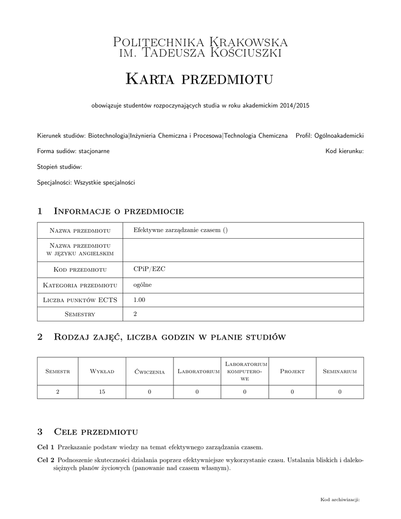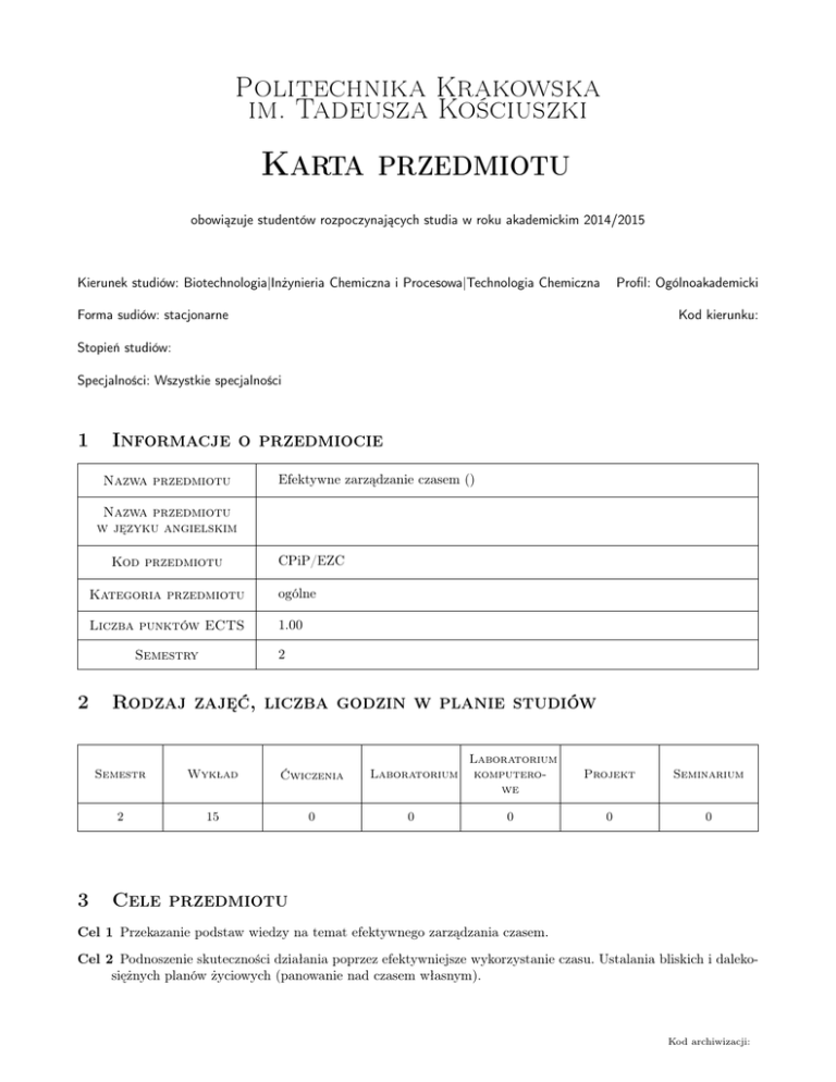 Politechnika Krakowska im. Tadeusza Kościuszki Karta przedmiotu obowiązuje studentów rozpoczynających studia w roku akademickim 2014/2015 Kierunek studiów: Biotechnologia|Inżynieria Chemiczna i Procesowa|Technologia Chemiczna Profil: Ogólnoakademicki Forma sudiów: stacjonarne Kod kierunku: Stopień studiów: Specjalności: Wszystkie specjalności 1 Informacje o przedmiocie Nazwa przedmiotu Efektywne zarządzanie czasem () Nazwa przedmiotu w języku angielskim Kod przedmiotu Kategoria przedmiotu ogólne Liczba punktów ECTS 1.00 2 Semestry 2 3 CPiP/EZC Rodzaj zajęć, liczba godzin w planie studiów Semestr Wykład Ćwiczenia Laboratorium Laboratorium komputerowe Projekt Seminarium 2 15 0 0 0 0 0 Cele przedmiotu Cel 1 Przekazanie podstaw wiedzy na temat efektywnego zarządzania czasem. Cel 2 Podnoszenie skuteczności działania poprzez efektywniejsze wykorzystanie czasu. Ustalania bliskich i dalekosiężnych planów życiowych (panowanie nad czasem własnym). Kod archiwizacji: Politechnika Krakowska im. Tadeusza Kościuszki 4 Wymagania wstępne w zakresie wiedzy, umiejętności i innych kompetencji 1 brak wymagań 5 Efekty kształcenia EK1 Umiejętności Kształtowanie umiejętności planowania i gospodarowania czasem EK2 Umiejętności Potrafi formułować cele (strategiczne, taktyczne, operacyjne) EK3 Umiejętności Posiada nawyk planowania (na piśmie) i organizowania (dnia, tygodnia, miesiąca, itp.) EK4 Wiedza Zna nomenklature związaną z zarządzaniem czasem 6 Treści programowe Wykład 7 Lp Tematyka zajęć Opis szczegółowy bloków tematycznych W1 Obszary zarządzania czasem, ile kosztuje twój czas, rodzaje celów ze względu na zasięg czasowy. Wyznaczanie priorytetów, lista zadań, typy zadań i ich grupowanie, określanie porządku wykonywanych zadań ćwiczenia 3 W2 Czynniki zewnętrzne (społeczne, socjologiczne) i wewnętrzne (osobowościowe i reakcje emocjonalne) i ich znaczenie dla zarządzania czasem ich szczegółowa analiza i znaczenie dla dalszego rozwoju. 3 W3 Obszary zarządzania czasem, ile kosztuje twój czas, rodzaje celów ze względu na zasięg czasowy. Ćwiczenia praktyczne. 3 W4 Codzienna organizacja czasu, nawyk notowania na piśmie oraz wykorzystanie metod elektronicznych, utrzymywanie równowagi między pracą a wypoczynkiem-ćwiczenia 3 W5 Kontrola pożeraczy czasu (Internet, TV, gadu-gadu i inne.) wprowadzanie zmian w gospodarowaniu czasem, delegowanie zadań. Projekt samorozwoju. 3 Narzędzia dydaktyczne N1 Ćwiczenia projektowe N2 Praca w grupach N3 Prezentacje multimedialne Strona 2/6 Liczba godzin Politechnika Krakowska im. Tadeusza Kościuszki 8 Obciążenie pracą studenta Średnia liczba godzin na zrealizowanie aktywności Forma aktywności Godziny kontaktowe z nauczycielem akademickim, w tym: Godziny wynikające z planu studiów 15 Konsultacje przedmiotowe 0 Egzaminy i zaliczenia w sesji 0 Godziny bez udziału nauczyciela akademickiego wynikające z nakładu pracy studenta, w tym: Przygotowanie się do zajęć, w tym studiowanie zalecanej literatury 0 Opracowanie wyników 0 Przygotowanie raportu, projektu, prezentacji, dyskusji 0 Sumaryczna liczba godzin dla przedmiotu wynikająca z całego nakładu pracy studenta Sumaryczna liczba punktów ECTS dla przedmiotu 9 15 1.00 Sposoby oceny Ocena formująca F1 Projekt zespołowy F2 Kolokwium Ocena podsumowująca P1 Średnia ważona ocen formujących Kryteria oceny Efekt kształcenia 1 Na ocenę 2.0 Student nie potrafi przygotować planu dnia i miesiąca. Na ocenę 3.0 Student potrafi przygotować plan dnia i miesiąca. Na ocenę 3.5 Student potrafi przygotować plan dnia i miesiąca. Zna przynajmniej jedną strategię ułatwiającą zarządzanie czasem Na ocenę 4.0 Student potrafi przygotować plan dnia i miesiąca i roku. Zna przynajmniej dwie strategię ułatwiającą zarządzanie czasem Strona 3/6 Politechnika Krakowska im. Tadeusza Kościuszki Na ocenę 4.5 Student potrafi przygotować plan dnia i miesiąca i roku. Zna przynajmniej trzy strategię ułatwiającą zarządzanie czasem oraz potrafi twórczo zagospodarowywać czas wolny Na ocenę 5.0 Student potrafi przygotować plan dnia i miesiąca i roku. Zna przynajmniej cztery strategię ułatwiającą zarządzanie czasem oraz potrafi twórczo zagospodarowywać czas wolny Efekt kształcenia 2 Na ocenę 2.0 Student nie potrafi wyodrębniać cele. Na ocenę 3.0 Student potrafi wyodrębniać cele i nazywać je. Na ocenę 3.5 Student potrafi wyodrębniać cele i nazywać je oraz porządkuje je. Na ocenę 4.0 Student potrafi wyodrębniać cele i nazywać je oraz porządkuje je.Potrafi sporządzić hierarchie celów. Na ocenę 4.5 Student potrafi wyodrębniać cele i nazywać je oraz porządkuje je.Potrafi sporządzić hierarchie celów. Rozumie różnice pomiędzy poszczególnymi typami celów. Na ocenę 5.0 Student potrafi wyodrębniać cele i nazywać je oraz porządkuje je.Potrafi sporządzić hierarchie celów. Rozumie różnice pomiędzy poszczególnymi typami celów. Potrafi zarządzać celami w zależności od sytuacji. Efekt kształcenia 3 Na ocenę 2.0 Student nie posiada nawyku planowania na piśmie i nie potrafi organizować swojego czasu. Na ocenę 3.0 Student posiada nawyku planowania na piśmie potrafi w sposób podstawowy organizować czas dnia. Na ocenę 3.5 Student posiada nawyku planowania na piśmie, potrafi w sposób podstawowy organizować czas dnia oraz rozumie znaczenie tych działań dla przyszłości. Na ocenę 4.0 Student posiada nawyku planowania na piśmie, potrafi w sposób podstawowy organizować czas dnia, miesiąca oraz rozumie znaczenie tych działań dla przyszłości. Na ocenę 4.5 Student posiada nawyku planowania na piśmie, potrafi w sposób planowy organizować czas dnia, miesiąca i roku oraz rozumie znaczenie tych działań dla przyszłości. Na ocenę 5.0 Student posiada nawyku planowania na piśmie, potrafi w sposób planowy i usystematyzowany organizować czas dnia, miesiąca i roku oraz rozumie zna