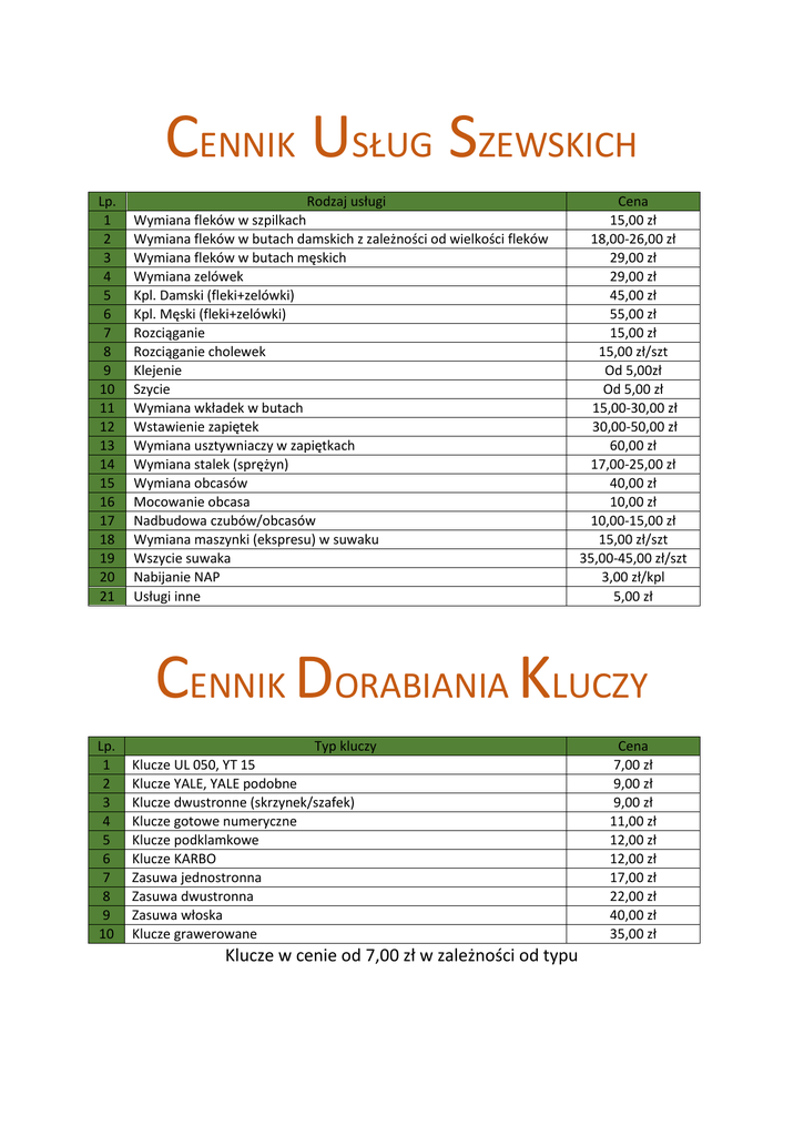 cennik usług szewskich cennik dorabiania kluczy