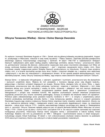 ZAMEK KRÓLEWSKI W WARSZAWIE - MUZEUM REZYDENCJA KRÓLÓW I RZECZYPOSPOLITEJ Oficyna Tarasowa (Wielka) - Górne i Dolne Stancje Dworskie Po wyborze i koronacji Stanisława Augusta w 1764 r. Zamek stał się główną królewską rezydencją (poprzednik, August III, przebywając w Warszawie, mieszkał w swej nowej rezydencji – Pałacu Saskim). Zaistniała potrzeba powiększenia dworskiego zaplecza mieszkaniowego związanego z Zamkiem. W latach 1765-1767 w nadwiślańskich Sklepach Dawnych nadbudowano jedno piętro według projektu nadwornego architekta Jakuba Fontany i przeznaczono obiekt na „pomieszkania” (stancje) dla dworzan. Jednocześnie rozpoczęto duże prace inżynierskie odsuwające nurt Wisły od skarpy zamkowej (budowa dwóch ostróg brzegowych – „tam” i stopniowe zasypywanie terenu między nimi). Stare trzyizbowe zespoły magazynowe parteru Sklepów Dawnych przekształcono na mieszkania. Przekuto nowe przejścia między nimi, a w ścianie wschodniej wycięto duże okna. Każde z mieszkań składało się z wspólnej sieni wejściowej i połączonych z nią dwu izb mieszkalnych z okratowanymi oknami. W ten sposób powstał dwukondygnacyjny, kryty dachówką budynek, zwany Oficyną Tarasową lub Wielką. Jego wnętrza zwano dworskimi Stancjami Górnymi i Dolnymi. Stancje Górne – w większości kilkupokojowe, z salonami, sypialniami i kuchniami, przeznaczone były dla dostojników i wyższych urzędników dworu. Wejścia do nich prowadziły z korytarza idącego przez całą długość budynku, połączonego z Zamkiem schodami biegnącymi po skarpie. Stancje Dolne, dostępne tylko od strony Wisły, z reguły jednoizbowe, przeznaczone były dla służby pokojowej, kuchennej i stajennej z rodzinami. Większość z nich miała drewniane alkowy przy ścianie zachodniej z wnęką na łóżko. Antresole i „półpiętrza” nad nimi tworzyły dodatkową przestrzeń użytkową. Ciepło i możliwość przygotowania posiłków dawały piece z paleniskami („czeluściami”) obsługiwanymi z przejść oraz niewielkie kominki. We wspólnie użytkowanych sieniach drewniane przepierzenia wygradzały przestrzeń przy ścianie zachodniej (półokrągłej), służącą za składziki dla lokatorów dwóch izb sąsiednich. Pierwsze piętro zdewastowanego przez powodzie budynku rozebrano w 1817 r. w związku z projektowaną (Jakub Kubicki) przebudową wschodniego skrzydła Zamku i nową kompozycją ogrodów. Jeszcze w czasach panowania Stanisława Augusta jego wnętrza (zwłaszcza Stancje Dolne) stopniowo traciły charakter siedzib dworskich. Złożyły się na to: nadrzeczne położenie (wilgoć i niedogrzanie wnętrz) oraz pozyskanie dogodniejszych miejsc na mieszkania dworskie – zakup przez króla po 1772 r. budynku warszawskiego kolegium jezuickiego przy dawnej ul. Świętojańskiej (dziś ul. Jezuicka). Oficyna Tarasowa najlepiej widoczna jest na obrazie Bernarda Bellotta Widok Warszawy od strony Pragi z 1770 r. Znane są też jej plany z końca XVIII i początków XIX w. Do naszych czasów zachowała się częściowo kondygnacja przyziemia, mieszcząca Stancje Dolne zasypane ziemią i pozostawione w trakcie budowy Arkad Kubickiego. Badania nad nimi są prowadzone od 1994 r. Odkopane i wyremontowane weszły w skład recepcyjnokulturalnego zespołu Arkad Kubickiego. W dwóch z nich zrekonstruowano służbowe wnętrza dworskie na podstawie XVIII-wiecznych inwentarzy Zamku oraz odkrytych w trakcie badań pozostałości materialnych. Oprac. Marek Wrede rys.1. Oficyna Tarasowa i Zamek Królewski – fragment Widoku Warszawy od strony Pragi Canaletto z 1770 r.; wł. Zamek Królewski w Warszawie. Fot. A. Ring Bernarda Bellotta zw. rys.2. Rzut przyziemia Oficyny Tarasowej, rysunek dokumentacyjny Jana Christiana Kamsetzera z 1784 r.; wł. Gabinet Rycin BUW rys.3. Rzut przyziemia Oficyny Tarasowej (tzw. Stancje Dolne) – fragment środkowy z odrestaurowanymi Stancjami 1314 (sień i izba), rezerwatem architektonicznym (pierwotnie sień-stancja 15), „kątem na drwa wedle kanału” i kanałem odpływowym; wł. Gabinet Rycin BUW Zamek Królewski w Warszawie - Muzeum. Rezydencja Królów i Rzeczypospolitej www.zamek-krolewski.pl