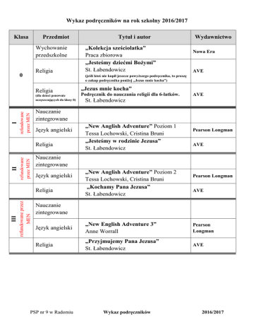 Wykaz podręczników na rok szkolny 2016/2017 Klasa Przedmiot Wychowanie przedszkolne Religia 0 refundowane przez MEN I (dla dzieci ponownie uczęszczających do klasy 0) Nowa Era AVE Język angielski refundowane przez MEN Podręcznik do nauczania religii dla 6-latków. AVE St. Łabendowicz „New Anglish Adventure” Poziom 1 Tessa Lochowski, Cristina Bruni „Jesteśmy w rodzinie Jezusa” St. Łabendowicz Pearson Longman AVE Nauczanie zintegrowane Język angielski Religia refundowane przez MEN „Jezus mnie kocha” Nauczanie zintegrowane Religia II „Kolekcja sześciolatka” Praca zbiorowa „Jesteśmy dziećmi BoŜymi” St. Łabendowicz Wydawnictwo (jeśli ktoś nie kupił jeszcze powyŜszego podręcznika, to proszę o zakup podręcznika poniŜej „Jezus mnie kocha”) Religia III Tytuł i autor „New Anglish Adventure” Poziom 2 Tessa Lochowski, Cristina Bruni „Kochamy Pana Jezusa” St. Łabendowicz Pearson Longman AVE Nauczanie zintegrowane Język angielski „New English Adventure 3” Anne Worrall Pearson Longman Religia „Przyjmujemy Pana Jezusa” St. Łabendowicz AVE PSP nr 9 w Radomiu Wykaz podręczników 2016/2017