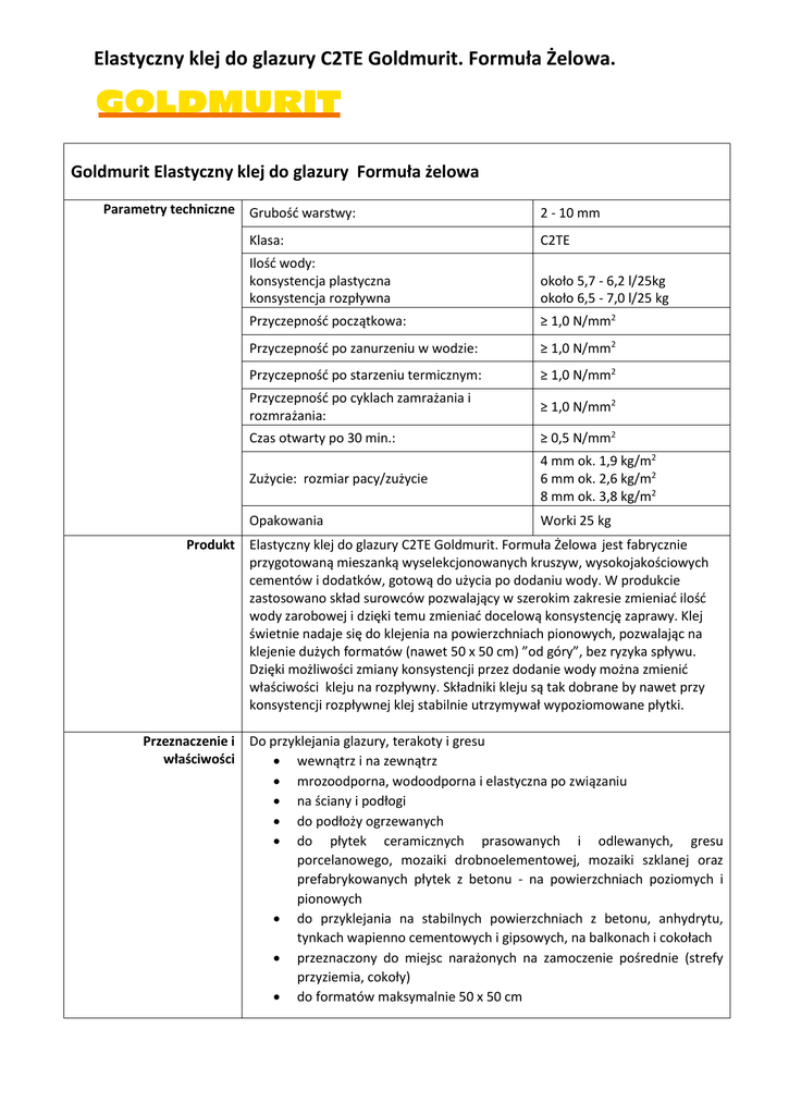 Elastyczny klej do glazury C2TE Goldmurit. Formuła Żelowa. Goldmurit Elastyczny klej do glazury Formuła żelowa Parametry techniczne Grubość warstwy: 2 - 10 mm Klasa: C2TE Ilość wody: konsystencja plastyczna konsystencja rozpływna około 5,7 - 6,2 l/25kg około 6,5 - 7,0 l/25 kg Przyczepność początkowa: ≥ 1,0 N/mm2 Przyczepność po zanurzeniu w wodzie: ≥ 1,0 N/mm2 Przyczepność po starzeniu termicznym: ≥ 1,0 N/mm2 Przyczepność po cyklach zamrażania i rozmrażania: ≥ 1,0 N/mm2 Czas otwarty po 30 min.: ≥ 0,5 N/mm2 Zużycie: rozmiar pacy/zużycie 4 mm ok. 1,9 kg/m2 6 mm ok. 2,6 kg/m2 8 mm ok. 3,8 kg/m2 Opakowania Worki 25 kg Produkt Elastyczny klej do glazury C2TE Goldmurit. Formuła Żelowa jest fabrycznie przygotowaną mieszanką wyselekcjonowanych kruszyw, wysokojakościowych cementów i dodatków, gotową do użycia po dodaniu wody. W produkcie zastosowano skład surowców pozwalający w szerokim zakresie zmieniać ilość wody zarobowej i dzięki temu zmieniać docelową konsystencję zaprawy. Klej świetnie nadaje się do klejenia na powierzchniach pionowych, pozwalając na klejenie dużych formatów (nawet 50 x 50 cm) ”od góry”, bez ryzyka spływu. Dzięki możliwości zmiany konsystencji przez dodanie wody można zmienić właściwości kleju na rozpływny. Składniki kleju są tak dobrane by nawet przy konsystencji rozpływnej klej stabilnie utrzymywał wypoziomowane płytki. Przeznaczenie i Do przyklejania glazury, terakoty i gresu właściwości wewnątrz i na zewnątrz mrozoodporna, wodoodporna i elastyczna po związaniu na ściany i podłogi do podłoży ogrzewanych do płytek ceramicznych prasowanych i odlewanych, gresu porcelanowego, mozaiki drobnoelementowej, mozaiki szklanej oraz prefabrykowanych płytek z betonu - na powierzchniach poziomych i pionowych do przyklejania na stabilnych powierzchniach z betonu, anhydrytu, tynkach wapienno cementowych i gipsowych, na balkonach i cokołach przeznaczony do miejsc narażonych na zamoczenie pośrednie (strefy przyziemia, cokoły) do formatów maksymalnie 50 x 50 cm Elastyczny klej do glazury C2TE Goldmurit. Formuła Żelowa. Podłoże Podłoże musi być nośne, suche, czyste, wolne od kurzu, nie przemarznięte i wolne od resztek środków antyadhezyjnych. Stare powłoki malarskie, oleje, tłuszcze i inne resztki osłabiające przyczepność muszą zostać usunięte. Podłoża gipsowe i anhydrytowe zagruntować gruntem uniwersalnym Goldmurit. W przypadku podłoży silnie pylących należy je zagruntować wodnym gruntem głęboko penetrującym Goldmurit. Wilgotność podłoża nie może przekraczać 3 % CM dla podłoży cementowych, 0,5 % CM dla podłoży anhydrytowych i dla tynków gipsowych nie więcej niż 1 % CM. Obróbka Zawartość worka rozrobić z odpowiednią ilością czystej wody (zgodnie z zaleceniami) za pomocą mieszadła wolnoobrotowego, aż do uzyskania jednakowej konsystencji wolnej od grudek. Po ok. 5 min. należy ponownie krótko zamieszać uzyskaną masę. Klej powinien uzyskać żelowatą konsystencję. Docelową konsystencję, dopasowaną do upodobań, można uzyskać odpowiednio zmieniając ilość wody. Z naszego doświadczenia wynika iż odpowiednia ilość do klejenia okładzin ściennych to około 6,0 L/25kg. Tak przygotowana zaprawa jest zdatna do użycia przez ok. trzy godziny. W przypadku częściowego związania zaprawy niedopuszczalne jest ponowne jej rozrabianie wodą. Przygotowana zaprawa nie powinna być również mieszana z wodą czy suchą zaprawą w celu zmiany konsystencji. Zaprawę należy nakładać pacą zębatą o odpowiednim rozmiarze dostosowanym do gabarytów płytek. Nie należy nakładać kleju na powierzchnie większą niż 1,5 m2. Płytki należy układać przed rozpoczęciem procesu tworzenia „naskórka”, tzn. przed upływem max. 30 min od nałożenia kleju. Ułożoną glazurę lub terakotę docisnąć mocno do podłoża tak, aby cała powierzchnia płytki pokryta była klejem. Spoiny należy oczyścić z resztek kleju zanim ten stwardnieje. Próby usunięcia związanego kleju mogą doprowadzić do uszkodzenia powierzchni glazury. Uwaga Klej nie nadaje się do wyrównywania podłoża. W razie takiej konieczności należy użyć zaprawy wyrównawczej Goldmurit. Podczas nakładania i wiązania Elastyczny klej do glazury C2TE Goldmurit - Formuła Żelowa należy chronić go przed nadmiernym nasłonecznieniem, silnym wiatrem, mrozem i opadami deszczu. Podczas prac należy przestrzegać ogólnych reguł sztuki budowlanej. Temperatura stosowania Temperatura powietrza, podłoża jak i produktu powinna zawierać się w granicach 5-25 °C. Niższa lub wyższa temperatura od optymalnej wpływa negatywnie na właściwości produktu. Szczególnie należy chronić produkt przed przemrożeniem i bezpośrednim słońcem w pierwszych 24h po nałożeniu. Czas wysychania Płytki przyklejone Elastycznym klejem do glazury C2TE Goldmurit - Formuła Żelowa po ok. 24 godzinach można spoinować. Pełne obciążanie może nastąpić nie wcześniej niż po 14 dniach. Warunki obróbki Temperatura powietrza, podłoża jak i produktu powinna zawierać się w granicach 5-25 °C. Niższa lub wyższa temperatura od optymalnej wpływa negatywnie na właściwości produktu. Podłoże musi być nie przemarznięte, suche i zabezpieczone przed wpływem bezpośredniego działania promieni słońca, i silnego wiatru. W trakcie aplikacji i obróbki należy stosować się do ogólnych zasad sztuki budowlanej i BHP. Do zaprawy nie wolno dodawać żadnych obcych domieszek, a do rozrabiania można użyć jedynie czystej wody. Elastyczny klej do glazury C2TE Goldmurit. Formuła Żelowa. Składowanie Należy chronić przed wilgocią i przechowywać w suchym miejscu na paletach w oryginalnych opakowaniach. Otwarte opakowania należy szczelnie zamknąć. Czas składowania: 12 miesięcy w zamkniętych, oryginalnych opakowaniach, w temperaturze pow. +5°C. Data produkcji nadrukowana na etykiecie