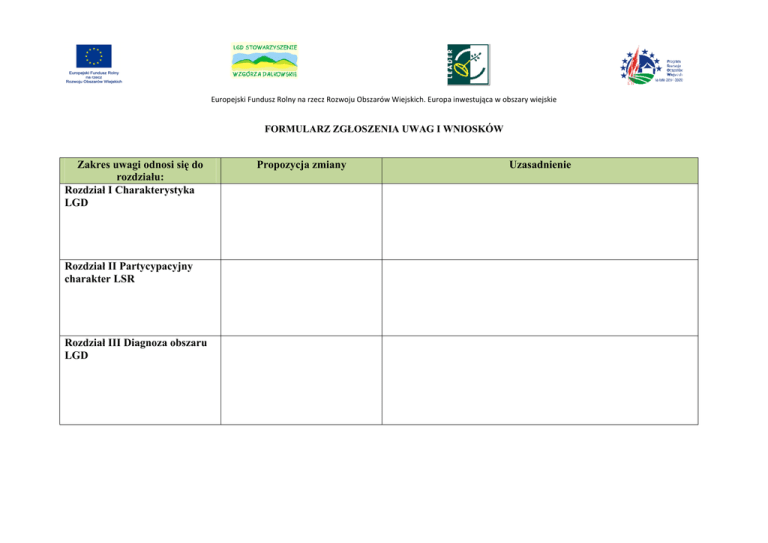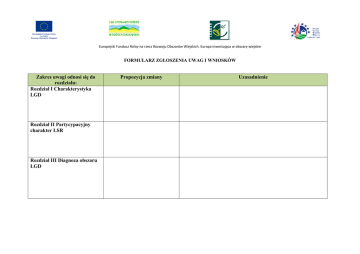 Europejski Fundusz Rolny na rzecz Rozwoju Obszarów Wiejskich. Europa inwestująca w obszary wiejskie FORMULARZ ZGŁOSZENIA UWAG I WNIOSKÓW Zakres uwagi odnosi się do rozdziału: Rozdział I Charakterystyka LGD Rozdział II Partycypacyjny charakter LSR Rozdział III Diagnoza obszaru LGD Propozycja zmiany Uzasadnienie Europejski Fundusz Rolny na rzecz Rozwoju Obszarów Wiejskich. Europa inwestująca w obszary wiejskie Rozdział IV Analiza SWOT Rozdział V Cele i wskaźniki Rozdział VI Sposób wyboru i oceny operacji oraz sposób ustanawiania kryteriów wyboru Rozdział VII Budżet LSR Europejski Fundusz Rolny na rzecz Rozwoju Obszarów Wiejskich. Europa inwestująca w obszary wiejskie Rozdział VIII Plan działania Rozdział IX Plan komunikacyjny Rozdział X Zintegrowanie Rozdział XI Zasady monitorowania i ewaluacji LSR Europejski Fundusz Rolny na rzecz Rozwoju Obszarów Wiejskich. Europa inwestująca w obszary wiejskie Rozdział XII Strategiczna ocena oddziaływania na środowisko Dane podmiotu zgłaszającego: Nazwa ....................................................................................................................................................................................................................................................... Kontakt ....................................................................................... sektor *: publiczny, społeczny, gospodarczy, mieszkaniec obszaru gmina: …………………………………. * - skreśl niewłaściwą odpowiedź Europejski Fundusz Rolny na rzecz Rozwoju Obszarów Wiejskich. Europa inwestująca w obszary wiejskie FORMULARZ ZGŁOSZENIA UWAG I WNIOSKÓW Zakres uwagi odnosi się do Kryteriów Kryteria Wyboru Operacji dla celu ogólnego 1 Kryteria Wyboru Operacji dla celu ogólnego 2 Kryteria Wyboru Grantów dla celu ogólnego 3 Propozycja zmiany Uzasadnienie Europejski Fundusz Rolny na rzecz Rozwoju Obszarów Wiejskich. Europa inwestująca w obszary wiejskie Dane podmiotu zgłaszającego: Nazwa ....................................................................................................................................................................................................................................................... Kontakt ....................................................................................... sektor *: publiczny, społeczny, gospodarczy, mieszkaniec obszaru gmina: ………………………………………. * - skreśl niewłaściwą odpowiedź