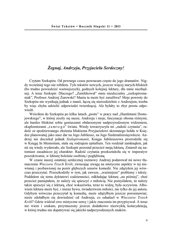 Ś w i a t T e ks t ó w • R o c z ni k S ł u p s ki 11 • 2013 Żegnaj, Andrzeju, Przyjacielu Serdeczny! Czytam Szekspira. Od pewnego czasu powracam często do jego dramatów. Nigdy wcześniej tego nie robiłem. Tyle tekstów nowych, jeszcze więcej starych-bliskich (bo trudno powiedzieć ważniejszych), godnych kolejnej lektury, dla mnie niezbędnej. A teraz Szekspir. Dlaczego? „Zainfekował” mnie nieuleczalny „szekspiromaniak”, Profesor Andrzej Żurowski? Mania ta może być zaraźliwa? Moje powroty do Szekspira nie wynikają jednak z manii, łączą się nierozdzielnie z Andrzejem, trzeba by więc chyba udzielić odpowiedzi twierdzącej. Ale byłaby to zbyt prosta odpowiedź. Wróciłem do Szekspira po kilku latach „postu” w pracy nad „Hamletami Dostojewskiego”, w której zeszły się nasze, Andrzeja i moje, fascynacje oboma różnymi, ale bardzo bliskimi sobie geniuszami obdarzonymi nadprzyrodzonym widzeniem, eksploratorami „t a m t e g o” świata. Wtedy towarzyszyła mi „radość czytania”, radość ze spodziewanego złożenia bliskiemu Przyjacielowi skromnego hołdu w Księdze planowanej jako nasz dar na Jego Jubileusz, na Jego Siedemdziesięciolecie. Andrzej nie doczekał jednak Szekspiromanii, Księga Jubileuszowa przerodziła się w Księgę In Memoriam, stała się rodzajem epitafium. Ten rozdział zamknąłem, jak mi się wtedy wydawało, ale Szekspir pozostał przecież moją lekturą. Zmienił się natomiast zasadniczo jej charakter. Radość czytania przekształciła się w imperatyw poszukiwania, w lekturę boleśnie osobistą i pogłębioną. W czasie naszej ostatniej serdecznej rozmowy Andrzej podarował mi nowe tłumaczenie Wieczoru Trzech Króli, zwracając uwagę na mistyczne aspekty w tej niewinnej i pozbawionej na pozór głębszych sensów komedii. Nie zdążyłem jej wówczas przeczytać. Przeszkodziły w tym, jak zawsze, „ważniejsze” problemy i teksty. Poddałem się temu dyktatowi codzienności, odkładając lekturę „na później”, choć przecież pamiętałem, że należy się spieszyć z miłością. Nie pomyślałem, że należy także spieszyć się z lekturą, choć wskazówka, teraz to widzę, była oczywista. Albowiem lektura może być, i nieraz bywa, świadectwem miłości, nie tylko do jej autora. Gdybym wówczas przeczytał tę komedię, może zdążyłbym jeszcze porozmawiać, może zdołałbym się dowiedzieć od Andrzeja, co odnalazł w Wieczorze Trzech Króli? Gdzie widział owe mistyczne sensy i jakie znaczenia im przypisywał. A teraz nie wiem i szukam, przymuszony jeszcze dodatkowo niezwykłą koincydencją, w której trudno nie dopatrywać się jakichś nadprzyrodzonych znaków. 9 O śmierci Andrzeja dowiedziałem się właśnie w wigilię „polskich” Trzech Króli. Odebrałem telefon, usłyszałem tę wiadomość. Nie była to wszakże epifania, ale objawiła się przede mną mądra, ciepło uśmiechnięta twarz Andrzeja i jak żywa stanęła mi przed oczami. Zabrzmiały w uszach Jego słowa sprzed kilku tygodni o ukrytych znaczeniach metafizycznych Twelfth Night. Do dziś nie potrafię i nie chcę wyzwolić się z przekonania o profetycznym charakterze tych słów, choć On pewnie czułby się nieswojo w roli proroka. Czytam więc powoli Wieczór Trzech Króli. A raczej nie tyle czytam, ile szukam. Szukam owych ukrytych metafizycznych sensów, które Andrzej znalazł wcześniej, na które zwrócił mi uwagę. Może ich poszukiwanie przyniesie jakiś rodzaj epifanii odsłaniającej przede mną choć skrawek świata „t a m”. Ten z Nim właśnie, który pomoże radzić sobie bez Niego. Mało, muszę przyznać, interesują mnie miłosne perypetie Wioli i Orsina, Oliwii i Sebastiana. Nie śmieszy, raczej dziwi w rzeczywistości boleśnie serio, może nawet trochę irytuje sztuczność qui pro quo. Trafiam co jakiś czas na jakąś niezwykłą perełkę, błysk poezji (w polskim tłumaczeniu), iluminacyjne mądrości Błazna. Na chwilę mnie to zatrzymuje, zmusza do refleksji, by jednak uznać, że nie tego szukam. Wreszcie pod koniec lektury, już zrezygnowany, znajduję. I czytam głośno, choć słaby ze mnie deklamator, jakby przekonując siebie: „zbudź wreszcie wiarę w sercu zdjętym trwogą”. I nagle myśl: może to słowa Andrzeja, może właśnie TO chce mi powiedzieć: „Zbudź wiarę...” Trwoga w sercu już się uciszyła. Już Go pożegnałem, choć ciągle i dokuczliwie Go brak. Minęło niemal dziesięć miesięcy od nagłej dla mnie, mimo świadomości ciężkiej choroby, śmierci Andrzeja. Te miesiące pozwoliły jakoś uspokoić serce. Ale czy narodziła się, czy zbudziła się wiara? W co mam wierzyć i uwierzyć? W świat – „t a m”? W Jego „t a m” obecność? Trudno nie poddać się myśli o jakiejś nadprzyrodzonej mądrości, która kierowała moim powrotem do Szekspira, która tak właśnie ukierunkowała lekturę. Nie było przypadkowe poszukiwanie przeze mnie w powieściach Dostojewskiego odpowiedzi na powtarzane przez jego bohaterów Hamletowe pytanie – „co będzie t a m”? Nie było przypadkowe, ale pozostało daremne. Ja znalazłem tylko odpowiedzi pisarza rosyjskiego. Andrzej znalazł już swoją odpowiedź. Już wie – co jest „t a m”! Ale do jakiegokolwiek „t a m” trafił, pozostaje mi „t a m” niedostępny. Żyje w mojej pamięci, w moim świecie, w moim „t u”. Wspominam nasze liczne spotkania, przypominam sobie wspólne plany i nadzieje, które nam towarzyszyły w ciągu dziesięciu lat wspólnej pracy w naszej Akademii. Andrzej przejął po mnie kierowanie Instytutem Polonistyki. Przyszedł i został Dyrektorem. Jego doświadczenie w wielu wcześniejszych miejscach pracy, Jego otwartość i „światowość”, szerokość Jego horyzontów – pozwoliły otworzyć się jeszcze bardziej naszej polonistyce. Profesor Żurowski poszerzał nasze perspektywy, zachęcał do marzeń, zmuszał do przekuwania ich w rzeczywistość. Wiele z 