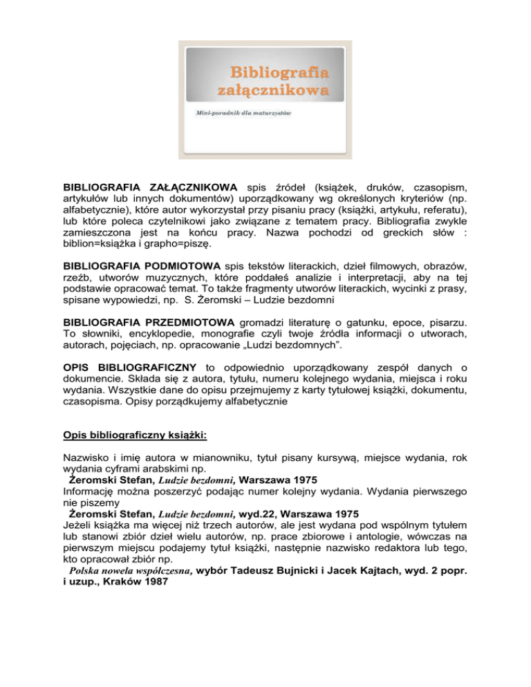 BIBLIOGRAFIA ZAŁĄCZNIKOWA spis źródeł (książek, druków, czasopism, artykułów lub innych dokumentów) uporządkowany wg określonych kryteriów (np. alfabetycznie), które autor wykorzystał przy pisaniu pracy (książki, artykułu, referatu), lub które poleca czytelnikowi jako związane z tematem pracy. Bibliografia zwykle zamieszczona jest na końcu pracy. Nazwa pochodzi od greckich słów : biblion=książka i grapho=piszę. BIBLIOGRAFIA PODMIOTOWA spis tekstów literackich, dzieł filmowych, obrazów, rzeźb, utworów muzycznych, które poddałeś analizie i interpretacji, aby na tej podstawie opracować temat. To także fragmenty utworów literackich, wycinki z prasy, spisane wypowiedzi, np. S. Żeromski – Ludzie bezdomni BIBLIOGRAFIA PRZEDMIOTOWA gromadzi literaturę o gatunku, epoce, pisarzu. To słowniki, encyklopedie, monografie czyli twoje źródła informacji o utworach, autorach, pojęciach, np. opracowanie „Ludzi bezdomnych”. OPIS BIBLIOGRAFICZNY to odpowiednio uporządkowany zespół danych o dokumencie. Składa się z autora, tytułu, numeru kolejnego wydania, miejsca i roku wydania. Wszystkie dane do opisu przejmujemy z karty tytułowej książki, dokumentu, czasopisma. Opisy porządkujemy alfabetycznie Opis bibliograficzny książki: Nazwisko i imię autora w mianowniku, tytuł pisany kursywą, miejsce wydania, rok wydania cyframi arabskimi np. Żeromski Stefan, Ludzie bezdomni, Warszawa 1975 Informację można poszerzyć podając numer kolejny wydania. Wydania pierwszego nie piszemy Żeromski Stefan, Ludzie bezdomni, wyd.22, Warszawa 1975 Jeżeli książka ma więcej niż trzech autorów, ale jest wydana pod wspólnym tytułem lub stanowi zbiór dzieł wielu autorów, np. prace zbiorowe i antologie, wówczas na pierwszym miejscu podajemy tytuł książki, następnie nazwisko redaktora lub tego, kto opracował zbiór np. Polska nowela współczesna, wybór Tadeusz Bujnicki i Jacek Kajtach, wyd. 2 popr. i uzup., Kraków 1987 Opis bibliograficzny książki wielotomowej: Nazwisko i imię autora, tytuł, ewentualnie podtytuł, wydanie, oznaczenie tomów, miejsce wydania, rok wydania np. Prus Bolesław, Lalka, wyd.19, t. 1-3, Warszawa 1953 Opis bibliograficzny czasopisma: Tytuł czasopisma wraz z podtytułem i rok wydania, numer kolejny czasopisma lub numer zeszytu, z którego korzystano np. "Polonistyka", Miesięcznik Ministerstwa Edukacji Narodowej 1998, nr 2 Opis bibliograficzny artykułu z czasopisma: Nazwisko i imię autora artykułu, tytuł artykułu, tytuł czasopisma w cudzysłowiu, podtytuł czasopisma i rok wydania, numer kolejny czasopisma lub numer zeszytu, z którego korzystano, strony zajęte przez artykuł, np. Jaworski Marcin, Różewicz – ostatni modernista, „Polonistyka”, Miesięcznik Ministerstwa Edukacji Narodowej 2005, nr 5, s. 18-24 Opis bibliograficzny fragmentu (rozdziału) książki: Opis całości książki (gdy książka jest tego samego autorstwa)- nazwisko imię autora książki, tytuł książki (pisany kursywą), wydanie, miejsce i rok wydania. Tytuł rozdziału, strony zajęte przez rozdział, np. Hutnikiewicz Artur, Od czystej formy do literatury faktu, wyd. 5, Warszawa 1988. Ekspresjonizm, s. 70-92 Opis bibliograficzny wiersza (lub opowiadania) ze zbioru jednego autora: Nazwisko i imię autora, tytuł zbioru, wydanie, miejsce i rok wydania. Tytuł wiersza, strony zajęte przez wiersz, np. Lipska Ewa, Ja, Kraków 2004. A jednak miłość, s. 41 Opis bibliograficzny fragmentu (rozdziału) książki z pracy zbiorowej Nazwisko i imię autora rozdziału, tytuł wraz z podtytułem (po dwukropku), po znaku W: tytuł pracy zbiorowej, wydanie, miejsce i rok wydania, oznaczenie tomu, w którym fragment się znajduje oraz numery stron zajętych przez rozdział np: Janion Maria, Poezja w kraju: próba syntezy, w: Obraz literatury polskiej XIX i XX wieku, wyd. 5, Kraków 1975, t.1, s.9 -145 Opis bibliograficzny wiersza z antologii wielu autorów: Nazwisko i imię autora wiersza, tytuł wiersza, po znaku W: tytuł antologii i ewentualnie podtytuł po dwukropku, imię i nazwisko osoby, która zbiór opracowała, wydanie, miejsce i rok wydania, strony zajęte przez wiersz, np. Stachura Edward, Wielki Testament, w: Od Kochanowskiego do Szymborskiej: antologia poezji polskiej ,wybór Marek Wawrzkiewicz, wyd. 2, Warszawa 1999, s. 380-381 Opis bibliograficzny hasła ze słownika (jeżeli hasło ma swego autora): Nazwisko i imię autora hasła, hasło, po znaku W: tytuł słownika lub encyklopedii, imię i nazwisko osoby, która słownik opracowała, wydanie, miejsce i rok wydania, strony zajęte przez hasło, np: Hinz Henryk, Deizm, w: Słownik literatury polskiego oświecenia, pod red. Teresy Kostkiewiczowej, wyd. 3, Wrocław 2002, s. 62-64 Opis bibliograficzny hasła ze słownika (jeżeli hasło nie ma swego autora): Hasło, po znaku W: tytuł słownika lub encyklopedii, imię i nazwisko osoby, która słownik opracowała, wydanie, miejsce i rok wydania, numer tomu (jeżeli wydawnictwo jest wielotomowe), strony zajęte przez hasło: Atom, w: Encyklopedia fizyki, wyd. 5, Warszawa 1973, t. 2, s. 85 Opis bibliograficzny recenzji: Nazwisko i imię autora recenzowanej książki, tytuł recenzowanej książki, wydanie, miejsce wydania, rok wydania, znak Rec., imię i nazwisko autora recenzji, tytuł recenzji, „tytuł czasopisma” i rok wydania, numer czasopisma, strony zajęte przez recenzję, np.: Kuczok Wojciech, Gnój, Warszawa 2003, Rec. Piotr Śliwiński, Normalni, wydrążeni, źli, „Tygodnik Powszechny” 2004, nr 32, s. 11 Opis bibliograficzny wywiadu: Nazwisko i imię osoby, która udziela wywiadu, tytuł wywiadu, znak Rozm. Przepr. Imię i nazwisko osoby prowadzącej wywiad, „tytuł czasopisma” i rok wydania, numer, numery stron zajęte przez wywiad, np.: Kuczok Wojciech, Jestem bardzo pokrzywiony, Rozm. Przepr. Barbara Pietkiewicz, „Polityka” 2004, nr 3, s. 58-59 Opis bibliograficzny strony WWW: Skórka Stanisław, Wirtu