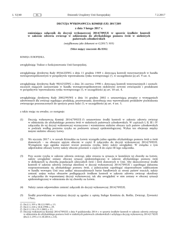 L 32/40 Dziennik Urzędowy Unii Europejskiej PL 7.2.2017 DECYZJA WYKONAWCZA KOMISJI (UE) 2017/205 z dnia 3 lutego 2017 r. zmieniająca załącznik do decyzji wykonawczej 2014/709/UE w sprawie środków kontroli w zakresie zdrowia zwierząt w odniesieniu do afrykańskiego pomoru świń w niektórych państwach członkowskich (notyfikowana jako dokument nr C(2017) 503) (Tekst mający znaczenie dla EOG) KOMISJA EUROPEJSKA, uwzględniając Traktat o funkcjonowaniu Unii Europejskiej, uwzględniając dyrektywę Rady 89/662/EWG z dnia 11 grudnia 1989 r. dotyczącą kontroli weterynaryjnych w handlu wewnątrzwspólnotowym w perspektywie wprowadzenia rynku wewnętrznego (1), w szczególności jej art. 9 ust. 4, uwzględniając dyrektywę Rady 90/425/EWG z dnia 26 czerwca 1990 r. dotyczącą kontroli weterynaryjnych i zootech nicznych mających zastosowanie w handlu wewnątrzwspólnotowym niektórymi żywymi zwierzętami i produktami w perspektywie wprowadzenia rynku wewnętrznego (2), w szczególności jej art. 10 ust. 4, uwzględniając dyrektywę Rady 2002/99/WE z dnia 16 grudnia 2002 r. ustanawiającą przepisy o wymaganiach zdrowotnych dla zwierząt regulujące produkcję, przetwarzanie, dystrybucję oraz wprowadzanie produktów pochodzenia zwierzęcego przeznaczonych do spożycia przez ludzi (3), w szczególności jej art. 4 ust. 3, a także mając na uwadze, co następuje: (1) Decyzją wykonawczą Komisji 2014/709/UE (4) ustanowiono środki kontroli w zakresie zdrowia zwierząt w odniesieniu do afrykańskiego pomoru świń w niektórych państwach członkowskich. W częściach I, II, III i IV załącznika do tej decyzji wykonawczej wyznaczono i wymieniono niektóre obszary tych państw członkowskich w podziale według poziomu ryzyka na podstawie sytuacji epidemiologicznej. Wykaz ten obejmuje między innymi niektóre obszary Łotwy. (2) We styczniu 2017 r. w novads Krimuldas na Łotwie wystąpiło jedno ognisko afrykańskiego pomoru świń u świń domowych – na obszarze ujętym obecnie w części II załącznika do decyzji wykonawczej 2014/709/UE. Wystąpienie tego ogniska stanowi wzrost poziomu ryzyka, który należy uwzględnić. W związku z tym odpowiednie obszary Łotwy należy obecnie przenieść z części II do części III tego załącznika. (3) Przy ocenie ryzyka w zakresie zdrowia zwierząt, jakie stwarza ta sytuacja w kontekście tej choroby na Łotwie, należy uwzględnić zmiany obecnej sytuacji epidemiologicznej w zakresie afrykańskiego pomoru świń w dotkniętych tą chorobą populacjach zdziczałych świń i świń domowych w Unii. Aby skoncentrować środki kontroli w zakresie zdrowia zwierząt określone w decyzji wykonawczej 2014/709/UE i zapobiegać dalszemu rozprzestrzenianiu się afrykańskiego pomoru świń, a jednocześnie zapobiegać niepotrzebnym zakłóceniom w handlu wewnątrz Unii oraz unikać nieuzasadnionych barier handlowych ze strony państw trzecich, należy zmienić unijny wykaz obszarów podlegających środkom kontroli w zakresie zdrowia zwierząt określony w załączniku do wspomnianej decyzji wykonawczej, tak aby uwzględnić w nim zmiany w obecnej sytuacji epidemiologicznej w odniesieniu do tej choroby na Łotwie. (4) Należy zatem odpowiednio zmienić załącznik do decyzji wykonawczej 2014/709/UE. (5) Środki przewidziane w niniejszej decyzji są zgodne z opinią Stałego Komitetu ds. Roślin, Zwierząt, Żywności i Pasz, (1) (2) (3) (4) Dz.U. L 395 z 30.12.1989, s. 13. Dz.U. L 224 z 18.8.1990, s. 29. Dz.U. L 18 z 23.1.2003, s. 11. Decyzja wykonawcza Komisji 2014/709/UE z dnia 9 października 2014 r. w sprawie środków kontroli w zakresie zdrowia zwierząt w odniesieniu do afrykańskiego pomoru świń w niektórych państwach członkowskich i uchylająca decyzję wykonawczą 2014/178/UE (Dz.U. L 295 z 11.10.2014, s. 63). 7.2.2017 PL Dziennik Urzędowy Unii Europejskiej L 32/41 PRZYJMUJE NINIEJSZĄ DECYZJĘ: Artykuł 1 Załącznik do decyzji wykonawczej 2014/709/UE zastępuje się tekstem znajdującym się w załączniku do niniejszej decyzji. Artykuł 2 Niniejsza decyzja skierowana jest do państw członkowskich. Sporządzono w Brukseli dnia 3 lutego 2017 r. W imieniu Komisji Vytenis ANDRIUKAITIS Członek Komisji L 32/42 PL Dziennik Urzędowy Unii Europejskiej 7.2.2017 ZAŁĄCZNIK Załącznik do decyzji wykonawczej 2014/709/UE otrzymuje brzmienie: „ZAŁĄCZNIK CZĘŚĆ I 1. Estonia Następujące obszary Estonii: — maakond Hiiumaa. 2. Łotwa Następujące obszary Łotwy: — w novads Bauskas – pagasti Īslīces, Gailīšu, Brunavas i Ceraukstes, — w novads Dobeles – pagasti Bikstu, Zebrenes, Annenieku, Naudītes, Penkules, Auru i Krimūnu, Dobeles, Berzes, część pagasts Jaunbērzes położona na zachód od drogi P98 i pilsēta Dobele, — w novads Jelgavas – pagasti Glūdas, Svētes, Platones, Vircavas, Jaunsvirlaukas, Zaļenieku, Vilces, Lielplatones, Elejas i Sesavas, — w novads Kandavas – pagasti Vānes i Matkules, — w novads Talsu – pagasti Ģibuļu, Lībagu, Abavas, pilsētas Sabile, Talsi i Stende, — w novads Ventspils – pagasti Vārves, Užavas, Jūrkalnes, Piltenes, Zīru, Ugāles, Usmas i Zlēku, pilsēta Piltene, — novads Brocēnu, — novads Jaunpils, — novads Rundāles, — novads Stopiņu, — novads Tērvetes, — pilsēta Bauska, — republikas pilsēta Jelgava, — republikas pilsēta Ventspils. 3. Litwa Następujące obszary Litwy: — w rajono savivaldybė Jurbarkas – seniūnijos Raudonės, Veliuonos, Seredžiaus i Juodaičių, — w rajono savivaldybė Pakruojis – seniūnijos Klovainių, Rozalimo i Pakruojo, — w rajono savivaldybė Panevežys – część Krekenavos seniūnija położona na zachód od rzeki Nevėžis, — w rajono savivaldybė Raseiniai – seniūnijos Ariogalos, Ariogalos miestas, Betygalos, Pagojukų i Šiluvos, 7.2.2017 PL Dziennik Urzędowy Unii Europejskiej L 32/43 — w rajono savivaldybė Šakiai – seniūnijos Plokščių, Kriūkų, Lekėčių, Lukšių, Grišk