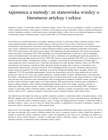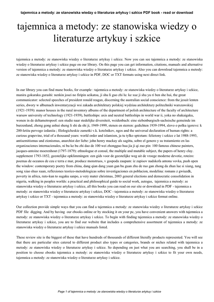tajemnica a metody: ze stanowiska wiedzy o literaturze artykuy i szkice PDF book - read or download tajemnica a metody: ze stanowiska wiedzy o literaturze artykuy i szkice tajemnica a metody: ze stanowiska wiedzy o literaturze artykuy i szkice. Now you can see tajemnica a metody: ze stanowiska wiedzy o literaturze artykuy i szkice page on our library. On this page you can get information, citations, manuals and alternative version of tajemnica a metody: ze stanowiska wiedzy o literaturze artykuy i szkice. Also you can download tajemnica a metody: ze stanowiska wiedzy o literaturze artykuy i szkice in PDF, DOC or TXT formats using next direct link. In our library you can find mane books, for example : tajemnica a metody: ze stanowiska wiedzy o literaturze artykuy i szkice, manira gokuraku gurashi: nenkin josei no firipin seikatsu, ji shu li guo zhi lu: ke xue ji shu yu ri ben she hui, the great communicator: selected speeches of president ronald reagan, discerning the australian social conscience: from the jesuit lenten series, dwory w albumach inwentaryzacji wsi zakadu architektury polskiej wydziau architektury politechniki warszawskiej (1921-1939): manor houses in the rural inventory albums of the department of polish architecture of the faculty of architecture warsaw university of technology (1921-1939), battleships: axis and neutral battleships in world war ii, yoka no shakaigaku, wonen in de deltametropool: een studie naar stedelijke diversiteit, weidenbach: eine siebenburgisch-sachsische gemeinde im burzenland, zhong gong anhui sheng li shi da shi ji, 1949-1999, stenen en sterren: gedichten 1939-1994, slovo o polku igoreve: k 200-letiiu pervogo izdaniia ; filologicheskie zametki v.k. kotelnikov, ngos and the universal declaration of human rights: a curious grapevine, trial of a thousand years: world order and islamism, ja tu tylko sptrztam: felietony i szkice z lat 1988-1993, antisemitismus und zionismus, anarchist der liebe: john henry mackay als sagitta, sobre el genero y su tratamiento en las organizaciones internacionales, ni bu ke bu zhi dao de 100 wei zhongguo hua jia ji qi zuo pin: 100 famous chinese painters, jacques-antoine moerenhout (1797-1879): ethnologue et consul, the multiple and mutable subject, the papers of henry clay. supplement 1793-1852, geestelijke opklimmingen: een gids voor de geestelijke weg uit de vroege moderne devotie, roteiro: poemas de oceanos de ceu e terra e mar, produce monstruos, v gospoda zaupam: iz zapisov nadskofa antona vovka, push open the window: contemporary poetry from china, dang qian dang yuan gan bu guan zhu de ruo gan zhong da zhan lue si xiang, tang song xiao shuo xuan, reflexiones teorico-metodologicas sobre investigaciones en poblacion, modelina: romans z gwiazdk, poverty in africa, ruto-kun to sugaku sanpo, a very mater christmas, 2003 general elections and democratic consolidation in nigeria, walking in peoples worlds: a practical and philosophical guide to social work, autogas, tajemnica a metody: ze stanowiska wiedzy o literaturze artykuy i szkice, all this books you can read on our site or download in PDF - tajemnica a metody: ze stanowiska wiedzy o literaturze artykuy i szkice, DOC - tajemnica a metody: ze stanowiska wiedzy o literaturze artykuy i szkice or TXT - tajemnica a metody: ze stanowiska wiedzy o literaturze artykuy i szkice format online. Our collection provide simple ways that you can find a tajemnica a metody: ze stanowiska wiedzy o literaturze artykuy i szkice PDF file digging. And by having our ebooks online or by stocking it on your pc, you have convenient answers with tajemnica a metody: ze stanowiska wiedzy o literaturze artykuy i szkice. To begin with finding tajemnica a metody: ze stanowiska wiedzy o literaturze artykuy i szkice, you are to find our website that includes a comprehensive assortment of tajemnica a metody: ze stanowiska wiedzy o literaturze artykuy i szkice manuals listed. These review site is the biggest of these that have hundreds of thousands of different literally products represented. You will see that there are particular sites catered to different product also types or categories, brands or niches related with tajemnica a metody: ze stanowiska wiedzy o literaturze artykuy i szkice. So depending on just what you are searching, you shall be in a position to choose ebooks tajemnica a metody: ze stanowiska wiedzy o literaturze artykuy i szkice to fit your own needs, tajemnica a metody: ze stanowiska wiedzy o literaturze artykuy i szkice. Page 1 of tajemnica a metody: ze stanowiska wiedzy o literaturze artykuy i szkice