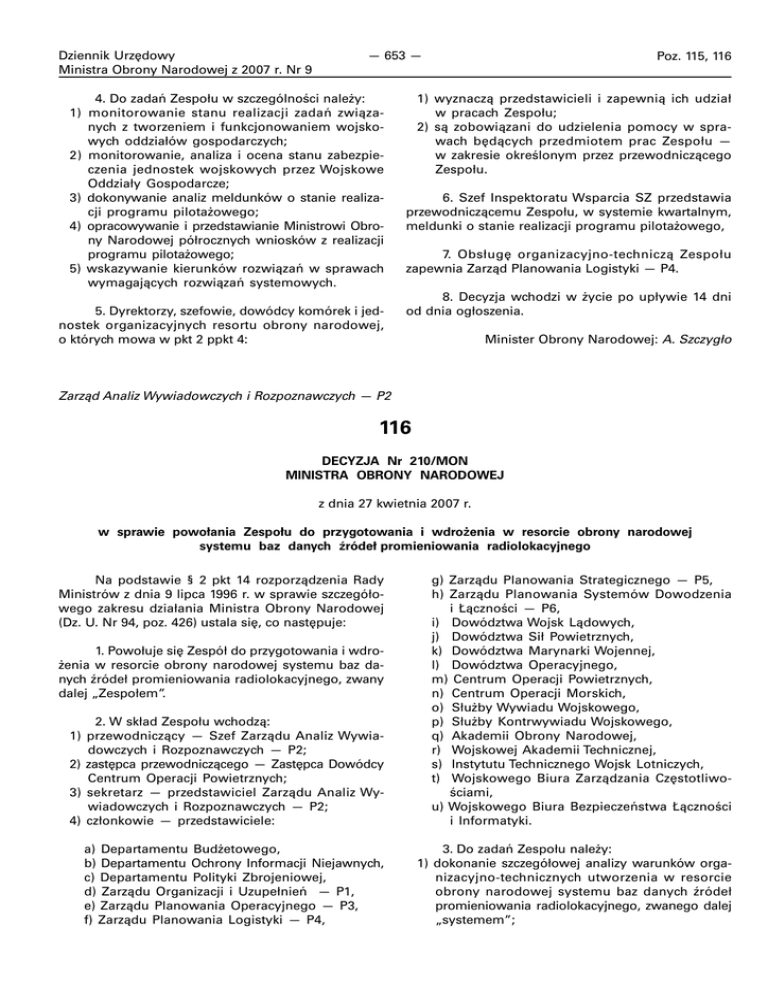 Dziennik Urzędowy Ministra Obrony Narodowej z 2007 r. Nr 9 — 653 — 4. Do zadań Zespołu w szczególności należy: 1) monitorowanie stanu realizacji zadań związanych z tworzeniem i funkcjonowaniem wojskowych oddziałów gospodarczych; 2) monitorowanie, analiza i ocena stanu zabezpieczenia jednostek wojskowych przez Wojskowe Oddziały Gospodarcze; 3) dokonywanie analiz meldunków o stanie realizacji programu pilotażowego; 4) opracowywanie i przedstawianie Ministrowi Obrony Narodowej półrocznych wniosków z realizacji programu pilotażowego; 5) wskazywanie kierunków rozwiązań w sprawach wymagających rozwiązań systemowych. 5. Dyrektorzy, szefowie, dowódcy komórek i jednostek organizacyjnych resortu obrony narodowej, o których mowa w pkt 2 ppkt 4: Poz. 115, 116 1) wyznaczą przedstawicieli i zapewnią ich udział w pracach Zespołu; 2) są zobowiązani do udzielenia pomocy w sprawach będących przedmiotem prac Zespołu — w zakresie określonym przez przewodniczącego Zespołu. 6. Szef Inspektoratu Wsparcia SZ przedstawia przewodniczącemu Zespołu, w systemie kwartalnym, meldunki o stanie realizacji programu pilotażowego, 7. Obsługę organizacyjno-techniczą Zespołu zapewnia Zarząd Planowania Logistyki — P4. 8. Decyzja wchodzi w życie po upływie 14 dni od dnia ogłoszenia. Minister Obrony Narodowej: A. Szczygło Zarząd Analiz Wywiadowczych i Rozpoznawczych — P2 116 DECYZJA Nr 210/MON MINISTRA OBRONY NARODOWEJ z dnia 27 kwietnia 2007 r. w sprawie powołania Zespołu do przygotowania i wdrożenia w resorcie obrony narodowej systemu baz danych źródeł promieniowania radiolokacyjnego Na podstawie § 2 pkt 14 rozporządzenia Rady Ministrów z dnia 9 lipca 1996 r. w sprawie szczegółowego zakresu działania Ministra Obrony Narodowej (Dz. U. Nr 94, poz. 426) ustala się, co następuje: 2. W skład Zespołu wchodzą: 1) przewodniczący — Szef Zarządu Analiz Wywiadowczych i Rozpoznawczych — P2; 2) zastępca przewodniczącego — Zastępca Dowódcy Centrum Operacji Powietrznych; 3) sekretarz — przedstawiciel Zarządu Analiz Wywiadowczych i Rozpoznawczych — P2; 4) członkowie — przedstawiciele: g) Zarządu Planowania Strategicznego — P5, h) Zarządu Planowania Systemów Dowodzenia i Łączności — P6, i) Dowództwa Wojsk Lądowych, j) Dowództwa Sił Powietrznych, k) Dowództwa Marynarki Wojennej, l) Dowództwa Operacyjnego, m) Centrum Operacji Powietrznych, n) Centrum Operacji Morskich, o) Służby Wywiadu Wojskowego, p) Służby Kontrwywiadu Wojskowego, q) Akademii Obrony Narodowej, r) Wojskowej Akademii Technicznej, s) Instytutu Technicznego Wojsk Lotniczych, t) Wojskowego Biura Zarządzania Częstotliwościami, u) Wojskowego Biura Bezpieczeństwa Łączności i Informatyki. a) Departamentu Budżetowego, b) Departamentu Ochrony Informacji Niejawnych, c) Departamentu Polityki Zbrojeniowej, d) Zarządu Organizacji i Uzupełnień — P1, e) Zarządu Planowania Operacyjnego — P3, f) Zarządu Planowania Logistyki — P4, 3. Do zadań Zespołu należy: 1) dokonanie szczegółowej analizy warunków organizacyjno-technicznych utworzenia w resorcie obrony narodowej systemu baz danych źródeł promieniowania radiolokacyjnego, zwanego dalej „systemem”; 1. Powołuje się Zespół do przygotowania i wdrożenia w resorcie obrony narodowej systemu baz danych źródeł promieniowania radiolokacyjnego, zwany dalej „Zespołem”. Dziennik Urzędowy Ministra Obrony Narodowej z 2007 r. Nr 9 — 654 — 2) ocena potrzeb i skutków osobowych oraz finansowych utworzenia systemu; 3) opracowanie organizacyjnych i formalno-prawnych warunków wdrażania i funkcjonowania systemu, w tym projektów niezbędnych dokumentów i przepisów; 4) opracowanie wymagań taktyczno-technicznych systemu; 5) wykonanie projektu koncepcyjnego zakończonego opracowaniem założeń taktyczno-technicznych (ZTT) systemu; 6) weryfikacja założeń analityczno-projektowych do modyfikacji systemu; 7) opracowanie planu wdrażania systemu w komórkach i jednostkach organizacyjnych resortu obrony narodowej oraz realizacji przedsięwzięć w nim ujętych; 8) wytypowanie jednostek organizacyjnych resortu obrony narodowej, na bazie których zostanie przeprowadzona eksploatacja próbna systemu; 9) nadzorowanie eksploatacji próbnej systemu; 10) ocena wprowadzenia systemu do eksploatacji użytkowej po zakończeniu eksploatacji próbnej; 11) realizacja przedsięwzięć związanych z wdrożeniem systemu w Siłach Zbrojnych Rzeczypospolitej Polskiej; 12) nadzorowanie dalszych prac w zakresie eksploatacji użytkowej, modyfikacji oraz doskonalenia systemu; 13) merytoryczny nadzór nad integracją systemu z innymi systemami informatycznymi wykorzystywanymi w resorcie obrony narodowej. 4. Przewodniczący Zespołu: 1) określi harmonogram pracy Zespołu; 2) organizuje i sprawuje nadzór nad pracą Zespołu; 3) może zapraszać do udziału w posiedzeniach Zespołu osoby, których wiedza będzie przydatna do realizacji zadań Zespołu oraz zasięgać nieodpłatnie opinii ekspertów w sprawach będących przedmiotem prac Zespołu, a także powoływać podzespoły do rozpatrywania spraw niewymagających obecności wszystkich członków Zespołu; 4) przedstawi Ministrowi Obrony Narodowej, za pośrednictwem Szefa Sztabu Generalnego WP, projekty niezbędnych dokumentów i przepisów w sprawie wdrożenia i funkcjonowania systemu baz danych źródeł promieniowania radiolokacyjnego; 5) przedstawia okresowe sprawozdania z działalności Zespołu Szefowi Sztabu Generalnego WP oraz Ministrowi Obrony Narodowej; 6) jest upoważniony do rozszerzenia zakresu działania Zespołu oraz odpowiedniego uzupełniania jego składu; Poz. 116 7) dokona rozwiązania Zespołu po utworzeniu etatowych komórek zapewniających sprawne funkcjonowanie systemu baz danych źródeł promieniowania radiolokacyjnego. 5. Szef Sztabu Generalnego Wojska Polskiego: 1) sprawuje nadzór merytoryczny nad pracą Zespołu; 2) określi zakres zadań dla 