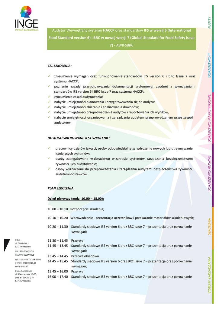 Audytor Wewnętrzny systemu HACCP oraz standardów IFS w wersji 6 (International Food Standard version 6) i BRC w nowej wersji 7 (Global Standard for Food Safety issue 7) - AWIFSBRC CEL SZKOLENIA: zrozumienie wymagań oraz funkcjonowania standardów IFS version 6 i BRC Issue 7 oraz systemu HACCP; poznanie zasady przygotowywania dokumentacji systemowej zgodnej z wymaganiami standardów IFS version 6 i BRC Issue 7 oraz systemu HACCP; zrozumienie zasad audytowania; nabycie umiejętności planowania i przygotowywania się do audytu; nabycie umiejętności zbierania i analizowania dowodów; nabycie umiejętności przeprowadzania audytów i raportowania ich wyników; nabycie umiejętności organizowania i zarządzania audytem przeprowadzanym przez zespół audytorów. DO KOGO SKIEROWANE JEST SZKOLENIE: pracownicy działów jakości, osoby odpowiedzialne za wdrożenie nowych lub utrzymywanie istniejących systemów; osoby zaangażowane w doradztwo w zakresie systemów zarządzania bezpieczeństwem żywności i ich audytowanie; osoby wyznaczone do przeprowadzania i zarządzania audytami bezpieczeństwa żywności, audytami dostawców. PLAN SZKOLENIA: Dzień pierwszy (godz. 10.00 – 18.00): 10.00 – 10.10 Rozpoczęcie szkolenia; 10.10 – 10.20 Wprowadzenie - prezentacja uczestników i przekazanie materiałów szkoleniowych; 10.20 – 11.30 Standardy sieciowe IFS version 6 oraz BRC issue 7 – prezentacja oraz porównanie wymagań; 11.30 – 11.45 Przerwa 11.45 – 13.45 Standardy sieciowe IFS version 6 oraz BRC issue 7 – prezentacja oraz porównanie wymagań; 13.45 – 14.45 Przerwa obiadowa 14.45 – 15.45 Standardy sieciowe IFS version 6 oraz BRC issue 7 – prezentacja oraz porównanie wymagań; 15.45 – 16.00 Przerwa 16.00 – 17.40 Standardy sieciowe IFS version 6 oraz BRC issue 7 – prezentacja oraz porównanie wymagań; 17.40 – 18.00 Czas na dyskusję. Treść szkolenia - dzień pierwszy: filozofia jakości (m.in. historia systemów jakości, idea oraz cele systemów); przegląd metod zapewniania bezpieczeństwa żywności w produkcji i obrocie (GMP, GHP, HACCP, ISO 22000, IFS, BRC, TFMS); podstawowe różnice pomiędzy systemami zarządzania bezpieczeństwem żywności funkcjonującymi w przemyśle spożywczym; wiadomości ogólne o standardach IFS version 6 oraz BRC Issue 7; audyt certyfikujący w IFS version 6 i BRC Issue 7, cele audytu, główne problemy; wymagania IFS version 6 oraz BRC Issue 7 – porównanie standardów, m.in.: zaangażowanie najwyższego kierownictwa, ciągłe doskonalenie i odpowiedzialność najwyższego kierownictwa (m.in. polityka i zasady organizacji, struktura organizacyjna, orientacja na klienta, przegląd zarządzania); plan bezpieczeństwa żywności oraz System Zarządzania Jakością (m.in. HACCP i Codex Alimentarius, Analiza HACCP, Zespół ds. bezpieczeństwa żywności HACCP, Opis wyrobu , Identyfikowanie zamierzonego zastosowania, wykres przebiegu procesu, weryfikacja przebiegu, zagrożenia, CCP, analiza zagrożeń, limity krytyczne, monitorowanie, działania korygujące, weryfikacja, plan HACCP, zapisy i dokumentacja, nadzór nad dokumentacją i zapisami); audyty wewnętrzne – wymagania, zakres; zakupy w IFS version 6 oraz BRC Issue 7; dokumentacja w IFS version 6 oraz BRC Issue 7 – nadzór nad dokumentacją, wymagania, wypełnianie i prowadzenie zapisów; działania korygujące i zapobiegawcze w IFS version 6 oraz BRC Issue 7; identyfikowalność w IFS version 6 oraz BRC Issue 7; postępowanie z reklamacjami; zarządzanie incydentami, wycofanie wyrobu; wymagania dotyczące zakładu w IFS version 6 oraz BRC Issue 7 (m.in. otoczenie, bezpieczeństwo, wnętrze zakładu, konstrukcja budynku, media, wyposażenie, pomieszczenia pracownicze, utrzymanie zakładu); nadzorowanie chemicznego i fizycznego zanieczyszczenia wyrobu / ryzyko zanieczyszczenia ciałami obcymi (metal, szkło, drewno); utrzymywanie porządku i higieny, czystość i dezynfekcja, gospodarka odpadami, zwalczanie szkodników; przechowywanie i transport; nadzór nad wyrobem w IFS version 6 oraz BRC Issue 7; nadzorowanie/ kontrola procesu w IFS version 6 oraz BRC Issue 7; wymagania dotyczące personelu (m.in. szkolenie, higiena osobista, badania lekarskie, odzież ochronna); wymagania specyficzne dla standardów IFS version 6 oraz BRC Issue 7. Dzień drugi (godz. 9.00 – 17.00): 09.00 – 10.00 10.00 – 10.30 10.30 – 10.45 10.45 – 11.15 11.15 – 12.45 12.45 – 13.45 13.45 – 14.45 14.45 – 15.00 15.00 – 16.00 16.00 – 16.15 16.15 – 16.45 16.45 – 17.00 Audyt wewnętrzny: wprowadzenie (terminologia, cele, cechy, powody i korzyści, rodzaje audytów) Audyt wewnętrzny wg wymagań BRC Issue 6 oraz IFS Version 7 Przerwa Norma ISO 19011: Zasady audytowania, zarządzanie programem audytów Norma ISO 19011: Zarządzanie programem audytów, działania audytowe Przerwa obiadowa Norma ISO 19011: Zarządzanie programem audytów, działania audytowe Przerwa Norma ISO 19011: Kompetencje i ocena audytora (bariery komunikacyjne, komunikacja niewerbalna) Podsumowanie szkolenia, pytania uczestników Egzamin Omówienie testu, dyskusja, zakończenie szkolenia Treść szkolenia - dzień drugi: audyt wewnętrzny w IFS version 6 i BRC issue 7 – wprowadzenie; terminologia; cele audytu; cechy audytu, powody przeprowadzania audytów oraz korzyści z ich przeprowadzania; rodzaje audytów; audyt wewnętrzny na zgodność z wymaganiami IFS oraz BRC; norma ISO 19011: Zasady audytowania – psychologia audytu; zarządzanie programem audytów; działania audytowe; kompetencje i ocena audytora (bariery komunikacyjne, komunikacja niewerbalna). planowanie i przygotowanie audytu: kryteria i zakres audytu; istotne aspekty przy tworzeniu listy pytań kontrolnych. przeprowadzenie audytu - zasady prowadzenia badania na miejscu: psychologia audytu (m.in. komunikacja podczas audytu, atmosfera audytu, rodzaje pytań); obiektywne dowody; określanie niezgodności oraz umiejętność ich wykazywania. do