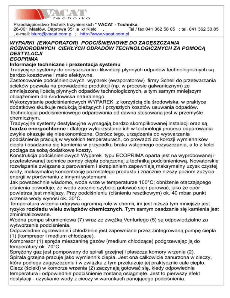 Przedsiêbiorstwo Technik In¿ynierskich " VACAT - Technika ; 26-001 Mas³ów, D¹browa 351 a k/ Kielc , Tel / fax 041 362 58 05 ; tel. 041 362 30 85 , e-mail: [email protected] ; http://www.vacat.com.pl WYPARKI (EWAPORATOR) PODCIŒNIENIOWE DO ZAGÊSZCZANIA RÓ¯NORODNYCH CIEK£YCH ODPADÓW TECHNOLOGICZNYCH ZA POMOC¥ DESTYLACJI ECOPRIMA Informacje techniczne i prezentacja systemu Tradycyjne systemy do oczyszczania i likwidacji p³ynnych odpadów technologicznych s¹ bardzo kosztowne i ma³o efektywne. Zastosowanie podciœnieniowych wyparek (ewaporatorów) firmy Schell do przetwarzania œcieków pozwala na prowadzenie produkcji (np. w procesie galwanicznym) ze zmniejszon¹ iloœci¹ p³ynnych odpadów technologicznych, a tym samym mniejszym obci¹¿eniem dla œrodowiska naturalnego. Wykorzystanie podciœnieniowych WYPAREK z korzyœci¹ dla œrodowiska, w praktyce dodatkowo skutkuje redukcj¹ bie¿¹cych i przysz³ych kosztów usuwania odpadów. Technologia podciœnieniowego odparowania od dawna stosowana jest w przemyœle chemicznym. Tradycyjne systemy destylacyjne wymagaj¹ bardzo skomplikowanej instalacji oraz s¹ bardzo energoch³onne i dlatego wykorzystanie ich w technologii procesu odparowania zwykle okazuje siê nieekonomiczne. Oprócz tego, urz¹dzenia do wytwarzania podciœnienia pracuj¹ w wysokich temperaturach, co prowadzi do korozji wymienników ciep³a i osadzania siê kamienia w przypadku braku wstêpnego oczyszczania, a to z kolei poci¹ga za sob¹ dodatkowe koszty. Konstrukcja podciœnieniowych Wyparek typu ECOPRIMA oparta jest na wypróbowanej i przetestowanej technice pompy ciep³a po³¹czonej z technik¹ podciœnieniow¹. Nowatorskie rozwi¹zania zwi¹zane z parowaniem i skraplaniem zapewniaj¹ maksymalny uzysk czystej wody, maksymaln¹ koncentracjê pozosta³ego produktu i znacznie ni¿szy poziom zu¿ycia energii w porównaniu z innymi systemami. Jak powszechnie wiadomo, woda wrze w temperaturze 100°C; obni¿enie otaczaj¹cego ciœnienia powoduje, ¿e woda zacznie szybciej gotowaæ siê i parowaæ, jako ¿e opór powietrza jest mniejszy. Przy podciœnieniu (ciœnieniu resztkowym) ok. 40 mbar, punkt wrzenia wody wynosi ok. 30°C. Temperatura wrzenia odgrywa ogromn¹ rolê w chemii, im jest ni¿sza tym mniejsze jest ryzyko rozk³adu wielu zwi¹zków chemicznych. Tym samym osadzanie siê kamienia jest zminimalizowane. Wodna pompa strumieniowa (7) wraz ze zwê¿k¹ Venturiego (5) s¹ odpowiedzialne za wytworzenie podciœnienia. Odpowiednie ogrzewanie i ch³odzenie jest zapewniane przez zintegrowan¹ pompê ciep³a (1) (kompresor i medium ch³odz¹ce). Kompresor (1) sprê¿a mieszaninê gazów (medium ch³odz¹ce) podgrzewaj¹c j¹ do temperatury ok. 70°C. Sprê¿ony gaz jest pompowany do spirali grzejnej i p³aszcza komory wrzenia (2). Spirala grzejna pracuje jako wymiennik ciep³a. Jest ona ca³kowicie zanurzona w cieczy, która podlega zagêszczeniu i w zwi¹zku z tym przekazuje jej praktycznie ca³e ciep³o. Ciecz (œcieki) w komorze wrzenia (2) zaczynaj¹ gotowaæ siê, kiedy odpowiednia temperatura i odpowiednie podciœnienie zostan¹ osi¹gniête. Jest to pierwszy efekt destylacji - uzyskanie wody z cieczy w warunkach panuj¹cego podciœnienia. 1) Wyparki (Ewaporatory) Gdy ca³e ciep³o zostanie oddane w komorze wrzenia, medium ch³odz¹ce musi byæ powtórnie och³odzone; zapewnia to wymiennik ciep³a ch³odzony powietrzem lub wod¹ (8). Po ca³kowitym sch³odzeniu, medium ch³odz¹ce przep³ywa do spirali w komorze skraplania (3) i paruje przez zawór rozprê¿ny w spirali ch³odz¹cej. Rozprê¿enie (odparowanie) medium ch³odz¹cego „generuje" zimno z powodu odwrócenia efektu sprê¿ania. Para wodna powsta³a w komorze wrzenia przesuwa siê teraz do zimnej czêœci komory skraplania (3) i skrapla siê w zetkniêciu z ch³odn¹ powierzchni¹ spirali. Ciecz jest zasysana przez zwê¿kê Venturiego (5) (cykl podciœnieniowy) z dna komory skraplania (3) i t³oczona do komory destylacji (4). Cykl podciœnieniowy odbywa siê w komorze destylacji (4) i spe³nia dwie funkcje - wytworzenia podciœnienia ok. 30-40 mbar ciœnienia szcz¹tkowego w komorze wrzenia oraz ciœnienia ok. 0,2 bar wewn¹trz komory destylacji (4), a¿eby uzyskany destylat wyp³yn¹³ bez u¿ycia dodatkowej pompy. Destylat ten powraca do obiegu albo po ostatecznym zbadaniu, mo¿e byæ skierowany do zrzutu. Poziom stê¿enia koncentratu pozostaj¹cego w komorze wrzenia jest regulowany czasem trwania procesu lub poprzez pomiar gêstoœci. Po zakoñczeniu procesu, koncentrat mo¿e byæ usuniêty z urz¹dzenia automatycznie za pomoc¹ pompy (6) lub rêcznie przez zawór albo klapê spustow¹ w pod³odze. Koncentrat mo¿e byæ powtórnie poddany procesowi lub sk³adowany na zewn¹trz. Kompresor medium ch³odz¹cego (1) pracuje w obiegu zamkniêtym i jest samosmaruj¹cy siê. ¯ywotnoœæ kompresora jest zbli¿ona do ¿ywotnoœci normalnego systemu klimatyzacji lub lodówki, a nawet wiêksza ze wzglêdu na rzadsze w³¹czanie i wy³¹czanie. Monta¿ i uruchomienie: Transport za pomoc¹ wózka wid³owego lub suwnicy. Monta¿ i uruchomienie mog¹ byæ wykonane przez s³u¿by wewn¹trzzak³adowe. Ustawienie: Wyparka mo¿e byæ ustawiona w dowolnym miejscu na pod³odze, która wytrzyma ciê¿ar urz¹dzenia. Wersja demontowalna dostêpna na zamówienie. Seria K - z zanurzonym wymiennikiem ciep³a (spirala) Modele serii K („K" oznacza „konzentrieren" - koncentrat) s¹ przeznaczone do zagêszczania cieczy w najwiêkszym mo¿liwym stopniu oraz do okreœlonej gêstoœci. Pozosta³oœci (koncentrat) jest usuwany rêcznie lub za pomoc¹ pompy sterowanej densytometrem lub zegarem. Charakterystyka: W pe³ni automatyczny, praktycznie pracuj¹cy w trybie ci¹g³ym Odparowanie i skraplanie za pomoc¹ pompy ciep³a Elementy maj¹ce kontakt z ciecz¹ wykonane z materia³u V4A (nr 1.4404) lub V2A (nr 1.4301) Konstrukcja pionowa lub pozioma Rury wykonane z PVC (standard) Okno inspekcyjne z urz¹dzeniem czyszcz¹cym