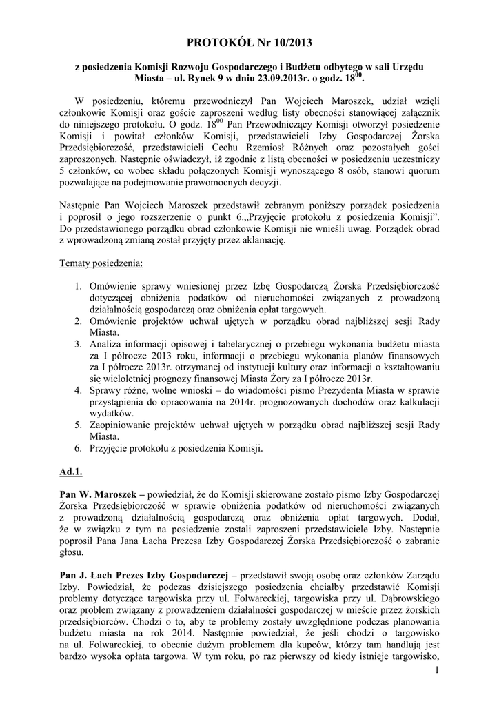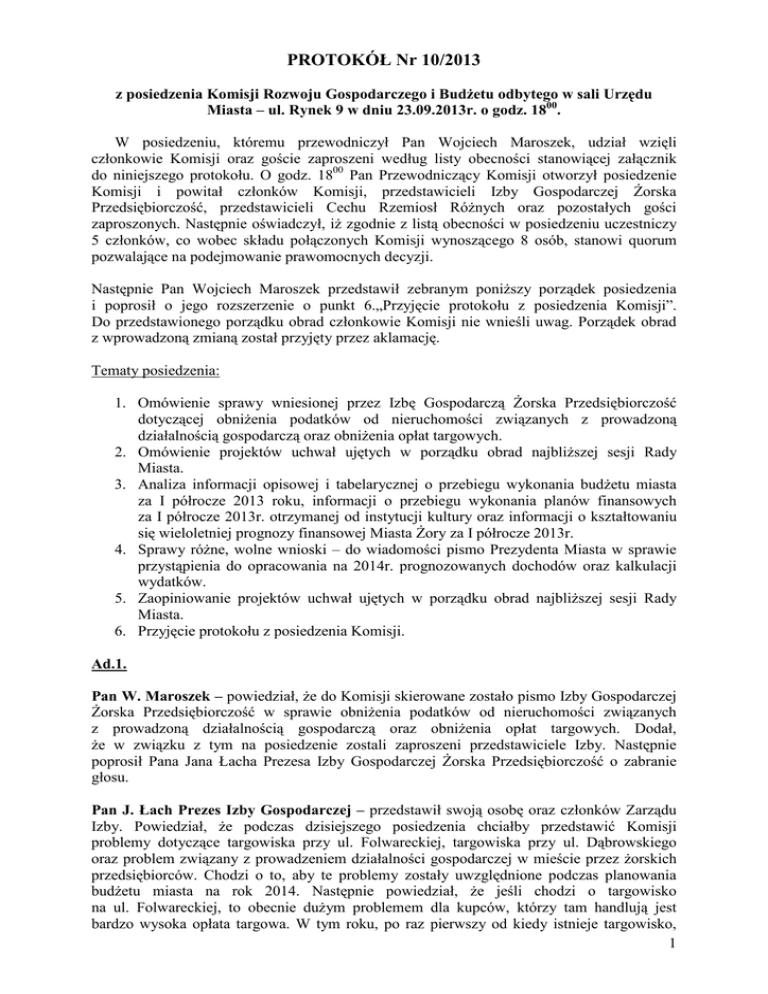 PROTOKÓŁ Nr 10/2013 z posiedzenia Komisji Rozwoju Gospodarczego i Budżetu odbytego w sali Urzędu Miasta – ul. Rynek 9 w dniu 23.09.2013r. o godz. 1800. W posiedzeniu, któremu przewodniczył Pan Wojciech Maroszek, udział wzięli członkowie Komisji oraz goście zaproszeni według listy obecności stanowiącej załącznik do niniejszego protokołu. O godz. 1800 Pan Przewodniczący Komisji otworzył posiedzenie Komisji i powitał członków Komisji, przedstawicieli Izby Gospodarczej Żorska Przedsiębiorczość, przedstawicieli Cechu Rzemiosł Różnych oraz pozostałych gości zaproszonych. Następnie oświadczył, iż zgodnie z listą obecności w posiedzeniu uczestniczy 5 członków, co wobec składu połączonych Komisji wynoszącego 8 osób, stanowi quorum pozwalające na podejmowanie prawomocnych decyzji. Następnie Pan Wojciech Maroszek przedstawił zebranym poniższy porządek posiedzenia i poprosił o jego rozszerzenie o punkt 6.„Przyjęcie protokołu z posiedzenia Komisji”. Do przedstawionego porządku obrad członkowie Komisji nie wnieśli uwag. Porządek obrad z wprowadzoną zmianą został przyjęty przez aklamację. Tematy posiedzenia: 1. Omówienie sprawy wniesionej przez Izbę Gospodarczą Żorska Przedsiębiorczość dotyczącej obniżenia podatków od nieruchomości związanych z prowadzoną działalnością gospodarczą oraz obniżenia opłat targowych. 2. Omówienie projektów uchwał ujętych w porządku obrad najbliższej sesji Rady Miasta. 3. Analiza informacji opisowej i tabelarycznej o przebiegu wykonania budżetu miasta za I półrocze 2013 roku, informacji o przebiegu wykonania planów finansowych za I półrocze 2013r. otrzymanej od instytucji kultury oraz informacji o kształtowaniu się wieloletniej prognozy finansowej Miasta Żory za I półrocze 2013r. 4. Sprawy różne, wolne wnioski – do wiadomości pismo Prezydenta Miasta w sprawie przystąpienia do opracowania na 2014r. prognozowanych dochodów oraz kalkulacji wydatków. 5. Zaopiniowanie projektów uchwał ujętych w porządku obrad najbliższej sesji Rady Miasta. 6. Przyjęcie protokołu z posiedzenia Komisji. Ad.1. Pan W. Maroszek – powiedział, że do Komisji skierowane zostało pismo Izby Gospodarczej Żorska Przedsiębiorczość w sprawie obniżenia podatków od nieruchomości związanych z prowadzoną działalnością gospodarczą oraz obniżenia opłat targowych. Dodał, że w związku z tym na posiedzenie zostali zaproszeni przedstawiciele Izby. Następnie poprosił Pana Jana Łacha Prezesa Izby Gospodarczej Żorska Przedsiębiorczość o zabranie głosu. Pan J. Łach Prezes Izby Gospodarczej – przedstawił swoją osobę oraz członków Zarządu Izby. Powiedział, że podczas dzisiejszego posiedzenia chciałby przedstawić Komisji problemy dotyczące targowiska przy ul. Folwareckiej, targowiska przy ul. Dąbrowskiego oraz problem związany z prowadzeniem działalności gospodarczej w mieście przez żorskich przedsiębiorców. Chodzi o to, aby te problemy zostały uwzględnione podczas planowania budżetu miasta na rok 2014. Następnie powiedział, że jeśli chodzi o targowisko na ul. Folwareckiej, to obecnie dużym problemem dla kupców, którzy tam handlują jest bardzo wysoka opłata targowa. W tym roku, po raz pierwszy od kiedy istnieje targowisko, 1 okazało się, że są wolne boksy. Do tej pory taka sytuacja nie miała miejsca. Zdaniem kupców opłata w wysokości ponad 63 zł za 1 m2 jest za wysoka. Z Jego informacji wynika, że za wynajem innych lokali w mieście żąda się ok. 20 – 25 zł za 1 m2. Dlatego też kupcy postulują o obniżenie tej opłaty w przyszłym roku do 30 zł. Jest to znaczna obniżka, ale dzięki temu wiele firm mogłyby przetrwać. Oprócz tego kupcy płacą za media. Miesięcznie łącznie jest to kwota ok. 600 - 700 zł. Jeśli opłata targowa pozostanie w niezmienionej wysokości, to na pewno w przyszłym roku będzie można zaobserwować dalszy odpływ kupców z targowiska. Członek Izby Gospodarczej – powiedziała, że na targowisku przy ul. Folwareckiej znajduje się 138 boksów, z czego w chwili obecnej 10 boksów jest wolnych. Natomiast na targowisku przy ul. Dąbrowskiego jest 80 boksów, z czego zajętych jest 38 boksów. Pan J. Łach Prezes Izby Gospodarczej – powiedział, że kolejnym problemem, z którym borykają się kupcy na targowisku przy ul. Folwareckiej jest wentylacja. Zimą nie da się dogrzać boksów i cierpi na tym sektor odzieżowy, ponieważ przymierzenie odzieży w zimie nie wchodzi w grę. Dlatego też kupcy postulują o przeprowadzenie modernizacji i zainstalowanie klap oddymowych. Członek Izby Gospodarczej – powiedziała, że kupcy nie są w stanie ogrzać boksów, bo całe ciepło ucieka do góry. Pan J. Łach Prezes Izby Gospodarczej – powiedział, że jest to duży problem, bo ten obiekt nie jest funkcjonalny przez cały rok. Jeśli chodzi o targowisko przy ul. Dąbrowskiego, to tam pobierana jest opłata dzienna w wysokości 12 zł oraz 168 zł/m-c opłata rezerwacyjna. Następnie poprosił Panie prowadzące działalność na targowisku przy ul. Dąbrowskiego o zabranie głosu. Przedstawicielka kupców – powiedziała, że kupcy postulują o to, aby obniżyć opłatę rezerwacyjną o połowę przy jednoczesnym zachowaniu opłaty dziennej w wysokości 12 zł. Pan J. Koper – zapytał, czy opłata dzienna dotyczy jednego stoiska? Przedstawicielka kupców – powiedziała, że tak. Dodała, że priorytetem dla kupców jest budowa prostego targowiska, które należycie spełniałoby swoją funkcję i miało określony standard. Niestety targowisko jest w bardzo złym stanie, co powoduje odpływ klientów. Nadmieniła, że podczas rozmowy z Prezydentem kupcy usłyszeli zapewnienia, że powstanie na ul. Dąbrowskiego proste i schludne targowisko, które przyciągnie z powrotem klientów. Do tego czasu ważne byłoby, aby kupcom zmniejszyć opłatę rezerwacyjną. Pan K. Dajka – powiedział, że popiera 