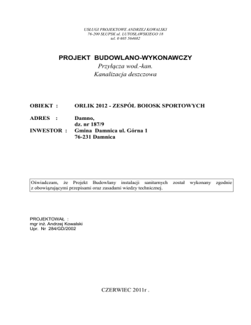 USŁUGI PROJEKTOWE ANDRZEJ KOWALSKI 76-200 SŁUPSK ul. LUTOSŁAWSKIEGO 18 tel. 0 605 564682 PROJEKT BUDOWLANO-WYKONAWCZY Przyłącza wod.-kan. Kanalizacja deszczowa OBIEKT : ORLIK 2012 - ZESPÓŁ BOIOSK SPORTOWYCH ADRES : Damno, dz. nr 187/9 Gmina Damnica ul. Górna 1 76-231 Damnica INWESTOR : Oświadczam, że Projekt Budowlany instalacji sanitarnych z obowiązującymi przepisami oraz zasadami wiedzy technicznej. PROJEKTOWAŁ : mgr inż. Andrzej Kowalski Upr. Nr 284/GD/2002 CZERWIEC 2011r . został wykonany zgodnie Spis treści 1 Przedmiot , cel i zakres opracowania. .......................................................................... 3 2 Podstawa opracowania . ................................................................................................. 3 3 Przyłącze wodociągowe.................................................................................................... 3 4 Kanalizacji sanitarna. ...................................................................................................... 3 5 Kanalizacja deszczowa ..................................................................................................... 4 6 Informacja o bezpieczeństwie i ochronie zdrowia.......................................................... 6 SPIS RYSUNKÓW Rys. 1 - Plan sytuacyjno-wysokościowy Rys. 2 - Rozwinięcie przyłącza wodociągowego Rys. 3 - Rozwinięcie przyłącza kanalizacji sanitarnej Rys. 4 - Rzut układu drenaży wraz z zagospodarowaniem wód deszczowych Rys. 5 - Rozwinięcie kanalizacji deszczowej 1:100/200 Rys. 6 – Studnia wodomierzowa - skala 1:500 - skala 1:100 - skala 1:100 - skala 1:100 - skala - skala 1:20 Opis techniczny do Projektu Budowlanego 1 Przedmiot , cel i zakres opracowania. Przedmiotem opracowania jest doprowadzenie wody, odprowadzenie ścieków sanitarnych, odprowadzenie wód opadowych dla projektowanego zespołu boisk sportowych ORLIK 2012 z modułowym zapleczem w miejscowości Damno dz. nr 187/9 2 Podstawa opracowania . - 3 zlecenie inwestora mapa sytuacyjno – wysokościowa skala 1 : 500 warunki techniczne obowiązujące normy i przepisy Przyłącze wodociągowe. Przyłącze wodociągowe zaprojektowano z przewodu PE 40x2.4, PN 10 SDR17. Włączenie do sieci wodociągowej PVC 90 za pomocą nawiertki z obejmą do rur PVC, poprzez zasuwę DN 32 . Zasuwę wyposażyć w pokrętło, obudowę teleskopową, skrzynkę sztywną żeliwną, model „ciężki” - obetonować. Pomiar zużycia wody wodomierzem JS 2.5 dn20 umieszczonym w studzience wodomierzowej wykonanej z kręgów bet.m, h=1.8m, z włazem typu ciężkiego. Za wodomierzem zamontować zawór antyskażeniowy EA dn25, oraz zawór z końcówką spustową. Podejścia do kontenera szatniowego wykonać z rur PE x2.0, PN 10 SDR17, oraz rur preizolowanych Dzew/Dwew 75/PE32 (odcinek pionowy - wejście do modułu przez podłogę) Przewody prowadzić w wykopie na 10 cm podsypce z piasku, według załączonych rysunków. Nad przewodem umieścić taśmę ostrzegawczą. Obsypka z piasku h=20cm. Przyłącze należy poddać płukaniu i przeprowadzić próbę szczelności na ciśnienie 1.0 MPa oraz wykonać dezynfekcję. Przy pozytywnej próbie ciśnienia należy sporządzić protokół próby w obecności użytkownika, właściciela i inspektora nadzoru. Przed zasypaniem przyłącza wykonać inwentaryzację geodezyjną i zgłosić do odbioru w ZGK (przed zamontowaniem zestawu wodomierzowego). Pod drogą wykop zasypać warstwowo (max. grubość warstwy 0,2 m) gruntem niewysadzinowym tj. piaskiem i zagęścić mechanicznie w celu uzyskania wskaźnika zagęszczenia 1,0. Wykop zasypywać ręcznie zagęszczając i ubijając warstwy ziemi o grubości 0-20 cm. Mechaniczne zasypywanie wykopu dopiero po ręcznym zasypaniu 0.5 m nad rurą. 4 Kanalizacji sanitarna. Odprowadzenie ścieków zaprojektowano grawitacyjnie rurą PVC 160 SN8, „lita ścianka” do istniejącej sieci kanalizacyjnej – włączenie do istniejącej studzienki Sist . Rury prowadzić w wykopie na 10 cm podsypce z piasku, obsypka rury w wykopie – 20 cm. Odległości , spadki i zagłębienia wg rysunków. Pod chodnikiem i drogą wykop zasypać warstwowo (max. grubość warstwy 0,2 m) gruntem niewysadzinowym tj. piaskiem i zagęścić mechanicznie w celu uzyskania wskaźnika zagęszczenia 1,0. Przed zasypaniem przyłącza wykonać inwentaryzację geodezyjną i zgłosić do odbioru w ZGK. Po zamontowaniu przyłącza wykonać próbę ciśnieniową oraz przepłukać. Odtworzyć nawierzchnię drogi. 5 Kanalizacja deszczowa Zaprojektowano odprowadzenie wód deszczowych poprzez ciągi rur drenarskich do systemu skrzynek rozsączających w systemie np. RIGOFILL firmy Frankische. Dobrano dla boiska piłkarskiego oraz boiska wielofunkcyjnego 127 skrzynek ( 8 ciągów skrzynek =6,4m) w jednej warstwie =0,66m i 10 szeregach=8m.Cały układ wyposażony został w 8 studzienek inspekcyjnych ( po jednej w ciągu) oraz w 1 rurę odpowietrzającą na końcu układu. Z kazeh strony układu należy wykonać obsypkę z piasku 1 m oraz 1.5 m podsypki. Wody deszczowe z drenaży należy sprowadzić do studni bet. Dn 1000 z osadnikiem 1m a następnie rozprowadzić zgodnie z rys. do systemu skrzynek . DRENAŻ ODWADNIAJĄCY Po wykonaniu kanalizacji poddać ją próbom szczelności i przepustowości wg PN– 93/B-10735 Projekt obejmuje odprowadzenie wody opadowej z płyty boiska do piłki nożnej przykrytej trawą syntetyczną oraz z boiska wielofunkcyjnego z przepuszczalną nawierzchnią syntetyczną. Dla wyżej wymienionych boisk przewidziano odprowadzenie wód opadowych za pomocą drenażu podziemnego. Instalację drenarską pod płytą boiska wykonaną z rury drenarskiej karbowanej PVC-U o średnicy Dz/Dw= 75/65mm z minimalnym spadkiem 0,5-1% w stronę rury kanalizacyjnej zbiorczej PVC-U o średnicy Dz/Dw= 113/65mm . Rury drenarskie drenarskie Dz/Dw= 75/65mm sztuk 13 pod boiskiem do piłki nożnej należy układać w poprzek boiska ze spadkiem jak na rys w kier