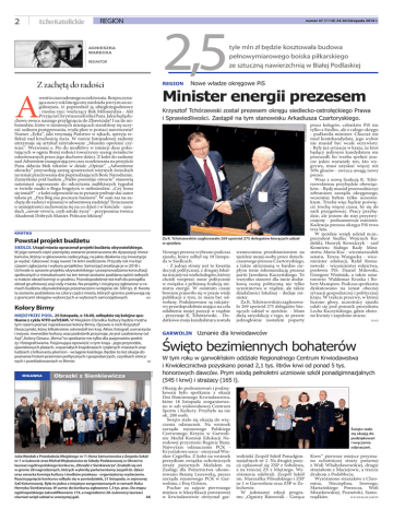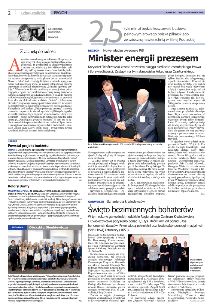 2 region EchoKatolickie 2,5 AGNIESZKA WARECKA redaktor Z zachętą do radości REGION A numer 47 (1116) 24-30 listopada 2016 r. tyle mln zł będzie kosztowała budowa pełnowymiarowego boiska piłkarskiego ze sztuczną nawierzchnią w Białej Podlaskiej Nowe władze okręgowe PiS Minister energii prezesem went to czas radosnego oczekiwania. Rozpoczynająca nowy rok liturgiczny niedziela jest tym szczególniejsza, iż poprzedzał ją ubiegłotygodniowy - można rzec: wieńczący Rok Miłosierdzia - Akt Przyjęcia Chrystusa za Króla i Pana. Jakie będą duchowe owoce naszego przylgnięcia do Zbawiciela? I na ile miłosierdzie, które w minionych miesiącach staraliśmy się uczynić sednem postępowania, wyda plon w postaci nawrócenia? Numer „Echa”, jaki trzymają Państwo w rękach, sprzyja refleksji nad kruchością życia. W nurcie listopadowej zadumy utrzymuje się artykuł zatytułowany „Musimy opróżnić czyściec”. Wezwaniu o. Pio do modlitwy w intencji dusz pokutujących w ogniu Bożej miłości towarzyszy szereg świadectw odnotowanych przez jego duchowe dzieci. Z kolei do zadumy nad Adwentem inaugurującym czas oczekiwania na przyjście Pana skłania blok tekstów w dziale „Opinie”. „Adwentowe okruchy” przywołują szereg spostrzeżeń wiernych świeckich na temat przeżywania dni poprzedzających Boże Narodzenie. Zamyślenia pod hasłem „Niebo pozostaje otwarte” stanowią natomiast zaproszenie do odczytania najbliższych tygodni w świetle nauki o Bogu bogatym w miłosierdzie. „Czy Jezus się śmiał?” - z kolei odpowiedź na to pytanie próbuje dać autor tekstu pt. „Pan Bóg ma poczucie humoru”. W sam raz na zachętę do radości wpisanej w adwentową nadzieję! Tymczasem o umiejętności zachowania się na co dzień i w kościele - zasadach „savoir-vivre’u, czyli sztuki życia” - przypomina twórca Akademii Dobrych Manier. Polecam lekturę! Fot. Piotr Grabowski Krzysztof Tchórzewski został prezesem okręgu siedlecko-ostrołęckiego Prawa i Sprawiedliwości. Zastąpił na tym stanowisku Arkadiusza Czartoryskiego. Krótko Powstał projekt budżetu SIEDLCE. Urząd miasta opracował projekt budżetu obywatelskiego. W jego ramach część pieniędzy zostanie przeznaczona do dyspozycji mieszkańców, którzy w głosowaniu zadecydują, na jakie działania czy inwestycje je wydać. Głosować mają nawet 16-letni siedlczanie. Przyszły rok ma być czasem zgłaszania i wyboru projektów. Samorząd zrealizuje je w 2018 r. Uchwała w sprawie projektu obywatelskiego i przeprowadzania konsultacji społecznych z mieszkańcami na ten temat zostanie poddana opinii radnych w trakcie obrad komisji w grudniu. Prawdopodobnie też trafi do porządku obrad grudniowej sesji rady miasta. Na projekty i inicjatywy zgłoszone w ramach budżetu obywatelskiego przeznaczono wstępnie ok. 500 tys. zł. Kwota ta zostanie podzielona na cztery części miasta, których granice pokrywają się MD z granicami okręgów wyborczych w wyborach samorządowych. Kolory Birmy migawka Obrazki z Sienkiewicza Fot. AK MIĘDZYRZEC PODL. 25 listopada, o 18.00, odbędzie się kolejne spotkanie z cyklu VITO exTrEAM. W Miejskim Ośrodku Kultury będzie można tym razem poznać najciekawsze kolory Birmy. Opowie o nich Krzysztof Deszczyński, który kilkakrotnie odwiedził ten kraj. Aktor, fotograf, scenarzysta i reżyser, menedżer kultury oraz podróżnik przyznaje, że jest uzależniony od Azji”„Kolory Deszcz...Birma” to spotkanie nie tylko dla pasjonatów podróży i fotografowania. Pasjonująca opowieść o tym kraju - jego przyrodzie, zjawiskowych plażach, wspaniałych krajobrazach i pięknych miastach oraz ludziach z kilkunastu plemion - wciągnie każdego. Będzie to też okazja do poznania historii przemian politycznych i gospodarczych, czystkach etniczBZ nych i prześladowaniach w Birmie. Julia Wardak z Przedszkola Miejskiego nr 7 i Ilona Szmuniewska z Zespołu Szkół nr 1 w Łukowie oraz Michał Wojtasiewicz ze Szkoły Podstawowej w Okrzei to laureaci ogólnopolskiego konkursu „Obrazki z Sienkiewicza”. Znaleźli się oni w gronie 28 nagrodzonych, których wyłoniły parlamentarny zespół ds. dzieci oraz senacka komisja kultury i środków przekazu - organizatorzy wydarzenia. Rozstrzygnięcie konkursu odbyło się w poniedziałek, 21 listopada, w sejmowej Sali Kolumnowej. Była to jedna z inicjatyw zorganizowanych w ramach Roku Henryka Sienkiewicza. W sumie do konkursu zgłoszono 1,3 tys. prac. Do etapu ogólnopolskiego zakwalifikowano 174, a nagrodzono 28. Łukowscy laureaci również wzięli udział w uroczystej gali. AK Za K. Tchórzewskim zagłosowało 269 spośród 275 delegatów biorących udział w zjeździe. Nowego prezesa wybrano podczas zjazdu, który odbył się 19 listopada w Siedlcach. - Z jednej strony jest to kwestia decyzji politycznej, z drugiej lokalna inicjatywa wielu kolegów, którzy chcieli wesprzeć mnie politycznie w związku z pełnioną funkcją ministra energii. W ostatnim czasie bowiem pojawiło się w prasie wiele publikacji o tym, że mam być odwołany. Podejmowane są inicjatywy prawdopodobnie mające na celu osłabienie mojej pozycji w rządzie - przyznaje K. Tchórzewski. - Dodatkowo moja kandydatura została Garwolin wzmocniona przedstawieniem na zjeździe mojej osoby przez dotychczasowego prezesa Czartoryskiego, a także utrzymaną w bardzo ciepłym tonie rekomendacją prezesa partii Jarosława Kaczyńskiego. To wszystko stanowi dla mnie dodatkową ocenę polityczną nie tylko uczestnictwa w rządzie, ale także działalności lokalnej - dodaje minister. Za K. Tchórzewskim zagłosowało 269 spośród 275 delegatów biorących udział w zjeździe. - Mam dużą satysfakcję z tego, że prawie jednogłośnie zostałem poparty przez kolegów, członków PiS nie tylko z Siedlec, ale z całego okręgu - podkreśla minister. Chociaż nie miał kontrkandydata, jego wybór nie musiał być wcale oczywisty: - Były już sytuacje w kraju, 