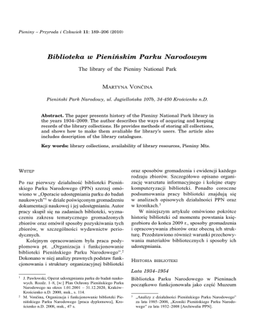 Pieniny – Przyroda i Człowiek 11: 189–206 (2010) Biblioteka w Pienińskim Parku Narodowym The library of the Pieniny National Park MARTYNA VONČINA Pieniński Park Narodowy, ul. Jagiellońska 107b, 34-450 Krościenko n.D. Abstract. The paper presents history of the Pieniny National Park library in the years 1934–2009. The author describes the ways of acquring and keeping records of the library collections. He provides methods of storing all collections, and shows how to make them avaliable for library’s users. The article also includes description of the library catalogues. Key words: library collections, availability of library resources, Pieniny Mts. WSTĘP Po raz pierwszy działalność biblioteki Pienińskiego Parku Narodowego (PPN) szerzej omówiono w „Operacie udostępniania parku do badań naukowych”1 w dziale poświęconym gromadzeniu dokumentacji naukowej i jej udostępnianiu. Autor pracy skupił się na zadaniach biblioteki, wyznaczeniu zakresu tematycznego gromadzonych zbiorów oraz omówił sposoby pozyskiwania tych zbiorów, w szczególności wydawnictw periodycznych. Kolejnym opracowaniem była praca podyplomowa pt. „Organizacja i funkcjonowanie biblioteki Pienińskiego Parku Narodowego”.2 Dokonano w niej analizy prawnych podstaw funkcjonowania i struktury organizacyjnej biblioteki oraz sposobów gromadzenia i ewidencji każdego rodzaju zbiorów. Szczegółowo opisano organizację warsztatu informacyjnego i kolejne etapy komputeryzacji biblioteki. Ponadto coroczne podsumowania pracy biblioteki znajdują się w analizach opisowych działalności PPN oraz w kronikach.3 W niniejszym artykule omówiono pokrótce historię biblioteki od momentu powstania księgozbioru do końca 2009 r., sposoby gromadzenia i opracowywania zbiorów oraz obecną ich strukturę. Przedstawiono również warunki przechowywania materiałów bibliotecznych i sposoby ich udostępniania. HISTORIA BIBLIOTEKI Lata 1934–1954 1 2 J. Pawłowski, Operat udostępniania parku do badań naukowych. Rozdz. 1–8, [w:] Plan Ochrony Pienińskiego Parku Narodowego na okres 1.01.2001 – 31.12.2020, Kraków– Krościenko n.D. 2000, msk., s. 114. M. Vončina, Organizacja i funkcjonowanie biblioteki Pienińskiego Parku Narodowego [praca dyplomowa], Krościenko n.D. 2008, msk., 47 s. Biblioteka Parku Narodowego w Pieninach początkowo funkcjonowała jako część Muzeum 3 „Analizy z działalności Pienińskiego Parku Narodowego” za lata 1985–2008, „Kroniki Pienińskiego Parku Narodowego” za lata 1932–2008 [Archiwalia PPN]. 190 M. Vončina – Biblioteka w PPN Przyrodniczego. Książki i czasopisma gromadzono przy okazji działalności Parku, a pieczę nad nimi pełnił kustosz muzeum. Pierwsza wzmianka o istnieniu księgozbioru pojawiła się w Kronice PPN za lata 1932–1961.4 Dowiadujemy się z niej, że został on założony w 1934 r. i w chwili wybuchu II wojny światowej liczył ponad 400 tomów. Niestety w czasie wojny część zbioru zaginęła. Protokół zdawczo-odbiorczy z dnia 21 kwietnia 1955 roku wykazał 313 pozycji.5 Lata 1955–1984 Po reaktywowaniu Parku w 1955 r. pod nową nazwą Pieniński Park Narodowy, przystąpiono do uzupełniania zbioru i w sześć lat później stan księgozbioru wynosił 973 jednostki inwentarzowe. Biblioteka w tym czasie nie posiadała osobnego pomieszczenia, wobec czego książki i czasopisma przechowywano w gabinecie dyrektora Parku i w pracowni Muzeum. Z pierwszego tomu kroniki wiadomo, że Dyrekcja Parku, w ramach perspektywicznego planu rozwojowego na lata 1961–1965, zaplanowała uzupełnienie księgozbioru o nowe i antykwaryczne pozycje osiągając 2000 jednostek. Kolejna informacja – o urządzeniu biblioteki w osobnym pomieszczeniu - pojawia się w kronice z 1968 r.6 Niestety nie podano więcej szczegółów, nie wiadomo więc o jakie pomieszczenie mogło chodzić. Stan księgozbioru zwiększył się w tym czasie do 1.121 jednostek inwentarzowych. W kronice z 1979 r. czytamy o zwiększonych wymaganiach dyrekcji Parku odnośnie przekazywania do biblioteki kopii ukończonych prac badawczych z terenu Pienińskiego Parku Narodowego.7 Działanie to miało na celu skompletowanie materiałów fizjograficznych regionu pienińskiego. 4 5 6 7 Kronika Pienińskiego Parku Narodowego za lata 1932– 1961. Tom I, Pieniński Park Narodowy, Krościenko nad Dunajcem [1962], s. 75. Protokół zdawczo-odbiorczy Pienińskiego PN, Zał. nr 11, Krościenko n.D. 1955, msk., 111 s. [Biblioteka PPN] A. Kołodziejski (red.), Kronika Pienińskiego Parku Narodowego za 1968 r. Tom VIII, Pieniński Park Narodowy, Krościenko n.D., s. 43. R. Bartyzel (red.), Kronika Pienińskiego Parku Narodowego za 1979 r., Tom XIX, Pieniński Park Narodowy, Krościenko n.D. 1980, s. 61. Lata 1985–1997 W 1985 r. przystąpiono do porządkowania posiadanych zbiorów w ramach nowej Sekcji udostępniana parku do badań naukowych. W bibliotece, oprócz księgozbioru, znalazły się zbiory zdjęć, negatywów, przeźroczy, dzieł plastycznych i map oraz zaczątki zbioru filmów i grafik.8 Zbiory przeniesiono do dwóch pomieszczeń o łącznej powierzchni 41 m2. Jedno z nich wyposażono w nowe metalowe regały i tam zgromadzono księgozbiór oraz zbiory: map, zdjęć, negatywów, przeźroczy i część dzieł plastycznych. W drugim pomieszczeniu umieszczono eksponaty przyrodnicze, które biblioteka przejęła od kustosza Muzeum. Przy bibliotece nie było czytelni, magazynu ani pokoju do pracy bibliotekarza.9 W sąsiednim pokoju, który należał do kierownika zespołu, znajdował się katalog szufladkowy i kserograf. Warunki panujące w lokalu nie sprzyjały przechowywaniu zbiorów. Latem panowała duża wilgotność powietrza, która zimą z kolei spadała do zaledwie 25%. Niewłaściwe warunki przechowywania spowodowały ograniczenie zakupów tylko do pozycji koniecznych. Z kolei utrudniony dostęp do katalogów, księgozbioru oraz brak pomieszczenia dla czytelników nie zachęcał do 