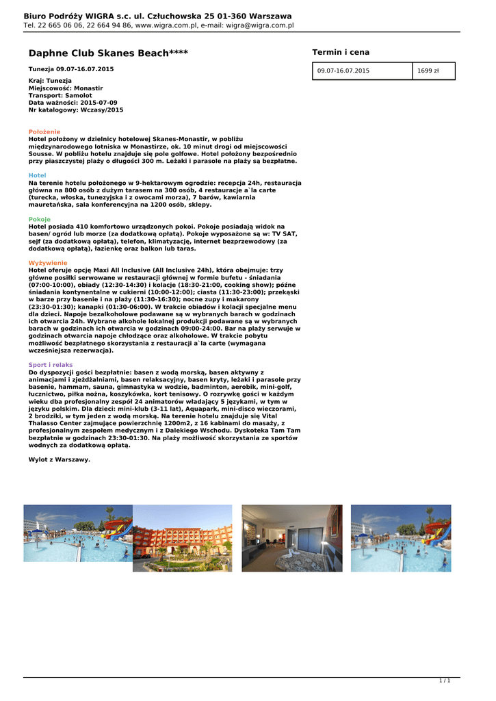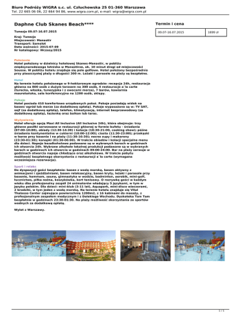 Biuro Podróży WIGRA s.c. ul. Człuchowska 25 01-360 Warszawa Tel. 22 665 06 06, 22 664 94 86, www.wigra.com.pl, e-mail: [email protected] Daphne Club Skanes Beach**** Tunezja 09.07-16.07.2015 Termin i cena 09.07-16.07.2015 1699 zł Kraj: Tunezja Miejscowość: Monastir Transport: Samolot Data ważności: 2015-07-09 Nr katalogowy: Wczasy/2015 Położenie Hotel położony w dzielnicy hotelowej Skanes-Monastir, w pobliżu międzynarodowego lotniska w Monastirze, ok. 10 minut drogi od miejscowości Sousse. W pobliżu hotelu znajduje się pole golfowe. Hotel położony bezpośrednio przy piaszczystej plaży o długości 300 m. Leżaki i parasole na plaży są bezpłatne. Hotel Na terenie hotelu położonego w 9-hektarowym ogrodzie: recepcja 24h, restauracja główna na 800 osób z dużym tarasem na 300 osób, 4 restauracje a`la carte (turecka, włoska, tunezyjska i z owocami morza), 7 barów, kawiarnia mauretańska, sala konferencyjna na 1200 osób, sklepy. Pokoje Hotel posiada 410 komfortowo urządzonych pokoi. Pokoje posiadają widok na basen/ ogród lub morze (za dodatkową opłatą). Pokoje wyposażone są w: TV SAT, sejf (za dodatkową opłatą), telefon, klimatyzację, internet bezprzewodowy (za dodatkową opłatą), łazienkę oraz balkon lub taras. Wyżywienie Hotel oferuje opcję Maxi All Inclusive (All Inclusive 24h), która obejmuje: trzy główne posiłki serwowane w restauracji głównej w formie bufetu - śniadania (07:00-10:00), obiady (12:30-14:30) i kolacje (18:30-21:00, cooking show); późne śniadania kontynentalne w cukierni (10:00-12:00); ciasta (11:30-23:00); przekąski w barze przy basenie i na plaży (11:30-16:30); nocne zupy i makarony (23:30-01:30); kanapki (01:30-06:00). W trakcie obiadów i kolacji specjalne menu dla dzieci. Napoje bezalkoholowe podawane są w wybranych barach w godzinach ich otwarcia 24h. Wybrane alkohole lokalnej produkcji podawane są w wybranych barach w godzinach ich otwarcia w godzinach 09:00-24:00. Bar na plaży serwuje w godzinach otwarcia napoje chłodzące oraz alkoholowe. W trakcie pobytu możliwość bezpłatnego skorzystania z restauracji a`la carte (wymagana wcześniejsza rezerwacja). Sport i relaks Do dyspozycji gości bezpłatnie: basen z wodą morską, basen aktywny z animacjami i zjeżdżalniami, basen relaksacyjny, basen kryty, leżaki i parasole przy basenie, hammam, sauna, gimnastyka w wodzie, badminton, aerobik, mini-golf, łucznictwo, piłka nożna, koszykówka, kort tenisowy. O rozrywkę gości w każdym wieku dba profesjonalny zespół 24 animatorów władający 5 językami, w tym w języku polskim. Dla dzieci: mini-klub (3-11 lat), Aquapark, mini-disco wieczorami, 2 brodziki, w tym jeden z wodą morską. Na terenie hotelu znajduje się Vital Thalasso Center zajmujące powierzchnię 1200m2, z 16 kabinami do masaży, z profesjonalnym zespołem medycznym i z Dalekiego Wschodu. Dyskoteka Tam Tam bezpłatnie w godzinach 23:30-01:30. Na plaży możliwość skorzystania ze sportów wodnych za dodatkową opłatą. Wylot z Warszawy. 1/1 Powered by TCPDF (www.tcpdf.org)