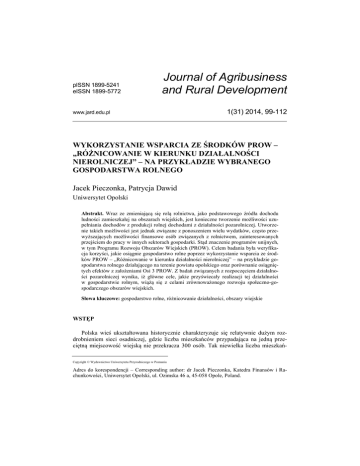 pISSN 1899-5241 eISSN 1899-5772 Journal of Agribusiness and Rural Development www.jard.edu.pl 1(31) 2014, 99-112 WYKORZYSTANIE WSPARCIA ZE ŚRODKÓW PROW – „RÓŻNICOWANIE W KIERUNKU DZIAŁALNOŚCI NIEROLNICZEJ” – NA PRZYKŁADZIE WYBRANEGO GOSPODARSTWA ROLNEGO Jacek Pieczonka, Patrycja Dawid Uniwersytet Opolski Abstrakt. Wraz ze zmieniającą się rolą rolnictwa, jako podstawowego źródła dochodu ludności zamieszkałej na obszarach wiejskich, jest konieczne tworzenie możliwości uzupełniania dochodów z produkcji rolnej dochodami z działalności pozarolniczej. Utworzenie takich możliwości jest jednak związane z ponoszeniem wielu wydatków, często przewyższających możliwości finansowe osób związanych z rolnictwem, zainteresowanych przejściem do pracy w innych sektorach gospodarki. Stąd znaczenie programów unijnych, w tym Programu Rozwoju Obszarów Wiejskich (PROW). Celem badania była weryfikacja korzyści, jakie osiągnie gospodarstwo rolne poprzez wykorzystanie wsparcia ze środków PROW – „Różnicowanie w kierunku działalności nierolniczej” – na przykładzie gospodarstwa rolnego działającego na terenie powiatu opolskiego oraz porównanie osiągniętych efektów z założeniami Osi 3 PROW. Z badań związanych z rozpoczęciem działalności pozarolniczej wynika, iż główne cele, jakie przyświecały realizacji tej działalności w gospodarstwie rolnym, wiążą się z celami zrównoważonego rozwoju społeczno-gospodarczego obszarów wiejskich. Słowa kluczowe: gospodarstwo rolne, różnicowanie działalności, obszary wiejskie WSTĘP Polska wieś ukształtowana historycznie charakteryzuje się relatywnie dużym rozdrobnieniem sieci osadniczej, gdzie liczba mieszkańców przypadająca na jedną przeciętną miejscowość wiejską nie przekracza 300 osób. Tak niewielka liczba mieszkańCopyright © Wydawnictwo Uniwersytetu Przyrodniczego w Poznaniu Adres do korespondencji – Corresponding author: dr Jacek Pieczonka, Katedra Finansów i Rachunkowości, Uniwersytet Opolski, ul. Ozimska 46 a, 45-058 Opole, Poland. 100 J. Pieczonka, P. Dawid ców przypadająca na jedną miejscowość, a także stosunkowo duże rozproszenie zabudowy nie sprzyjają ich żywotności społeczno-kulturowej. Te niekorzystne elementy ukształtowane historycznie, wpływające na rozwój społeczno-kulturowy, dodatkowo wzmacniają migracje zewnętrzne do takich krajów, jak: Wielka Brytania, Irlandia, Niemcy czy Holandia, wynikające głównie z atrakcyjności ich rynków pracy. Niekorzystny trend związany z migracją zewnętrzną łagodzą na niektórych obszarach procesy migracji wewnętrznej – napływ ludności z miast na wieś. Głównie dotyczy to obszarów wiejskich zlokalizowanych wokół wielkich aglomeracji. Osoby migrujące na wieś nie stają się jednak rolnikami, lecz bardziej rezydentami lub przedsiębiorcami wiejskimi, zmieniając strukturę społeczną wspólnot wiejskich. W konsekwencji, przemiany te powodują zmiany potrzeb mieszkańców obszarów wiejskich, których zaspokojenie wiąże się z ograniczaniem funkcji rolniczej oraz wzrostem znaczenia funkcji nierolniczych, jak np. handel i usługi. Zmiany te nie są obojętne dla poziomu i struktury zatrudnienia na obszarach wiejskich. Od wielu lat obserwuje się trend wzrostu udziału pracujących w sektorze usług, przemyśle i budownictwie, a spadek w takich sektorach, jak: rolnictwo, łowiectwo, leśnictwo oraz rybołówstwo. Oznacza to, że udział zatrudnionych w rolnictwie systematycznie spada i wynika to zarówno z transformacji ustrojowej, czego skutkiem była np. likwidacja PGR, jak i przemian związanych z poprawą infrastruktury technicznej, tzw. „usprzętowieniem” procesów produkcyjnych. Na obszarach wiejskich zwiększa się rola działalności pozarolniczej, a wytwarzanie produktów rolnych przestaje już być silnie dominującą funkcją wsi. Przejmowanie nowych pozarolniczych funkcji przez obszary wiejskie jest określane jako przejaw procesów dostosowawczych do nowych wyzwań związanych z rozwojem gospodarki rynkowej i przemian cywilizacyjnych [Zaremba 2008, s. 27-29]. Wraz ze zmniejszającą się rolą rolnictwa, jako podstawowego źródła dochodu ludności zamieszkałej na obszarach wiejskich, jest konieczne tworzenie możliwości uzupełniania dochodów z produkcji rolnej dochodami z działalności pozarolniczej. Powstanie takich możliwości jest jednak związane z ponoszeniem wielu wydatków dostosowujących rynek dóbr i usług do potrzeb społeczności lokalnej, często przewyższający możliwości finansowe osób związanych z rolnictwem, zainteresowanych przejściem do pracy w innych sektorach gospodarki. Stąd znaczenie programów unijnych, w tym PROW. PERSPEKTYWY OBSZARÓW WIEJSKICH I ICH PRZEMIAN (W TYM ROZWÓJ PRZEDSIĘBIORCZOŚCI) Koncepcja wielofunkcyjnego rozwoju obszarów wiejskich jest wyrazem rosnącego przekonania, iż funkcje społeczna i ekonomiczna obszarów wiejskich nie sprowadzają się już tylko do produkcji surowców rolnych (w przypadku rolnictwa) i zapewnienia miejsca dla tej produkcji (obszary wiejskie), a w coraz większym stopniu polegają na dostarczaniu innych dóbr i funkcji istotnych z punktu widzenia społeczeństwa i zapewnienia możliwości zrównoważonego rozwoju społecznego i gospodarczego, z uwzględnieniem zasobów przyrodniczych, krajobrazowych, kulturowych oraz kapitału ludzkiego i społecznego [Kierunki... 2010, s. 62-63]. Journal of Agribusiness and Rural Development Wykorzystanie wsparcia ze środków PROW ... 101 Obszary wiejskie czekają przemiany, które będą wynikały z: (I) zakończonego Przeglądu Wspólnej Polityki Rolnej (Health-Check), (II) kształtu tej polityki oraz polityki spójności po 2013 roku, (III) szybkich zmian zachodzącym na europejskim i globalnym rynku, (IV) możliwości, jakie stwarzają fundusze i instrumenty adresowane do obszarów wiejskich. Coraz większego znaczenia będzie nabierał wielofunkc