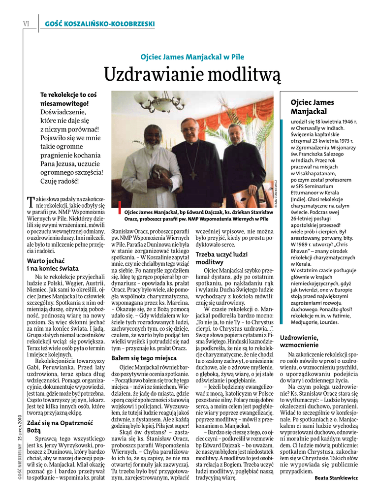 VI gość koszalińsko-kołobrzeski Ojciec James Manjackal w Pile Uzdrawianie modlitwą Te rekolekcje to coś niesamowitego! Doświadczenie, które nie daje się z niczym porównać! Pojawiło się we mnie takie ogromne pragnienie kochania Pana Jezusa, uczucie ogromnego szczęścia! Czuję radość! akie słowa padały na zakończenie rekolekcji, jakie odbyły się w parafii pw. NMP Wspomożenia Wiernych w Pile. Niektórzy dzielili się swymi wrażeniami, mówili o poczuciu wewnętrznej odmiany, o uzdrowieniu duszy. Inni milczeli, ale było to milczenie pełne przejęcia i radości. Gość Niedzielny 25 lipca 2010 Warto jechać i na koniec świata Na te rekolekcje przyjechali ludzie z Polski, Węgier, Austrii, Niemiec. Jak sami to określili, ojciec James Manjackal to człowiek szczególny. Spotkania z nim odmieniają duszę, ożywiają pobożność, podnoszą wiarę na nowy poziom. Są więc skłonni jechać za nim na koniec świata. I jadą. Grupa stałych niemal uczestników rekolekcji wciąż się powiększa. Teraz też wiele osób pyta o termin i miejsce kolejnych. Rekolekcjoniście towarzyszy Gabi, Peruwianka. Przed laty uzdrowiona, teraz spłaca dług wdzięczności. Pomaga organizacyjnie, dokumentuje wypowiedzi, jest tam, gdzie może być potrzebna. Często towarzyszy jej syn, lekarz. Jest też kilka innych osób, które tworzą przyjazną ekipę. Zdać się na Opatrzność Bożą Sprawcą tego wszystkiego jest ks. Jerzy Wyrzykowski, proboszcz z Duninowa, który bardzo chciał, aby w naszej diecezji pojawił się o. Manjackal. Miał okazję poznać go i bardzo przeżywał to spotkanie – wspomina ks. prałat BEATA STANKIEWICZ T Ojciec James Manjackal Ojciec James Manjackal, bp Edward Dajczak, ks. dziekan Stanisław Oracz, proboszcz parafii pw. NMP Wspomożenia Wiernych w Pile Stanisław Oracz, proboszcz parafii pw. NMP Wspomożenia Wiernych w Pile. Parafia z Duninowa nie była w stanie zorganizować takiego spotkania. – W Koszalinie zapytał mnie, czy nie chciałbym tego wziąć na siebie. Po namyśle zgodziłem się. Ideę tę gorąco popierał bp ordynariusz – opowiada ks. prałat Oracz. Pracy było wiele, ale pomogła wspólnota charyzmatyczna, wspomagana przez ks. Marcina. – Okazuje się, że z Bożą pomocą udało się. – Gdy widziałem w kościele tych rozradowanych ludzi, zachwyconych tym, co się dzieje, czułem, że warto było podjąć ten wielki wysiłek i potrudzić się nad tym – przyznaje ks. prałat Oracz. Bałem się tego miejsca Ojciec Manjackal również bardzo pozytywnie ocenia spotkanie. – Początkowo bałem się trochę tego miejsca – mówi ze śmiechem. Wiedziałem, że jadę do miasta, gdzie sporą część społeczności stanowią wojskowi i policjanci. Wyczuwałem, że tutejsi ludzie reagują jakoś dziwnie, z dystansem. Ale z każdą godziną było lepiej. Piła jest super! Skąd ów dystans? – zastanawia się ks. Stanisław Oracz, proboszcz parafii Wspomożenia Wiernych. – Chyba paraliżowało ich to, że są zapisy, że nie ma otwartej formuły jak zazwyczaj. Tu trzeba było być przygotowanym, zarejestrowanym, wpłacić wcześniej wpisowe, nie można było przyjść, kiedy po prostu podyktowało serce. Trzeba uczyć ludzi modlitwy Ojciec Manjackal szybko przełamał dystans, gdy po ostatnim spotkaniu, po nakładaniu rąk i wylaniu Ducha Świętego ludzie wychodzący z kościoła mówili: czuję się uzdrowiony. W czasie rekolekcji o. Manjackal podkreśla bardzo mocno: „To nie ja, to nie Ty – to Chrystus cierpi, to Chrystus uzdrawia…”. Swoje słowa popiera cytatami z Pisma Świętego. Hinduski kaznodzieja podkreśla, że nie są to rekolekcje charyzmatyczne, że nie chodzi tu o szalony zachwyt, o uniesienie duchowe, ale o zdrowe myślenie, o głęboką, żywą wiarę, o jej stałe odświeżanie i pogłębianie. – Jeżeli będziemy ewangelizować z mocą, katolicyzm w Polsce pozostanie silny. Polacy mają dobre serca, a moim celem jest pogłębienie wiary poprzez ewangelizację, poprzez modlitwę – mówił z przekonaniem o. Manjackal. – Bardzo się cieszę z tego, co ojciec czyni – podkreślił w rozmowie bp Edward Dajczak – bo uważam, że naszym błędem jest niedostatek modlitwy. A modlitwa to jest osobista relacja z Bogiem. Trzeba uczyć ludzi modlitwy, pogłębiać naszą tradycyjną wiarę. urodził się 18 kwietnia 1946 r. w Cheruvally w Indiach. Święcenia kapłańskie otrzymał 23 kwietnia 1973 r. w Zgromadzeniu Misjonarzy św. Franciszka Salezego w Indiach. Przez rok pracował na misjach w Visakhapatanam, po czym został profesorem w SFS Seminarium Ettumanoor w Kerala (Indie). Głosi rekolekcje charyzmatyczne na całym świecie. Podczas swej 26-letniej posługi apostolskiej przeszedł wiele prób i cierpień. Był aresztowany, porwany, bity. W 1989 r. utworzył „Chris Bhavan” – znany ośrodek rekolekcji charyzmatycznych w Kerala. W ostatnim czasie posługuje głównie w krajach niemieckojęzycznych, gdyż jak twierdzi, one w Europie stoją przed największymi zagrożeniami rozwoju duchowego. Ponadto głosił rekolekcje m.in. w Fatimie, Medjugorie, Lourdes. Uzdrowienie, wzmocnienie Na zakończenie rekolekcji sporo osób mówiło wprost o uzdrowieniu, o wzmocnieniu psychiki, o uporządkowaniu podejścia do wiary i codziennego życia. Na czym polega uzdrowienie? Ks. Stanisław Oracz stara się to wytłumaczyć: – Ludzie bywają okaleczeni duchowo, poranieni. Widać to szczególnie w konfesjonale. Po spotkaniach z o. Manjackalem ci sami ludzie wychodzą wyprostowani duchowo, odnowieni moralnie pod każdym względem. Ci ludzie mówią publicznie: spotkałem Chrystusa, zakochałem się w Chrystusie. Takich słów nie wypowiada się publicznie przypadkiem. Beata Stankiewicz