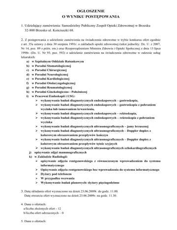 OGŁOSZENIE O WYNIKU POSTĘPOWANIA 1. Udzielający zamówienia: Samodzielny Publiczny Zespół Opieki Zdrowotnej w Brzesku 32-800 Brzesko ul. Kościuszki 68. 2. Z postępowania o udzielenie zamówienia na świadczenia zdrowotne w trybie konkursu ofert zgodnie z art. 35a ustawy z dnia 30 sierpnia 1991r. o zakładach opieki zdrowotnej (tekst jednolity: Dz. U. z 2007, Nr 14, poz. 89 z późn. zm.) oraz Rozporządzeniem Ministra Zdrowia i Opieki Społecznej z dnia 13 lipca 1998r. (Dz. U. Nr 93, poz. 592) o udzielenie zamówienia na świadczenia zdrowotne w zakresie usług lekarskich: a) w Szpitalnym Oddziale Ratunkowym b) w Poradni Stomatologicznej c) w Poradni Chirurgicznej d) w Poradni Neurologicznej e) w Poradni Kardiologicznej f) w Poradni Otolaryngologicznej g) w Poradni Reumatologicznej h) w Poradni Ginekologiczno - Położniczej i) w Pracowni Endoskopii i USG: wykonywanie badań diagnostycznych endoskopowych – gastroskopia, wykonywanie badań diagnostycznych endoskopowych – gastroskopia z pobraniem wycinka lub tamowaniem krwawienia, wykonywanie badań diagnostycznych endoskopowych – rektoskopia, wykonywania badań diagnostycznych endoskopowych – rektoskopia z pobraniem wycinka wykonywanie badań diagnostycznych ultrasonograficznych – jamy brzusznej wykonywanie badań diagnostycznych ultrasonograficznych – Doppler duplex z kolorowym obrazowaniem przepływów kończyn wykonywanie badań diagnostycznych ultrasonograficznych – Doppler duplex z kolorowym obrazowaniem przepływów tętnic szyjnych wykonywanie badań diagnostycznych ultrasonograficznych echokardiograficznych j) opisywanie zdjęć mammograficznych k) w Zakładzie Radiologii: opisywanie zdjęcia rentgenowskiego z równoczesnym wprowadzeniem do systemu informatycznego Opisywanie zdjęcia rentgenowskiego bez wprowadzenia do systemu informatycznego Dyżury pod telefonem W przypadku wezwania Wykonywanie badań planowych: dyżury pięciogodzinne 3. Datę składania ofert wyznaczono na dzień 23.06.2009r. do godz. 11.00. Datę otwarcia ofert wyznaczono na dzień 23.06.2009r. na godz. 11.30. 4. Dane o ofertach: a/liczba złożonych ofert - 12 b/liczba ofert odrzuconych – 0 5. Dane o ofertach: a) w Szpitalnym Oddziale Ratunkowym – 1 oferta cena za 1 godz. 43,00 zł brutto b) w Poradni Stomatologicznej – 1 oferta cena za 1 punkt rozliczeniowy 0,38 zł brutto c) w Poradni Chirurgicznej – 3 oferty cena za 1 punkt rozliczeniowy 4,00 zł brutto d) w Poradni Neurologicznej – 1 oferta cena za 1 punkt rozliczeniowy 4,00 zł brutto e) w Poradni Kardiologicznej – 1 oferta cena za punkt rozliczeniowy 4,00 zł brutto f) w Poradni Otolaryngologicznej – 1 oferta cena za 1 punkt rozliczeniowy 4,00 zł brutto g) w Poradni Reumatologicznej - 0 h) w Poradni Ginekologiczno – Położniczej – 1 oferta cena za 1 punkt rozliczeniowy 4,00 zł brutto i) w Pracowni Endoskopii i USG – 2 oferty wykonywanie badań diagnostycznych endoskopowych – gastroskopia, cena za 1 badanie z opisem 35,00 zł brutto wykonywanie badań diagnostycznych endoskopowych – gastroskopia z pobraniem wycinka lub tamowaniem krwawienia, cena za 1 badanie z opisem 40,00 zł brutto wykonywanie badań diagnostycznych endoskopowych – rektoskopia, wykonywania badań diagnostycznych endoskopowych – rektoskopia z pobraniem wycinka wykonywanie badań diagnostycznych ultrasonograficznych – jamy brzusznej cena za 1 badanie z opisem 15,00 zł brutto wykonywanie badań diagnostycznych ultrasonograficznych – Doppler duplex z kolorowym obrazowaniem przepływów kończyn wykonywanie badań diagnostycznych ultrasonograficznych – Doppler duplex z kolorowym obrazowaniem przepływów tętnic szyjnych wykonywanie badań diagnostycznych ultrasonograficznych echokardiograficznych j) opisywanie zdjęć mammograficznych - 0 k) w Zakładzie Radiologii – 2 oferty opisywanie zdjęcia rentgenowskiego z równoczesnym wprowadzeniem do systemu informatycznego cena za 1 zdjęcie 6,00 zł brutto Opisywanie zdjęcia rentgenowskiego bez wprowadzenia do systemu informatycznego cena za 1 zdjęcie 4,50 zł brutto Dyżury pod telefonem cena za 1 godzinę 20,00 zł brutto W przypadku wezwania cena za 1 badanie tomografii komputerowej głowy lub tomografii komputerowej kręgosłupa 30,00 zł brutto cena za 1 badanie inne 40,00 zł Wykonywanie badań planowych: dyżury pięciogodzinne 2 6. Wyboru Oferenta dokonano zgodnie z Art.35a ustawy o zakładach opieki zdrowotnej oraz §12 ust.3 w/wym. Rozporządzenia Ministra Zdrowia i Opieki Społecznej na podstawie kryterium oceny ofert przedstawionym w warunkach konkursu. 7. W związku z powyższym wybrano oferty na udzielenie świadczeń zdrowotnych w zakresie usług lekarskich: a) w Szpitalnym Oddziale Ratunkowym Oferta nr 1 – Indywidualna Praktyka Lekarska lek. Mariusz Rybak b) w Poradni Stomatologicznej Oferta nr 2 – Gabinet Stomatologiczny Marta Żółtek - Laska c) w Poradni Chirurgicznej Oferta nr 3 – Indywidualna Specjalistyczna Praktyka Lekarska lek. Kajetan Kubas Oferta nr 4 – Praktyka Lekarska lek. med. Marcin Pająk Oferta nr 5 – Indywidualna Specjalistyczna Praktyka Lekarska lek. med. Krzysztof Rembiasz d) w Poradni Neurologicznej Oferta nr 6 – Indywidualna Specjalistyczna Praktyka Lekarska Gabinet Neurologiczny lek. med. Lucyna Michałek - Armatys e) w Poradni Kardiologicznej Oferta nr 7 – Specjalistyczny Gabinet Lekarski Iwona Keller - Konopka f) w Poradni Otolaryngologicznej Oferta nr 8– Gabinet Lekarski lek. Małgorzata Kotfis g) w Poradni Reumatologicznej h) w Poradni Ginekologiczno – Położniczej Oferta nr 9 – Niepubliczny Zakład Opieki Zdrowotnej „MEDYK II” i) w Pracowni Endoskopii i USG Oferta nr 4 – Praktyka Lekarska lek. med. Marcin Pająk Oferta nr 10 – Indywidualna Specjalistyczna Praktyka Lekarska lek. Kajetan Kubas j) opisywanie zdjęć mammograficznych k) w Zakładzie Radiologii Oferta nr 11 – Specjalistyczna Praktyka Lekarska lek. med. Aleksandra Kowalska Oferta nr 12 – Indyw