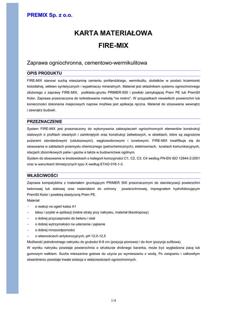 PREMIX Sp. z o.o. KARTA MATERIAŁOWA FIRE-MIX Zaprawa ogniochronna, cementowo-wermikulitowa OPIS PRODUKTU FIRE-MIX stanowi suchą mieszaninę cementu portlandzkiego, wermikulitu, dodatków w postaci krzemionki koloidalnej, włókien syntetycznych i wypełniaczy mineralnych. Materiał jest składnikiem systemu ogniochronnego złożonego z zaprawy FIRE-MIX, podkładu-gruntu PRIMER-500 i powłoki zamykającej Prem PE lub PremSil Kolor. Zaprawa przeznaczona do torkretowania metodą "na mokro". W przypadkach niewielkich powierzchni lub konieczności dokonania miejscowych napraw możliwa jest aplikacja ręczna. Materiał do stosowania wewnątrz i zewnątrz budowli. PRZEZNACZENIE System FIRE-MIX jest przeznaczony do wykonywania zabezpieczeń ogniochronnych elementów konstrukcji stalowych o profilach otwartych i zamkniętych oraz konstrukcji żelbetowych, w obiektach, które są zagrożone pożarami standardowymi (celulozowymi), węglowodorowymi i tunelowymi. FIRE-MIX kwalifikuje się do stosowania w zakładach przemysłu chemicznego (petrochemicznych), elektrowniach, tunelach komunikacyjnych, stacjach zbiornikowych paliw i gazów a także w budownictwie ogólnym. System do stosowania w środowiskach o kategorii korozyjności C1, C2, C3, C4 według PN-EN ISO 12944-2:2001 oraz w warunkach klimatycznych typu X według ETAG 018-1-3. WŁAŚCIWOŚCI Zaprawa kompatybilna z materiałem gruntującym PRIMER 500 przeznaczonym do standaryzacji powierzchni betonowej lub stalowej oraz materiałami do ochrony powierzchniowej, impregnatem hydrofobizującym PremSil Kolor i powłoką elastyczną Prem PE. Materiał: o reakcji na ogień kalsa A1 łatwy i szybki w aplikacji (niskie straty przy natrysku, materiał tiksotropowy) o dobrej przyczepności do betonu i stali o dobrej wytrzymałości na uderzenie i pękanie o dobrej mrozoodporności o własnościach antykorozyjnych, pH 12,0-12,5 Możliwość jednokrotnego natrysku do grubości 6-8 cm (pozycja pionowa) i do 4cm (pozycja sufitowa). W wyniku natrysku powstaje powierzchnia o strukturze drobnego baranka, może być wygładzona pacą lub gumowym wałkiem. Sucha mieszanina gotowa do użycia po wymieszaniu z wodą. Po związaniu i całkowitym stwardnieniu powstaje trwała izolacja o właściwościach ogniochronnych. 1/4 BADANIA I NORMY Zaprawa spełnia wymagania kategorii korozyjności C1,C2,C3,C4 wg. PN-EN ISO 12944-2:2001 Badania w Zakładzie Badań Ogniowych Instytutu Techniki Budowlanej Aprobata Techniczna ITB AT-15-9178/2014 DANE PRODUKTU OPAKOWANIE: 25 kg POSTAĆ/BARWA: sucha mieszanina / szary proszek DOZOWANIE WODY ZAROBOWEJ: 22-24 l/25kg SKŁADOWANIE: czas przechowywania w oryginalnych, zamkniętych workach, w suchym i chłodnym pomieszczeniu wynosi 6 miesięcy. Chronić przed mrozem, wilgocią, wysoką temperaturą i UV. DANE TECHNICZNE BAZA CHEMICZNA: cement portlandzki, wermikulit, mikrokrzemionka, polimery, dodatki KLASA ODPORNOŚCI OGNIOWEJ DLA KONSTRUKCJI STALOWYCH: R 15 - R 240 KLASA ODPORNOŚCI OGNIOWEJ DLA KONSTRUKCJI ŻELBETOWYCH: R 30 - R 360 GRUBOŚĆ WARSTWY: zgodnie z Aprobatą Techniczną CZAS WSTĘPNEGO UTWARDZENIA/SCHNIĘCIA: ok. 24h (w zależności od temperatury i wilgotności może ulec znacznym zmianom) CZAS DO OSIĄGNIĘCIA PEŁNYCH WŁASNOŚCI MECHANICZNYCH: ok. 30 dni przy temperaturze 15-20°C 2 WYDAJNOŚĆ: ok. 6 kg/ 1 m /1cm GĘSTOŚĆ NASYPOWA, PN-EN 1097-3:2000: 410 ± 10% kg/m CZAS PRZYDATNOŚCI GOTOWEJ MIESZANINY: 40 - 50 minut 3 GĘSTOŚĆ OBJĘTOŚCIOWA W STANIE SUCHYM PO CAŁKOWITYM WYSCHNIĘCIU, PN-EN 1015-10:2001/A1:2007: 640 ± 10% kg/m WYTRZYMAŁOŚĆ NA ZGINANIE, PN-EN 1015-11:2001/A1:2007: ≥ 1,5 N/mm 2 WYTRZYMAŁOŚĆ NA ŚCISKANIE, PN-EN 1015-11:2001/A1:2007: ≥ 3,0 N/mm 2 SKURCZ LINIOWY PO 28 DNIACH, PN-B-04500:1985: ≤ 0,5% 2/4 3 SZCZEGÓŁY APLIKACJI ZUŻYCIE 2 około 6,0 kg/m /1 cm, wartość przybliżona, może być zmienna w zależności od stanu podłoża i strat podczas nanoszenia zaprawy, woda zarobowa 22-24 l na 25 kg mieszanki JAKOŚĆ PODŁOŻA podłoża betonowe powinny być wysezonowane, zwarte, nośne i czyste, bez luźno związanych cząstek oraz wolne od substancji obniżających przyczepność (mleczko cementowe). Powierzchnie stalowe powinny być oczyszczone do stopnia Sa2½. PRZYGOTOWANIE PODŁOŻA Beton - wszystkie luźne fragmenty podłoża, zanieczyszczenia organiczne i nieorganiczne, mleczko cementowe, które mogą mieć negatywny wpływ na połączenie zaprawy z podłożem, należy usunąć stosując hydromonitoring wodą, hydromonitoring z piaskiem (ciśnienie 400 bar) lub piaskowanie. Na oczyszczoną powierzchnię betonu nakłada się siatkę stalową, ocynkowaną o oczkach heksagonalnych o wymiarze 25 mm. Następnie powierzchnię betonu należy nasączać wodą przez 4-8 godzin. Dopiero wówczas można nakładać natrysk metodą mokre na mokre. Niedopuszczalne jest nakładanie zaprawy ogniochronnej na suchy lub ociekający wodą beton. W celu standaryzacji powierzchni betonu, zalecamy stosowanie środka gruntującego Primer 500 przed natryskiem właściwego materiału. Stal – powierzchnię oczyścić metodą strumieniowo-ścierną do 1 stopnia czystości Sa2 /2. Następnie zabezpieczyć antykorozyjnie farbą epoksydową dwuskładnikową, zaakceptowaną przez producenta FIRE-MIX. Zabezpieczenie antykorozyjne powinno być wykonane zgodnie z zaleceniami producenta farby. Na tak przygotowaną powierzchnię montujemy siatkę z drutu stalowego, ocynkowanego o grubości 0,8 mm, o oczkach heksagonalnych o wymiarze 25 mm. Metody montowania siatki w informacjach technicznych produktu. W przypadku, gdy istniejąca powłoka ochronna jest w dobrym stanie, należy ją oczyścić i zabezpieczyć Primerem 500 przed nałożeniem właściwego materiału. TEMPERATURA OTOCZENIA minimum +5°C, maksimum +40°C materiału nie wolno stosować przy silnej ekspozycji na światło słoneczne WILGOTNOŚĆ PODŁOŻA podłoże matowo-wilgotne, bez zastoin wody WILGOTONŚĆ WZGLĘDNA POWIETRZA minimum 20% maksi