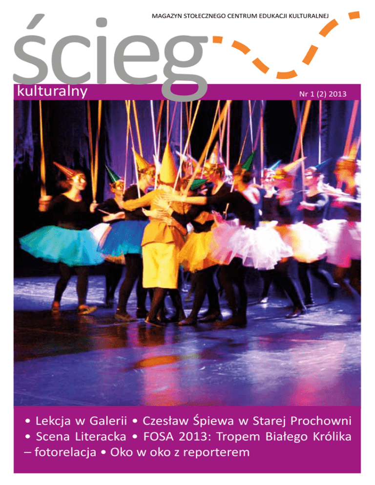 ścieg MAGAZYN STOŁECZNEGO CENTRUM EDUKACJI KULTURALNEJ kulturalny Nr 1 (2) 2013 • Lekcja w Galerii • Czesław Śpiewa w Starej Prochowni • Scena Literacka • FOSA 2013: Tropem Białego Królika – fotorelacja • Oko w oko z reporterem ścieg ścieg Lekcja mądrości W numerze Czesław Śpiewa w Starej Prochowni str. 10-14 Oko w oko z reporterem str. 36-38 Michał Zabłocki str. 14-15 Mateusz Kałan, czyli poezja i logorrhea str. 16-19 „Materiał Dowodowy” – nagrodzony reportaż Emiliana Malinowskiego str. 39-43 Ścieg Kulturalny nr 1 (2) 2013, Magazyn Stołecznego Centrum Edukacji Kulturalnej. Zespół redakcyjny: Wojciech Feliksiak, Marcin Krupowicz, Gabryella Miłowska-Moląg, Konstanty Pieńkosz, Dariusz Skwarcan. Współpraca: Magdalena Moczarska, Patryk Świerlikowski (projekt graficzny „FOSA 2013 – fotorelacja”). Zdjęcie na okładce: Dariusz Skwarcan Wydawca: Stołeczne Centrum Edukacji Kulturalnej, ul. Jezuicka 4, 00-281 Warszawa, tel.: 22 831 53 93, fax: 22 831 33 35, e-mail: [email protected], www.scek.pl © Stołeczne Centrum Edukacji Kulturalnej 2013 2 MAGAZYN STOŁECZNEGO CENTRUM EDUKACJI KULTURALNEJ Nr 1 (2) 2013 Galeria Abakus w Stołecznym Centrum Edukacji Kulturalnej po raz kolejny była miejscem wyjątkowego spotkania – spotkania młodzieży ze sztuką i z niezwykle inspirującym artystą. 3 października 2012 r. Michał Piotrkowicz poprowadził zajęcia z cyklu Lekcja w Galerii. Nr 1 (2) 2013 MAGAZYN STOŁECZNEGO CENTRUM EDUKACJI KULTURALNEJ 3 ścieg ścieg T Na przykład obraz „Zwiad z niebios” przedstawia kobietę, której zrobiono zdjęcie gdzieś tutaj, na Starym Mieście, kiedy milicja ją pałowała. Ja domalowałem jej skrzydła, trochę zmieniłem kompozycję. Czasami mam tak, że widzę zdjęcie albo jakąś migawkę w telewizji i mam już pomysł na jedną pracę albo cały cykl. Magdalena Kostrzewa ematem zajęć była wystawa Michała Piotrkowicza „Sztuki walki, walki o sztukę”. Młodzież z Gimnazjum Miejskiego nr 3 im. Janusza Kusocińskiego w Mińsku Mazowieckim odebrała solidną dawkę wiedzy na temat dalekowschodnich technik malarskich i kaligraficznych, a potem wzięła udział w warsztacie plastycznym inspirowanym pracami artysty. Michał Piotrkowicz podzielił się z nami swoimi refleksjami na temat zajęć oraz opowiedział o swoich dwóch wystawach, które mogliśmy podziwiać w Stołecznym Centrum Edukacji Kulturalnej – równolegle w Galerii Stara Prochownia prezentowana była druga wystawa jego autorstwa zatytułowana „Anioły” – a przy okazji przekazał nam sporo autentycznej mądrości związanej ze sztukami pięknymi i sztukami walki. W ludzkim życiu taka mądrość jest nie do przecenienia. Przecież wszyscy bezustannie zmagamy się z przeciwnościami losu, ludzką nieżyczliwością oraz, może przede wszystkim, ze swoimi słabościami. Próbujemy się doskonalić, rozwijać swoje pasje, przezwyciężać ograniczenia – nasze życie jest nieustającą walką. Dobrze, że jest sztuka, która może być w tych zmaganiach przewodnikiem i że są anioły, które doglądają naszych spraw i zawsze są gotowe w chwilach największego zwątpienia posłużyć wsparciem. Wernisaż wystawy „Anioły”, Galeria Stara Prochownia, 21 września 2012 r. W Wernisaż wystawy „Sztuki walki, walki o sztukę”, Galeria Abakus, 13 września 2012 r. S pecjalizuję się w rzeczach, do których nie miałem predyspozycji. Jeżeli chodzi o sztuki walki to jak na moją kategorię wagową mam średni wzrost, więc nie daje mi to żadnej przewagi. Jestem szybki, ale są szybsi. Jestem silny, ale są silniejsi. Dobrze kopię, ale są tacy, co kopią lepiej, 4 uderzają lepiej i tak dalej. Dlatego jako dziecko byłem dość przeciętny, ale i tak bardzo to lubiłem. I podobnie było z malowaniem. W dzieciństwie nie było u mnie przejawów jakiegoś specjalnego talentu plastycznego. I malarstwo, i sztuki walki sprawiały mi podobne problemy. MAGAZYN STOŁECZNEGO CENTRUM EDUKACJI KULTURALNEJ Nr 1 (2) 2013 Michał Piotrkowicz – magister sztuk pięknych. Urodzony 2 sierpnia 1985 r. w Warszawie, gdzie ukończył Wydział Konserwacji i Restauracji Dzieł Sztuki Akademii Sztuk Pięknych. Jego dorobek artystyczny obejmuje ponad 2000 obrazów. Wykonał ilustracje do trzech książek o japońskich sztukach walki i jest autorem okładki publikacji pt. „Kenjutsu, podręcznik walki mieczem katana”. Od 20 lat uprawia karate i inne japońskie sztuki walki pod okiem swojego ojca Shihana Tomasza Piotrkowicza (7 dan karate), w których posiada stopnie mistrzowskie. Jest członkiem Kadry Polski i pięciokrotnym medalistą mistrzostw świa- Nr 1 (2) 2013 Anna Gruszkiewicz Magdalena Kostrzewa ystawa „Anioły” w Starej Prochowni SCEK jest inauguracją trzech różnych wystaw. Pierwsza była wystawą aneksu malarskiego do mojego dyplomu na ASP. Były to prace inspirowane wierszem Herberta „Przesłuchanie Anioła”. Druga wystawa prezentowana była w Konsulacie Generalnym w Nowym Jorku z okazji obchodów trzydziestolecia wprowadzenia Stanu Wojennego. W tej wystawie przeważa tematyka Solidarnościowa. Prace na niej zawarte inspirowane były autentycznymi zdjęciami z czasów Stanu Wojennego – zdjęciami robionymi przez obie strony, zarówno przez bezpiekę, jak i przez prywatne osoby, gdzieś tam z ukrycia. Na tej wystawie również postać anioła była kluczowa. ta w karate. Zdobył ponad setkę trofeów w sportach walki. Jest zawodnikiem i instruktorem Warszawskiego Centrum Karate. MAGAZYN STOŁECZNEGO CENTRUM EDUKACJI KULTURALNEJ 5 ścieg T rzecia wystawa była w pewnej kawiarni w Nowym Jorku. Inspirowana ona była innym wierszem Herberta zatytułowanym „Siódmy Anioł”. W „Przesłuchaniu Anioła” jest obecna pewna przepowiednia upadku systemu, który nastał – Herbert napisał ten wiersz zanim doszło do kryzysu władzy komunistycznej, więc przewidując w pewien sposób to, co się stanie, i taki jest wydźwięk t