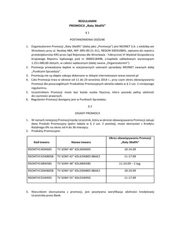 REGULAMIN PROMOCJI „Raty 36x0%” §1 POSTANOWIENIA OGÓLNE 1. Organizatorem Promocji „Raty 36x0%” (dalej jako „Promocja”) jest NEONET S.A. z siedzibą we Wrocławiu przy ul. Nyskiej 48A, NIP: 895-00-21-311, REGON 930310841, wpisana do rejestru przedsiębiorców KRS przez Sąd Rejonowy dla Wrocławia - Fabrycznej VI Wydział Gospodarczy Krajowego Rejestru Sądowego pod nr 0000218498, o kapitale zakładowym wynoszącym 1.251.000,00 złotych, w całości wpłaconym (dalej zwana „Organizatorem”). 2. Promocja prowadzona będzie w stacjonarnych salonach sprzedaży NEONET zwanych dalej „Punktami Sprzedaży”. 3. Promocją nie są objęte zakupy dokonane w sklepie internetowym www.neonet.pl 4. Cała Promocja trwa w okresie od 11 do 24 września 2014 r., przy czym okres obowiązywania Promocji dla poszczególnych Produktów Promocyjnych określa tabela w § 2 ust. 2 niniejszego regulaminu. 5. Uczestnikiem Promocji może być każda osoba fizyczna, która posiada pełną zdolność do czynności prawnych. 6. Regulamin Promocji dostępny jest w Punktach Sprzedaży. §2 ZASADY PROMOCJI 1. W ramach niniejszej Promocji każdy Uczestnik, który w okresie obowiązywania Promocji zakupi dany Produkt Promocyjny (patrz tabela w § 2 ust. 2 poniżej), może skorzystać z Kredytu Ratalnego 0% na okres od 4 do 36 miesięcy. 2. Produkty Promocyjne: Kod towaru Nazwa towaru Okres obowiązywania Promocji „Raty 36x0%” RSONTVC40W605 TV SONY 40" KDL40W605 18-24.09 RSONTVC42W805B TV SONY 42" KDL42W805 BBAE2 11-17.09 RSONTVC48W585 TV SONY 48" KDL48W585 RSONTVC50W805B TV SONY 50" KDL50W805 BBAE2 18-24.09 RSONTVC55W955 TV SONY 55" KDL55W955 11-17.09 11-24.09 – 2 tyg. 3. Warunkiem skorzystania z promocji, jest pozytywna weryfikacja zdolności kredytowej Uczestnika przez Bank. 4. Uczestnik Promocji może w ramach Promocji zakupić dowolną ilość Produktów Promocyjnych, o ile nastąpi pozytywna weryfikacja przez Bank zdolności kredytowej Uczestnika na przyznanie Kredytu Ratalnego na okres od 4 do 36 miesięcy. 5. Organizator jako pośrednik kredytowy na podstawie zawartych umów z Credit Agricole Bank Polska S.A. oraz Santander Consumer Bank S.A. jest upoważniony do wykonywania czynności faktycznie związanych z zawarciem umowy kredytu. 6. Dostępność oferty ratalnej uzależniona jest od warunków określonych przez banki. 7. W imieniu Credit Agricole Bank Polska S.A. oraz Santander Consumer Bank S.A. Organizator umocowany jest do: zawierania, rozwiązywania umów kredytowych, zmiany w zakresie przedmiotu kredytowania i danych osobowych kredytobiorcy, przyjmowania oświadczeń kredytobiorców składanych w wykonaniu umów kredytowych, w tym o odstąpieniu od umowy kredytowej. 8. W rozumieniu ustawy z dnia 12.05.2011 r. o kredycie konsumenckim (Dz.U. Nr 126, poz. 715 ze zm.) Roczna Rzeczywista Stopa Oprocentowania (RRSO) wynosi 0% przy następujących założeniach: całkowita kwota kredytu 3600zł, całkowity koszt kredytu 0zł (w tym odsetki: 0zł, prowizja 0zł, opłata za ochronę ubezpieczeniową w pakiecie podstawowym 0zł) spłata w 36 miesięcznych równych ratach kapitałowo - odsetkowych z oprocentowaniem 0% (stopa stała), całkowita kwota do zapłaty: 3600zł, kwota raty miesięcznej: 100zł. §3 REKLAMACJE 1. Reklamacje dotyczące Promocyjnej mogą być zgłaszane w formie pisemnej wraz z opisem reklamacji i jej szczegółowym uzasadnieniem bezpośrednio na adres Organizatora w terminie 30 dni od daty zakończenia Promocji. 2. Negatywna weryfikacja zdolności kredytowej Uczestnika przez Bank nie stanowi podstawy do złożenia reklamacji. 3. Postępowanie reklamacyjne prowadzi Organizator. O wyniku postępowania reklamacyjnego Organizator pisemnie powiadomi Klienta. §4 POSTANOWIENIA KOŃCOWE 1. 2. 3. 4. 5. Udział Klienta w Promocji oznacza akceptację jej zasad zawartych w niniejszym regulaminie. Organizator nie ponosi odpowiedzialności za problemy techniczne utrudniające lub uniemożliwiające udział w Promocji. Organizator zastrzega sobie prawo do zmiany regulaminu w czasie trwania Akcji Promocyjnej, z tym że zmiany te nie mogą naruszać praw już nabytych przez Uczestników Klientów. W sprawach nieuregulowanych regulaminem mają zastosowanie przepisy prawa polskiego. Wszelkie materiały promocyjno – reklamowe mają charakter wyłącznie informacyjny.