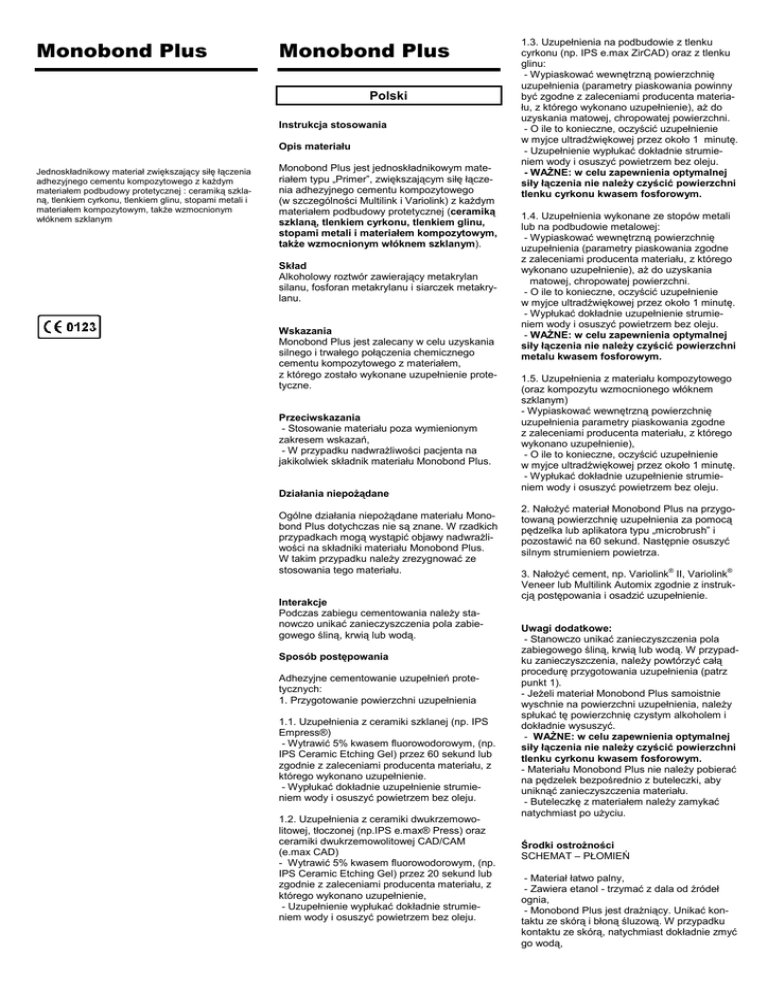 Monobond Plus Monobond Plus Polski Instrukcja stosowania Opis materiału Jednoskładnikowy materiał zwiększający siłę łączenia adhezyjnego cementu kompozytowego z kaŜdym materiałem podbudowy protetycznej : ceramiką szklaną, tlenkiem cyrkonu, tlenkiem glinu, stopami metali i materiałem kompozytowym, takŜe wzmocnionym włóknem szklanym Monobond Plus jest jednoskładnikowym materiałem typu „Primer”, zwiększającym siłę łączenia adhezyjnego cementu kompozytowego (w szczególności Multilink i Variolink) z kaŜdym materiałem podbudowy protetycznej (ceramiką szklaną, tlenkiem cyrkonu, tlenkiem glinu, stopami metali i materiałem kompozytowym, takŜe wzmocnionym włóknem szklanym). Skład Alkoholowy roztwór zawierający metakrylan silanu, fosforan metakrylanu i siarczek metakrylanu. Wskazania Monobond Plus jest zalecany w celu uzyskania silnego i trwałego połączenia chemicznego cementu kompozytowego z materiałem, z którego zostało wykonane uzupełnienie protetyczne. Przeciwskazania - Stosowanie materiału poza wymienionym zakresem wskazań, - W przypadku nadwraŜliwości pacjenta na jakikolwiek składnik materiału Monobond Plus. Działania niepoŜądane Ogólne działania niepoŜądane materiału Monobond Plus dotychczas nie są znane. W rzadkich przypadkach mogą wystąpić objawy nadwraŜliwości na składniki materiału Monobond Plus. W takim przypadku naleŜy zrezygnować ze stosowania tego materiału. Interakcje Podczas zabiegu cementowania naleŜy stanowczo unikać zanieczyszczenia pola zabiegowego śliną, krwią lub wodą. Sposób postępowania Adhezyjne cementowanie uzupełnień protetycznych: 1. Przygotowanie powierzchni uzupełnienia 1.1. Uzupełnienia z ceramiki szklanej (np. IPS Empress®) - Wytrawić 5% kwasem fluorowodorowym, (np. IPS Ceramic Etching Gel) przez 60 sekund lub zgodnie z zaleceniami producenta materiału, z którego wykonano uzupełnienie. - Wypłukać dokładnie uzupełnienie strumieniem wody i osuszyć powietrzem bez oleju. 1.2. Uzupełnienia z ceramiki dwukrzemowolitowej, tłoczonej (np.IPS e.max® Press) oraz ceramiki dwukrzemowolitowej CAD/CAM (e.max CAD) - Wytrawić 5% kwasem fluorowodorowym, (np. IPS Ceramic Etching Gel) przez 20 sekund lub zgodnie z zaleceniami producenta materiału, z którego wykonano uzupełnienie, - Uzupełnienie wypłukać dokładnie strumieniem wody i osuszyć powietrzem bez oleju. 1.3. Uzupełnienia na podbudowie z tlenku cyrkonu (np. IPS e.max ZirCAD) oraz z tlenku glinu: - Wypiaskować wewnętrzną powierzchnię uzupełnienia (parametry piaskowania powinny być zgodne z zaleceniami producenta materiału, z którego wykonano uzupełnienie), aŜ do uzyskania matowej, chropowatej powierzchni. - O ile to konieczne, oczyścić uzupełnienie w myjce ultradźwiękowej przez około 1 minutę. - Uzupełnienie wypłukać dokładnie strumieniem wody i osuszyć powietrzem bez oleju. - WAśNE: w celu zapewnienia optymalnej siły łączenia nie naleŜy czyścić powierzchni tlenku cyrkonu kwasem fosforowym. 1.4. Uzupełnienia wykonane ze stopów metali lub na podbudowie metalowej: - Wypiaskować wewnętrzną powierzchnię uzupełnienia (parametry piaskowania zgodne z zaleceniami producenta materiału, z którego wykonano uzupełnienie), aŜ do uzyskania matowej, chropowatej powierzchni. - O ile to konieczne, oczyścić uzupełnienie w myjce ultradźwiękowej przez około 1 minutę. - Wypłukać dokładnie uzupełnienie strumieniem wody i osuszyć powietrzem bez oleju. - WAśNE: w celu zapewnienia optymalnej siły łączenia nie naleŜy czyścić powierzchni metalu kwasem fosforowym. 1.5. Uzupełnienia z materiału kompozytowego (oraz kompozytu wzmocnionego włóknem szklanym) - Wypiaskować wewnętrzną powierzchnię uzupełnienia parametry piaskowania zgodne z zaleceniami producenta materiału, z którego wykonano uzupełnienie), - O ile to konieczne, oczyścić uzupełnienie w myjce ultradźwiękowej przez około 1 minutę. - Wypłukać dokładnie uzupełnienie strumieniem wody i osuszyć powietrzem bez oleju. 2. NałoŜyć materiał Monobond Plus na przygotowaną powierzchnię uzupełnienia za pomocą pędzelka lub aplikatora typu „microbrush” i pozostawić na 60 sekund. Następnie osuszyć silnym strumieniem powietrza. 3. NałoŜyć cement, np. Variolink® II, Variolink® Veneer lub Multilink Automix zgodnie z instrukcją postępowania i osadzić uzupełnienie. Uwagi dodatkowe: - Stanowczo unikać zanieczyszczenia pola zabiegowego śliną, krwią lub wodą. W przypadku zanieczyszczenia, naleŜy powtórzyć całą procedurę przygotowania uzupełnienia (patrz punkt 1). - JeŜeli materiał Monobond Plus samoistnie wyschnie na powierzchni uzupełnienia, naleŜy spłukać tę powierzchnię czystym alkoholem i dokładnie wysuszyć. - WAśNE: w celu zapewnienia optymalnej siły łączenia nie naleŜy czyścić powierzchni tlenku cyrkonu kwasem fosforowym. - Materiału Monobond Plus nie naleŜy pobierać na pędzelek bezpośrednio z buteleczki, aby uniknąć zanieczyszczenia materiału. - Buteleczkę z materiałem naleŜy zamykać natychmiast po uŜyciu. Środki ostroŜności SCHEMAT – PŁOMIEŃ - Materiał łatwo palny, - Zawiera etanol - trzymać z dala od źródeł ognia, - Monobond Plus jest draŜniący. Unikać kontaktu ze skórą i błoną śluzową. W przypadku kontaktu ze skórą, natychmiast dokładnie zmyć go wodą, - Kontakt ze skórą moŜe w rzadkich przypadkach powodować reakcję nadwraŜliwości na poszczególne składniki materiału, - Tradycyjne rękawiczki nie chronią przed uczulającym działaniem metakrylanów. Warunki przechowywania • • • Materiału Monobond Plus nie stosować po upływie terminu waŜności Temperatura przechowywania 2-280C Data waŜności: umieszczona jest na etykiecie i opakowaniu. Materiał przechowywać w miejscu niedostępnym dla dzieci! Materiał przeznaczony tylko do uŜytku w stomatologii! Data opracowania informacji: 11/ 2008 Producent: Ivoclar Vivadent
