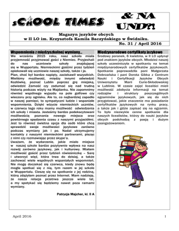 Magazyn języków obcych w II LO im. Krzysztofa Kamila Baczyńskiego w Świdniku. No. 31 / April 2016 Wspomnienia z międzyszkolnej wymiany… Międzynarodowe certyfikaty językowe We wrześniu 2015 roku, nasz szkoła miała przyjemność przyjmować gości z Niemiec. Przyjechali do nas uczniowie szkoły znajdującej się w Wuppertalu. Niemieckimi gośćmi przez tydzień opiekowali się uczniowie naszej szkoły, także i ja. Plan, choć był bardzo napięty, zaciekawił wszystkich. Mieliśmy możliwość, między innymi odwiedzić Kozłówkę, poznać Lublin poprzez grę miejską, odwiedzić Zamość czy zadumać się nad trudną historią podczas wizyty na Majdanku. Nie zapomnimy również wspólnego wyjazdu na pole golfowe czy wieczoru przy ognisku. Ale to, co najbardziej zapadło w naszej pamięci, to sympatyczni ludzie i wspaniałe wspomnienia. Dzięki wizycie niemieckich uczniów, w czerwcu tego roku mamy możliwość odwiedzenia ich szkoły i miasta. Jesteśmy bardzo podekscytowani możliwością poznania nowego miejsca oraz powtórnego spędzenia czasu z naszymi przyjaciółmi. Jest to również świetna opcja dla osób które chcą sprawdzić swoje możliwości językowe zarówno podczas wymiany jak i po. Nadal utrzymujemy kontakty z naszymi niemieckimi partnerami, pisząc z nimi czy rozmawiając przez skype’a. Uważam, że wydarzenie, jakie miało miejsce w naszej szkole bardzo pozytywnie wpływa na nasz rozwój zarówno językowy, jak i kulturowy. Miałam możliwość gościć przez tydzień rówieśniczkę – Sarę i utworzyć więź, która trwa do dzisiaj, a także zachować wiele wspólnych wspaniałych wspomnień. Nie mogę doczekać się czerwca, kiedy znowu będę mogła spotkać się z nią, tym razem w jej szkole w Wuppertalu. Cieszę się na spotkanie z jej rodziną, którą zdążyłam poznać przez Internet. Mam nadzieję, że nasza relacja przetrwa jeszcze wiele lat, a my spotykać się będziemy nawet poza ramami wymiany. Środowy poranek, 6 kwietnia, w II LO upłynął pod znakiem języków obcych. Młodzież naszej szkoły uczestniczyła w spotkaniu na temat międzynarodowych certyfikatów językowych. Spotkanie poprowadziła pani Małgorzata Dobrzańska i pani Dorota Gibka z Centrum Nauki i Certyfikacji Języków Obcych Uniwersytetu Marii Curie-Skłodowskiej w Lublinie. W czasie zajęć licealiści mieli możliwość zdobycia informacji na temat rodzajów i struktury poszczególnych egzaminów językowych, jak się do nich przygotować, jakie znaczenie ma posiadanie certyfikatów językowych na rynku pracy, a także jak i gdzie zapisać się na egzamin. To było niezwykle cenne spotkanie dla naszych licealistów, którzy do nauki języków obcych podchodzą z pasją i dużym zaangażowaniem. Patrycja Majcher, kl. II A April 2016 1 Which US place would you consider to be the most Black box attractive, modern and ecologically friendly to live? „It is wonderful to be here in the great state of Chicago.” Dan C. Quale, 44th Vice President of the United States. Chicago is a metropolis located in 25th state of United States of America, one of the biggest cities in the country. It would be unrealizable for such a big municipality not to posses virtually everything that people can imagine. That is the city we would call an attractive, modern and ecologically-friendly settlement to dwell in. What exactly is so magnetic about Chicago? For instance, you can participate in its annual music festivals, such as Lollapalooza or the Pitchfork Music Festival. For those who are uninterested in music, there is always a chance to see one of the latest and most thought-provoking plays in a theatre. Most popular venues are the Goodman Theatre or the Chicago Shakespeare Theater, where you can immerse into the world of literary wonders. If this kind of entertainment is not your cup of tea, then in Chicago there are still loads of things you can do and see. If you are the type of person that would rather start exploring the city with their taste buds, then it is the place for you as well! Due to the fact that Chicago is home for diverse nationalities, you have a great variety of cuisines to pick out form. The most popular and pleasant-tasting dishes are chicken Vesuvio and Greek saganaki which are served aflame. From lavish cuisine to pizza, one thing is for certain in Chicago: an appetite is required. Nowadays young motorists and newly passed drivers are finding it difficult to obtain affordable car insurance. Providers constantly develop new techniques to make it possible. One of the idea is to install black boxes in their cars and here are some advantages and disadvantages of this gadget. Firstly, those that benefit most from black box insurance are young drivers. The black box technology is designed to reward motorists who drive safely and responsibly. They can experience significant savings over normal car insurance by basing your premium upon your driving ability. Secondly, the box encourages young drivers to drive safely and lowers the risk of an accident. What is more, this technology allows you to find your car all over the world. It is a great opportunity especially if your car has been stolen. That is all thanks to the black boxes that have built-in GPS. In case of getting tired after all the sightseeing of magnificent downtown architecture, you can take your time out in one of many city's vast preserved green spaces. Chicagoans have over 580 parks, dozens of gardens and 8,300 acres of grass, flowers and trees at their disposal. With beaches, ice rinks and an 18.5-mile long bike path, there is plenty of options for active visitors. And finally, you can rest in one of "green-verified" hotels, such as “The Fairmont Chicago” or “Hotel Arista” - independent, locally owned boutique hotels you won't encounter in other parts of the world. On the other hand, teenagers that drive frequently, covering many miles and keeping within the speed limit may not benefit from the 