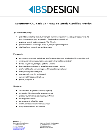 Konstruktor CAD Catia V5 - Praca na terenie Austrii lub Niemiec Opis stanowiska pracy: projektowanie stacji zrobotyzowanych, elementów pojazdów oraz oprzyrządowania dla branży motoryzacyjnej w oparciu o środowisko CAD Catia V5. praca na terenie na terenie Austrii lub Niemiec praca w oparciu o umowę o pracę w pełnym wymiarze godzin siedziba firmy znajduje się we Wrocławiu Wymagania: wyższe wykształcenie techniczne (preferowany kierunek: Mechanika i Budowa Maszyn) minimum trzyletnie doświadczenie w zakresie projektowania CAD biegła znajomość jednego z systemu Catia V5 bardzo dobra znajomość j. angielskiego w mowie i piśmie znajomość języka niemieckiego będzie dodatkowym atutem umiejętność pracy w zespole gotowość do podróży służbowych sumienność i odpowiedzialność prawo jazdy kat. B Oferujemy: zatrudnienie w oparciu o umowę o pracę atrakcyjne i konkurencyjne wynagrodzenie pracę w dynamicznie rozwijającej się firmie atrakcyjne szkolenia dynamiczne środowisko pracy możliwość doskonalenia zawodowego dużą samodzielność w działaniu IBSDesign S.C. Korrespondenzadresse: Al. Kasztanowa 3a-5, 53-125 Wrocław [email protected] www.ibsdesign.pl Adresse für die Rechnungen: ul. Sienkiewicza 37-39/7, 50-349 Wrocław NIP: 898-220-18-90