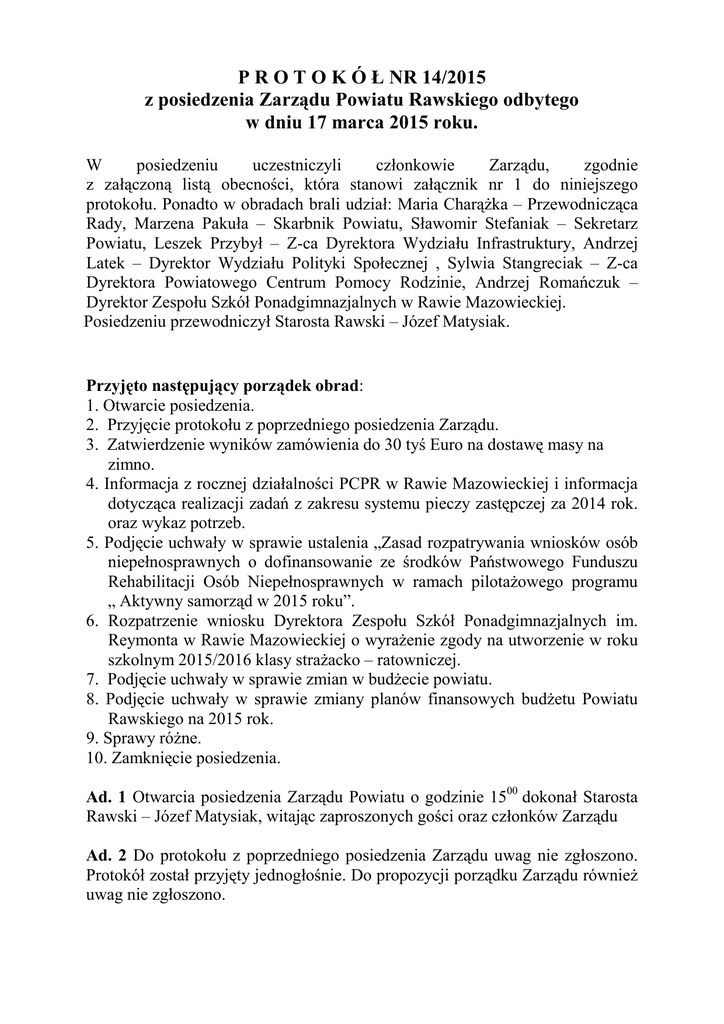 P R O T O K Ó Ł NR 14/2015 z posiedzenia Zarządu Powiatu Rawskiego odbytego w dniu 17 marca 2015 roku. W posiedzeniu uczestniczyli członkowie Zarządu, zgodnie z załączoną listą obecności, która stanowi załącznik nr 1 do niniejszego protokołu. Ponadto w obradach brali udział: Maria Charążka – Przewodnicząca Rady, Marzena Pakuła – Skarbnik Powiatu, Sławomir Stefaniak – Sekretarz Powiatu, Leszek Przybył – Z-ca Dyrektora Wydziału Infrastruktury, Andrzej Latek – Dyrektor Wydziału Polityki Społecznej , Sylwia Stangreciak – Z-ca Dyrektora Powiatowego Centrum Pomocy Rodzinie, Andrzej Romańczuk – Dyrektor Zespołu Szkół Ponadgimnazjalnych w Rawie Mazowieckiej. Posiedzeniu przewodniczył Starosta Rawski – Józef Matysiak. Przyjęto następujący porządek obrad: 1. Otwarcie posiedzenia. 2. Przyjęcie protokołu z poprzedniego posiedzenia Zarządu. 3. Zatwierdzenie wyników zamówienia do 30 tyś Euro na dostawę masy na zimno. 4. Informacja z rocznej działalności PCPR w Rawie Mazowieckiej i informacja dotycząca realizacji zadań z zakresu systemu pieczy zastępczej za 2014 rok. oraz wykaz potrzeb. 5. Podjęcie uchwały w sprawie ustalenia „Zasad rozpatrywania wniosków osób niepełnosprawnych o dofinansowanie ze środków Państwowego Funduszu Rehabilitacji Osób Niepełnosprawnych w ramach pilotażowego programu „ Aktywny samorząd w 2015 roku”. 6. Rozpatrzenie wniosku Dyrektora Zespołu Szkół Ponadgimnazjalnych im. Reymonta w Rawie Mazowieckiej o wyrażenie zgody na utworzenie w roku szkolnym 2015/2016 klasy strażacko – ratowniczej. 7. Podjęcie uchwały w sprawie zmian w budżecie powiatu. 8. Podjęcie uchwały w sprawie zmiany planów finansowych budżetu Powiatu Rawskiego na 2015 rok. 9. Sprawy różne. 10. Zamknięcie posiedzenia. Ad. 1 Otwarcia posiedzenia Zarządu Powiatu o godzinie 1500 dokonał Starosta Rawski – Józef Matysiak, witając zaproszonych gości oraz członków Zarządu Ad. 2 Do protokołu z poprzedniego posiedzenia Zarządu uwag nie zgłoszono. Protokół został przyjęty jednogłośnie. Do propozycji porządku Zarządu również uwag nie zgłoszono. Ad. 3 Zatwierdzenie wyników zamówienia do 30 tyś Euro na dostawę masy na zimno. W tym punkcie Pan Leszek Przybył – Z-ca Dyrektora Wydziału Infrastruktury poinformował, iż w wyniku przeprowadzonego postępowania dotyczącego rozeznania rynkowego poprzez zapytanie ofertowe dotyczące : „Dostawy masy na zimno”, zostało wysłane do 2 dostawców. Najkorzystniejszą ofertę złożyła Firma Rejon Robót Drogowych DROG –BUD Sp. z. o o. 32-565 Alwernia , ul. Krasickiego 18A w cenie ofertowej brutto 47.601,00 zł. za wykonanie dostaw objętych zamówieniem. Zarząd Powiatu zatwierdził wyniki zamówienia. Ad. 4 Informacja z rocznej działalności PCPR w Rawie Mazowieckiej i informacja dotycząca realizacji zadań z zakresu systemu pieczy zastępczej za 2014 rok oraz wykaz potrzeb. W tym punkcie zostały przedłożone Członkom Zarządu, „Informacja z rocznej działalności PCPR w Rawie Mazowieckiej i informacja dotyczącej realizacji zadań z zakresu systemu pieczy zastępczej za 2014 rok, oraz wykaz potrzeb, celem zapoznania się . Przyjęcie w/w informacji nastąpi na jednym z kolejnych posiedzeń Zarządu. Ad. 5 Podjęcie uchwały w sprawie ustalenia „Zasad rozpatrywania wniosków osób niepełnosprawnych o dofinansowanie ze środków Państwowego Funduszu Rehabilitacji Osób Niepełnosprawnych w ramach pilotażowego programu „ Aktywny samorząd w 2015 roku”. Pani Sylwia Stangreciak – Z-ca Dyrektora Powiatowego Centrum Pomocy Rodzinie omówiła projekt uchwały w sprawie ustalenia „Zasad rozpatrywania wniosków osób niepełnosprawnych o dofinansowanie ze środków Państwowego Funduszu Rehabilitacji Osób Niepełnosprawnych w ramach pilotażowego programu „Aktywny samorząd” w 2015 roku. Zarząd Powiatu podjął uchwałę w powyższej kwestii. Uchwała Nr 32/2015, stanowi załącznik nr 2 do protokołu. Ad. 6 Rozpatrzenie wniosku Dyrektora Zespołu Szkół Ponadgimnazjalnych im. Reymonta w Rawie Mazowieckiej o wyrażenie zgody na utworzenie w roku szkolnym 2015/2016 klasy strażacko – ratowniczej. Pan Andrzej Romańczuk – Dyrektor Zespołu Szkół Ponadgimnazjalnych im. Reymonta w Rawie Mazowieckiej zwrócił się z prośbą o wyrażenie zgody na utworzenie w roku szkolnym 2015/2016 klasy strażacko – ratowniczej w Liceum Ogólnokształcącym w ZSP im. Reymonta w Rawie Mazowieckiej. W klasie tej realizowane będą następujące przedmioty w zakresie rozszerzonym: biologia , wiedza o społeczeństwie i język obcy oraz przedmioty uzupełniające tj. : chemia w pożarnictwie, ratownictwo, oraz dodatkowe zajęcia sportowe. Zarząd Powiatu wyraził zgodę na utworzenie w roku szkolnym 2015/2016 klasy strażacko – ratowniczej. Ad. 7 Podjęcie uchwały w sprawie zmian w budżecie powiatu. Zarząd Powiatu jednogłośnie podjął Uchwałę Nr 30/2015, która stanowi załącznik nr 3 do protokołu. Ad. 8 Podjęcie uchwały w sprawie zmiany planów finansowych budżetu Powiatu Rawskiego na 2015 rok. Pani Marzena Pakuła – Skarbnik Powiatu przedstawiła projekt uchwały w sprawie zmiany planów finansowych budżetu Powiatu Rawskiego na 2015 rok. Zarząd Powiatu jednogłośnie podjął uchwałę w powyższej sprawie. Uchwała Nr 31/2015 stanowi załącznik nr 4 do protokołu. Ad. 9 Sprawy różne W sprawach różnych ustalono termin posiedzenia Zarządu na dzień 24.03.2015 roku godz. 1500 , oraz wstępny termin Sesji Rady Powiatu Rawskiego na dzień 17.04.2015 roku godz. 1000 . Ad. 10 Wobec wyczerpania tematów zawartych w przyjętym porządku obrad i braku dalszych głosów w dyskusji Przewodniczący posiedzenia Starosta Rawski – Józef Matysiak dokonał o godzinie 1600 zamknięcia posiedzenia Zarządu Powiatu. W załączeniu: - załączniki wymienione w treści protokołu. Sporządziła : Kinga Kacprzak Zarząd Powiatu: Józef Matysiak St