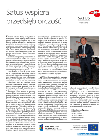 Satus wspiera przedsiębiorczość Otwarcie własnej firmy, szczególnie in- nowacyjnej, zawsze wymaga kapitału startowego. Jednak wielu osób nie stać na wyłożenie środków własnych – wtedy warto pomyśleć o pozyskaniu finansowania zewnętrznego w postaci programów unijnych bądź specjalistycznych funduszy wspierających. Grupą takich funduszy zarządza Satus Venture. Dodatkowym wsparciem jest jedna z największych w Polsce Sieci Aniołów Biznesu. Zadaniem Sieci jest aktywizacja rynku inwestorów prywatnych. Cel ten jest osiągany poprzez tworzenie optymalnych warunków inicjowania współpracy pomiędzy inwestorami a przedsiębiorcami i pomysłodawcami, którzy poszukują środków finansowania na potrzeby realizacji swoich pomysłów i przedsięwzięć w kraju i za granicą. Satus buduje dla swoich spółek pomosty na rynek globalny, poszukując międzynarodowych sojuszy inwestycyjnych. Szuka dobrych pomysłów oraz ludzi o dużym potencjale, którzy mają wiedzę, doświadczenie oraz pomysł na biznes, jaki chcą realizować. Działalność sieci jest również konsekwentnie realizowana poprzez systematycznie organizowane spotkania oraz fora inwestycyjne, na których prezentowane są projekty oczekujące na dofinansowanie. Inwestycje Anioła Biznesu w przedsięwzięcia będące w najwcześniejszych fazach rozwoju obarczone są największym ryzykiem. Z tej perspektywy są swoistym „polem minowym”. Czy zatem mogą stać się prawdziwą szansą na sukces czy wręcz sposobem na życie? Te i inne zagadnienia omówił 20 lutego na spotkaniu „Prawie wszystko o finansach vol 3” Piotr Kupczak Partner Zarządzający, Dyrektor ds. Rozwoju Sieci Inwestorów Prywatnych Satus: „Średnio na 100 projektów tych którymi warto się zająć jest najwyżej 5, a szansę na sukces mają mniej niż 2, będąc cały czas obarczone sporym ryzykiem inwestycyjnym. Niestety w przeciwieństwie do projektów w późniejszych fazach rozwoju sama analiza biznes planu i wskaźników niewiele pomaga. Projekty te do wzrostu wymagają całego sprawnie działającego ekosystemu, w którym mają zapewnione: mentorskie merytoryczne wsparcie łączące wiele kompeten- cji teoretycznych i praktycznych w jednym miejscu, wparcie rynkowe w postaci doświadczonych managerów, dostęp do zespołów i placówek zajmujących się pracami badwczo – rozwojowymi oraz synergię ok. 70-ciu spółek portfelowych. Inwestycje Anioła Biznesu w fazie start-up bez wsparcia efektywnego ekosystemu najczęściej kończą się 100% stratą zainwestowanego kapitału i poświęconego czasu. Specjalnie zaprojektowane dodatkowe instrumenty finansowe + środki UE mają na celu ograniczenie ryzyka inwestora bez jednoczesnego limitowania jego udziału w zyskach. Wypracowane zasady motywowania Aniołów Biznesu do bezpośredniego angażowania się w poszczególne projekty zapewniają ich szybszy wzrost oraz osiągnięcie większej skali działania – co konsekwentnie prowadzi do zwiększenia wartość, powiązań i synergii wszystkich spółek w grupie”. SATUS to Grupa podmiotów zarządzających funduszami seed i venture capital. Grupa powstała w 2005 roku z inicjatywy dwóch krakowskich finansistów: Krzysztofa Bełecha oraz Mariusza Borowca. SATUS zainwestował kwotę 20 mln zł w ramach Funduszu Kapitału Zalążkowego oraz jest w trakcie inwestycji 50 mln zł w ramach funduszu FIZ AN VC Satus, utworzonego wspólnie z Krajowym Funduszem Kapitałowym S.A. Profil działalności SATUS ukierunkowany jest w szczególności na innowacyjne spółki we wczesnej fazie rozwoju, charakteryzujące się najwyższą stopą zwrotu, ale również najwyższym ryzykiem. Grupa łączy w sobie zalety i potencjał funduszy inwestycyjnych zamkniętych, tradycyjnej sieci aniołów biznesu i instytucji naukowo-badawczych. SATUS jest organizatorem całego procesu inwestycyjnego od inkubacji, przez komercjalizację, aż do wykreowania i wyjścia z inwestycji. SATUS wspólnie z instytutami naukowo-badawczymi w Polsce powołał fundusze zalążkowe realizujące pre- inkubację innowacyjnych pomysłów inwestycyjnych – JCI Venture Sp. z o.o., Fundusz Zalążkowy KPT Sp. z o.o. Akcelerator Innowacji NOT Sp. z o.o., Technopark Gliwice, Akcelerator Technologii Fundacja UŁ dysponujące łączną kwotą 80 mln zł. Kolejne 3 fundusze zalążkowe są w trakcie powoływania i będą dysponowały łącznie 40 mln zł. Powyższe projekty eliminują większość ryzyk i sprawiają, że inwestycje Aniołów Biznesu są znacznie bezpieczniejsze. Satus Venture Sp. z o.o. ul. Oleandry 2 30-063 Kraków Tel. (12) 2947215 [email protected] www.satus.pl Inicjatywy Gospodarcze 25