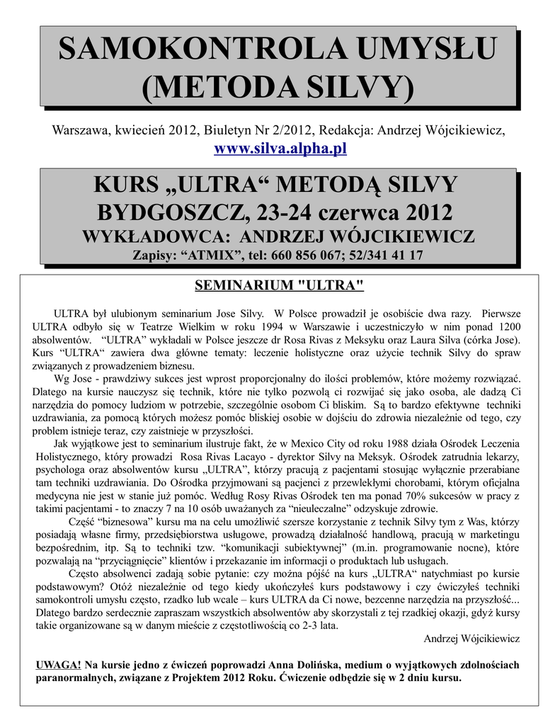 SAMOKONTROLA UMYSŁU (METODA SILVY) Warszawa, kwiecień 2012, Biuletyn Nr 2/2012, Redakcja: Andrzej Wójcikiewicz, www.silva.alpha.pl KURS „ULTRA“ METODĄ SILVY BYDGOSZCZ, 23-24 czerwca 2012 WYKŁADOWCA: ANDRZEJ WÓJCIKIEWICZ Zapisy: “ATMIX”, tel: 660 856 067; 52/341 41 17 SEMINARIUM "ULTRA" ULTRA był ulubionym seminarium Jose Silvy. W Polsce prowadził je osobiście dwa razy. Pierwsze ULTRA odbyło się w Teatrze Wielkim w roku 1994 w Warszawie i uczestniczyło w nim ponad 1200 absolwentów. “ULTRA” wykładali w Polsce jeszcze dr Rosa Rivas z Meksyku oraz Laura Silva (córka Jose). Kurs “ULTRA“ zawiera dwa główne tematy: leczenie holistyczne oraz użycie technik Silvy do spraw związanych z prowadzeniem biznesu. Wg Jose - prawdziwy sukces jest wprost proporcjonalny do ilości problemów, które możemy rozwiązać. Dlatego na kursie nauczysz się technik, które nie tylko pozwolą ci rozwijać się jako osoba, ale dadzą Ci narzędzia do pomocy ludziom w potrzebie, szczególnie osobom Ci bliskim. Są to bardzo efektywne techniki uzdrawiania, za pomocą których możesz pomóc bliskiej osobie w dojściu do zdrowia niezależnie od tego, czy problem istnieje teraz, czy zaistnieje w przyszłości. Jak wyjątkowe jest to seminarium ilustruje fakt, że w Mexico City od roku 1988 działa Ośrodek Leczenia Holistycznego, który prowadzi Rosa Rivas Lacayo - dyrektor Silvy na Meksyk. Ośrodek zatrudnia lekarzy, psychologa oraz absolwentów kursu „ULTRA”, którzy pracują z pacjentami stosując wyłącznie przerabiane tam techniki uzdrawiania. Do Ośrodka przyjmowani są pacjenci z przewlekłymi chorobami, którym oficjalna medycyna nie jest w stanie już pomóc. Według Rosy Rivas Ośrodek ten ma ponad 70% sukcesów w pracy z takimi pacjentami - to znaczy 7 na 10 osób uważanych za “nieuleczalne” odzyskuje zdrowie. Część “biznesowa” kursu ma na celu umożliwić szersze korzystanie z technik Silvy tym z Was, którzy posiadają własne firmy, przedsiębiorstwa usługowe, prowadzą działalność handlową, pracują w marketingu bezpośrednim, itp. Są to techniki tzw. “komunikacji subiektywnej” (m.in. programowanie nocne), które pozwalają na “przyciągnięcie” klientów i przekazanie im informacji o produktach lub usługach. Często absolwenci zadają sobie pytanie: czy można pójść na kurs „ULTRA“ natychmiast po kursie podstawowym? Otóż niezależnie od tego kiedy ukończyłeś kurs podstawowy i czy ćwiczyłeś techniki samokontroli umysłu często, rzadko lub wcale – kurs ULTRA da Ci nowe, bezcenne narzędzia na przyszłość... Dlatego bardzo serdecznie zapraszam wszystkich absolwentów aby skorzystali z tej rzadkiej okazji, gdyż kursy takie organizowane są w danym mieście z częstotliwością co 2-3 lata. Andrzej Wójcikiewicz UWAGA! Na kursie jedno z ćwiczeń poprowadzi Anna Dolińska, medium o wyjątkowych zdolnościach paranormalnych, związane z Projektem 2012 Roku. Ćwiczenie odbędzie się w 2 dniu kursu.