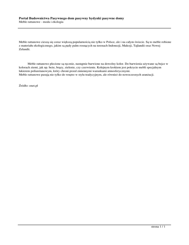 Portal Budownictwa Pasywnego dom pasywny bydynki pasywne domy Meble rattanowe - moda i ekologia Meble rattanowe cieszą się coraz większą popularnością nie tylko w Polsce, ale i na całym świecie. Są to meble robione z materiału ekologicznego, jakim są pędy palm rosnących na terenach Indonezji, Malezji, Tajlandii oraz Nowej Zelandii. Meble rattanowe plecione są ręcznie, następnie barwione na dowolny kolor. Do barwienia używane są bejce w kolorach ziemi, jak np. beże, brązy, zielenie, czy czerwienie. Kolejnym krokiem jest pokrycie mebli specjalnym lakierem poliuretanowym, który chroni przed zmiennymi warunkami atmosferycznymi. Meble rattanowe pasują nie tylko do wnętrz w stylu tradycyjnym, ale również do nowoczesnych aranżacji. Źródło: onet.pl strona 1 / 1