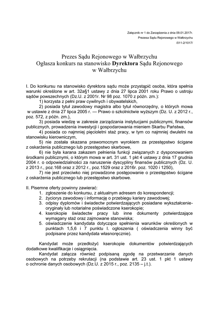 Załącznik nr 1 do Zarządzenia z dnia 09.01.2017r. Prezesa Sądu Rejonowego w Wałbrzychu /011-2/1017/ Prezes Sądu Rejonowego w Wałbrzychu Ogłasza konkurs na stanowisko Dyrektora Sądu Rejonowego w Wałbrzychu I. Do konkursu na stanowisko dyrektora sądu może przystąpić osoba, która spełnia warunki określone w art. 32a§1 ustawy z dnia 27 lipca 2001 roku Prawo o ustroju sądów powszechnych (Dz.U. z 2001r. Nr 98 poz. 1070 z późn. zm.): 1) korzysta z pełni praw cywilnych i obywatelskich, 2) posiada tytuł zawodowy magistra albo tytuł równorzędny, o których mowa w ustawie z dnia 27 lipca 2005 r. — Prawo o szkolnictwie wyższym (Dz. U. z 2012 r., poz. 572, z późn. zm.), 3) posiada wiedzę w zakresie zarządzania instytucjami publicznymi, finansów publicznych, prowadzenia inwestycji i gospodarowania mieniem Skarbu Państwa, 4) posiada co najmniej pięcioletni staż pracy, w tym co najmniej dwuletni na stanowisku kierowniczym, 5) nie została skazana prawomocnym wyrokiem za przestępstwo ścigane z oskarżenia publicznego lub przestępstwo skarbowe, 6) nie była karana zakazem pełnienia funkcji związanych z dysponowaniem środkami publicznymi, o którym mowa w art. 31 ust. 1 pkt 4 ustawy z dnia 17 grudnia 2004 r. o odpowiedzialności za naruszenie dyscypliny finansów publicznych (Dz. U. z 2013 r., poz.168 oraz z 2012 r., poz.1529 oraz z 2016r. poz. 1020 i 1250), 7) nie jest przeciwko niej prowadzone postępowanie o przestępstwo ścigane z oskarżenia publicznego lub przestępstwo skarbowe. II. Pisemne oferty powinny zawierać: 1. zgłoszenie do konkursu, z aktualnym adresem do korespondencji; 2. życiorys zawodowy i informację o przebiegu kariery zawodowej; 3. odpisy dyplomów i świadectw potwierdzających posiadane wykształcenieoryginały lub notarialne poświadczone kserokopie; 4. kserokopie świadectw pracy lub inne dokumenty potwierdzające wymagany staż oraz zajmowane stanowiska; 5. oświadczenie kandydata dotyczące spełnienia warunków określonych w punktach 1,5,6 i 7 punktu I. ogłoszenia ( oświadczenia winny być podpisane przez kandydata własnoręcznie). Kandydat może przedłożyć kserokopie dokumentów potwierdzających dodatkowe kwalifikacje i osiągnięcia. Kandydat załącza również podpisaną zgodę na przetwarzanie danych osobowych na potrzeby rekrutacji (na podstawie art. 23 ust. 1 pkt 1 ustawy o ochronie danych osobowych (Dz.U. z 2015 r., poz. 2135 – j.t.). III. Zakres konkursu i kryteria oceny: Konkurs zostanie przeprowadzony w oparciu o przepisy art. 32a ustawy z dnia 27 lipca 2001r. Prawo o ustroju sądów powszechnych (Dz.U. z 2001r. Nr 98 poz. 1070 z późn. zm.) oraz przepisy rozporządzenia Ministra Sprawiedliwości z dnia 6 grudnia 2012r. w sprawie konkursu na stanowisko dyrektora sądu albo zastępcy dyrektora sądu ( Dz.U. z 2012r., poz. 1418). Konkurs przeprowadzi komisja konkursowa powołana przez Prezesa Sądu Rejonowego w Wałbrzychu. Konkurs składa się z następujących etapów: - etap pierwszy- ocena wiedzy kandydatów na podstawie pisemnego testu w zakresie znajomości przepisów prawa dotyczących finansów publicznych, prawa pracy oraz organizacji i funkcjonowania sądów (test wiedzy), - etap drugi- ocena predyspozycji i umiejętności kandydatów na podstawie pisemnego testu psychologicznego (test psychologiczny), - etap trzeci- przedstawienie przez kandydatów, także w formie pisemnej, koncepcji działania na stanowisku, którego dotyczy konkurs oraz rozmowa kwalifikacyjna. Kryteria oceny kwalifikacji, wiedzy, predyspozycji oraz umiejętności kandydata stanowią kompetencje: 1) zawodowe; 2) kierownicze; 3) społeczne; 4) intelektualne; 5) osobowościowe. Zakres kryteriów oceny, określa załącznik nr 1 i nr 2 do cyt. wyżej rozporządzenia. IV. Termin i miejsce składania ofert: Oferty należy składać w zamkniętych kopertach z dopiskiem „Konkurs na stanowisko dyrektora Sądu Rejonowego w Wałbrzychu sygn.. konkursu Adm.011-2/2017” w nieprzekraczalnym terminie do dnia 26 stycznia 2017r. w Oddziale Kadr Sądu Rejonowego w Wałbrzychu (pokój 15) lub za pośrednictwem operatora świadczącego usługi pocztowe (decyduje data stempla pocztowego) na adres: Sąd Rejonowy Oddział Kadr ul. Słowackiego 10, 58-300 Wałbrzych. Oferty złożone/przesłane po terminie nie będą rozpatrywane. O terminie i miejscu przeprowadzenia konkursu kandydaci poinformowani pisemnie, na adres wskazany w złożonej ofercie. zostaną Prezes Sądu Rejonowego w Wałbrzychu Aleksandra Abramowska-Podlińska