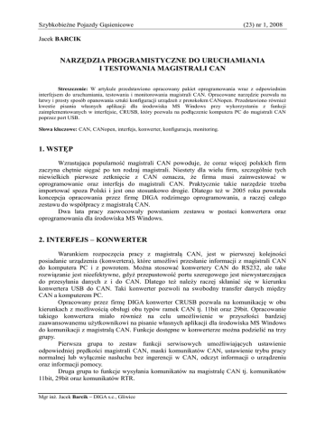 Szybkobieżne Pojazdy Gąsienicowe (23) nr 1, 2008 Jacek BARCIK NARZĘDZIA PROGRAMISTYCZNE DO URUCHAMIANIA I TESTOWANIA MAGISTRALI CAN Streszczenie: W artykule przedstawiono opracowany pakiet oprogramowania wraz z odpowiednim interfejsem do uruchamiania, testowania i monitorowania magistrali CAN. Opracowane narzędzie pozwala na łatwy i prosty sposób opanowania sztuki konfiguracji urządzeń z protokołem CANopen. Przedstawiono również kwestie pisania własnych aplikacji dla środowiska MS Windows przy wykorzystaniu z funkcji zaimplementowanych w interfejsie, CRUSB, który pozwala na podłączenie komputera PC do magistrali CAN poprzez port USB. Słowa kluczowe: CAN, CANopen, interfejs, konwerter, konfiguracja, monitoring. 1. WSTĘP Wzrastająca popularność magistrali CAN powoduje, że coraz więcej polskich firm zaczyna chętnie sięgać po ten rodzaj magistrali. Niestety dla wielu firm, szczególnie tych niewielkich pierwsze zetknięcie z CAN oznacza, że firma musi zainwestować w oprogramowanie oraz interfejs do magistrali CAN. Praktycznie takie narzędzie trzeba importować spoza Polski i jest ono stosunkowo drogie. Dlatego też w 2005 roku powstała koncepcja opracowania przez firmę DIGA rodzimego oprogramowania, a raczej całego zestawu do współpracy z magistralą CAN. Dwa lata pracy zaowocowały powstaniem zestawu w postaci konwertera oraz oprogramowania dla środowiska MS Windows. 2. INTERFEJS – KONWERTER Warunkiem rozpoczęcia pracy z magistralą CAN, jest w pierwszej kolejności posiadanie urządzenia (konwertera), które umożliwi przesłanie informacji z magistrali CAN do komputera PC i z powrotem. Można stosować konwertery CAN do RS232, ale take rozwiązanie jest nieefektywne, gdyż przepustowość portu szeregowego jest niewystarczająca do przesyłania danych z i do CAN. Dlatego też należy raczej skłaniać się w kierunku konwertera USB do CAN. Taki konwerter pozwoli na swobodny transfer danych między CAN a komputerem PC. Opracowany przez firmę DIGA konwerter CRUSB pozwala na komunikację w obu kierunkach z możliwością obsługi obu typów ramek CAN tj. 11bit oraz 29bit. Opracowanie takiego konwertera miało również na celu umożliwienie w przyszłości bardziej zaawansowanemu użytkownikowi na pisanie własnych aplikacji dla środowiska MS Windows do komunikacji z magistralą CAN. Funkcje dostępne w konwerterze można podzielić na trzy grupy. Pierwsza grupa to zestaw funkcji serwisowych umożliwiających ustawienie odpowiedniej prędkości magistrali CAN, maski komunikatów CAN, ustawienie trybu pracy normalnej lub wyłącznie nasłuchu bez ingerencji w CAN, odczyt informacji o urządzeniu oraz informacji pomocy. Druga grupa to funkcje wysyłania komunikatów na magistralę CAN tj. komunikatów 11bit, 29bit oraz komunikatów RTR. Mgr inż. Jacek Barcik – DIGA s.c., Gliwice Jacek BARCIK Trzecia grupa natomiast zawiera zestaw gotowych komend wysłania komunikatów CANopen, takich jak PDO, Sync, Heartbeat, NMT. Użytkownik korzystając z biblioteki DLL może pisać własną aplikację dla środowiska MS Windows np. aplikację konfiguracyjną lub monitorującą dla serwisu. Zestaw komend do komunikacji z konwerterem CRUSB: #?000000000000000 #I000000000000000 #N000000000000000 #M0BBBB0000000000 . BBBB #O000000000000000 #O0BBBB0000000000 . BBBB #B000BB0000000000 . BB . #N000000000000000 #N000BB0000000000 #G0E0000000000000 . E - 0 echo OFF . - 1 echo ON #W000000000000000 #W0B0000000000000 . B - 0 error . 1 OK #L000000000000000 #L0B0000000000000 . B - 0 error . 1 OK #FU00000000000000 #FC00000000000000 #Q000000000000000 #E000000000000000 #E0SERTKY00000000 . S . E . R . T . K . Y FS0IIIILDDDDDDDD0 . IIII . L . DDDDDDDD FE0IIIILDDDDDDDD0 . IIII . L . DDDDDDDD RS0IIII0000000000 - this page - device info - CAN speed info - set CAN mask - value for mask - read CAN mask PC->Dev - CAN mask Dev->PC - returned value for CAN mask - set CAN boudrate - value for boudrate 10,20,50, 100,125,250,500,800,1000 kbit/s - read CAN boudrate PC->Dev - CAN boudrate Dev->PC - CAN echo PC->Dev PC->Dev PC->Dev - save data to flash PC->Dev - save result Dev->PC - load data from flash PC->Dev - load result Dev->PC - clear USB buffer - clear CAN buffer - reset CAN - CAN state PC->Dev - CAN state Dev->PC - state - error limit - Rx error frames - Tx error frames - Rx count - Error code - send 11bit CAN frame - COB-ID - DLC 8 bytes of data - send 29bit CAN frame - COB-ID - DLC 8 bytes of data - send 11bit CAN RTR frame Narzędzia programistyczne do uruchamiania i testowania magistrali CAN . IIII RE0IIII0000000000 . IIII - COB-ID - send 29bit CAN RTR frame - COB-ID CMDx0000000000000 CMSx0000000000000 CMZx0000000000000 CMRx0000000000000 CMVx0000000000000 CMC00000000000000 CHP00000000000000 CHO00000000000000 CHZ00000000000000 CPxLDDDDDDDD00000 .x . L . DDDDDDDD set ID for CRUSB send start x Node send stop x Node send reset x Node send reset cmmunication x Node send SYNCH frame send heartbeat preoperational send heartbeat operational send heartbeat stop - end PDO - PDO numer - DLC - Data Konwerter przewidziany jest do współpracy z narzędziem programowym, jakim jest aplikacja, CANStudio, która daje duże możliwości konfiguracji i monitoringu CAN. Rys. 1 Konwerter CRUSB 3. OPROGRAMOWANIE DO KOMUNIKACJI CAN Obecnie na świecie jest kilku producentów oprogramowania do komunikacji z magistralą CAN. Większość rozwiązań pochodzi z Niemiec, gdzie magistrala CAN jest najbardziej rozpowszechniona. Nie zawsze konieczne jest tak rozbudowane oprogramowanie, jak to, które jest oferowane – w rzeczywistości wystarczy niewiele funkcji, aby móc komunikować się z magistralą CAN. Oprogramowanie CANStudio jest narzędziem, którym użytkownik jest w stanie skonfigurować urządzenie z protokołem CANopen, wczytując odpowiedni plik konfiguracyjny EDS. W pliku tym zapisany jest tak zwany słownik obiektów (ang. Object Dictionary). Wczytując taki plik mamy pełny dostęp do wszystkich reje