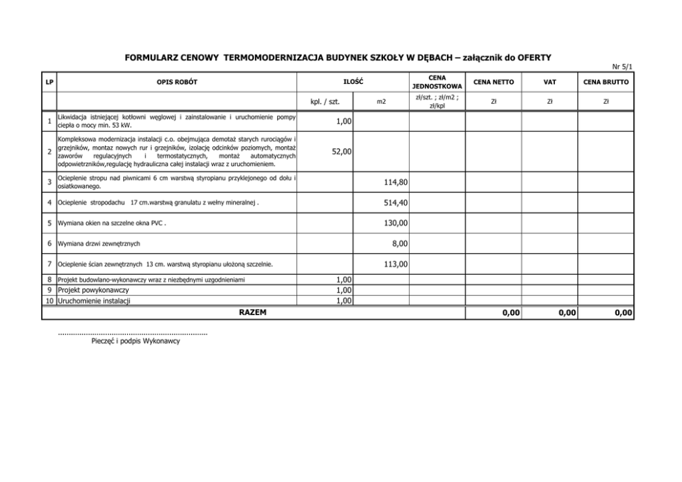 FORMULARZ CENOWY TERMOMODERNIZACJA BUDYNEK SZKOŁY W DĘBACH – załącznik do OFERTY LP ILOŚĆ OPIS ROBÓT kpl. / szt. 1 Likwidacja istniejącej kotłowni węglowej i zainstalowanie i uruchomienie pompy ciepła o mocy min. 53 kW. 1,00 2 Kompleksowa modernizacja instalacji c.o. obejmująca demotaż starych rurociągów i grzejników, montaz nowych rur i grzejników, izolację odcinków poziomych, montaż zaworów regulacyjnych i termostatycznych, montaż automatycznych odpowietrzników,regulację hydrauliczna całej instalacji wraz z uruchomieniem. 52,00 3 Ocieplenie stropu nad piwnicami 6 cm warstwą styropianu przyklejonego od dołu i osiatkowanego. m2 CENA NETTO VAT CENA BRUTTO zł/szt. ; zł/m2 ; zł/kpl Zł Zł Zł 114,80 4 Ocieplenie stropodachu 17 cm.warstwą granulatu z wełny mineralnej . 514,40 5 Wymiana okien na szczelne okna PVC . 130,00 8,00 6 Wymiana drzwi zewnętrznych 113,00 7 Ocieplenie ścian zewnętrznych 13 cm. warstwą styropianu ułożoną szczelnie. 8 Projekt budowlano-wykonawczy wraz z niezbędnymi uzgodnieniami 9 Projekt powykonawczy 10 Uruchomienie instalacji RAZEM ...................................................................... Pieczęć i podpis Wykonawcy Nr 5/1 CENA JEDNOSTKOWA 1,00 1,00 1,00 0,00 0,00 0,00 FORMULARZ CENOWY TERMOMODERNIZACJA BUDYNEK UG W ŁYSYCH – załącznik do OFERTY LP ILOŚĆ OPIS ROBÓT kpl. / szt. 1 Likwidacja istniejącej kotłowni węglowej i zainstalowanie i uruchomienie pompy ciepła o mocy min. 60 kW. 1,00 2 Kompleksowa modernizacja instalacji c.o. obejmująca demotaż starych rurociągów i grzejników, montaz nowych rur i grzejników, izolację odcinków poziomych, montaż zaworów regulacyjnych i termostatycznych, montaż automatycznych odpowietrzników,regulację hydrauliczna całej instalacji wraz z uruchomieniem. 98,00 Modernizacja instalacji ciepłej wody obejmująca podłączenie do nowego źródła 3 ciepła ,montaż nowych rurociągów cyrkulacyjnych , zaworów regulacyjnych oraz uzupełnienie izolacji na leżakach w piwnicy. m2 CENA NETTO VAT CENA BRUTTO zł/szt. ; zł/m2 ; zł/kpl Zł Zł Zł 4,00 4 Ocieplenie stropodachu wentylowanego granulatem wełny mineralnej metodą wdmuchiwania. 31,00 5 Ocieplenie stropodachu pełnego od zewnatrz matami z wełny mineralnej dachowej gr. 16 cm i przykrycie całości dwiema warstwami papy termozgrzewalnej. 91,20 141,30 6 Ocieplenie ścian zewnętrznych poddasza warstwą styropianu gr. 12cm. 33,20 7 Wymiana okien na szczelne okna PVC . 3,00 8 Wymiana drzwi zewnętrznych 9 Ocieplenie ścian zewnętrznych nadziemnych Agronomówki warstwą styropianu gr 12 cm. 252,40 10 Ocieplenie ścian zewnętrznych Agronomówki poniżej gruntu warstwą polistyrenu ekstrudowanego gr 12 cm. 27,90 11 Ocieplenie ścian zewnętrznych nadziemnych Urzedu Gminy warstwą styropianu gr 13 cm. 602,10 12 Ocieplenie ścian zewnętrznych Urzędu Gminy poniżej gruntu warstwą polistyrenu ekstrudowanego gr 13 cm. 128,70 13 Ocieplenie stropu pod nieogrzewanym poddaszem matami z wełny mineralnej gr.15 cm. 331,70 14 Projekt budowlano-wykonawczy wraz z niezbędnymi uzgodnieniami 15 Projekt powykonawczy 16 Uruchomienie instalacji RAZEM ...................................................................... Pieczęć i podpis Wykonawcy Nr 5/2 CENA JEDNOSTKOWA 1,00 1,00 1,00 0,00 0,00 0,00 FORMULARZ CENOWY TERMOMODERNIZACJA BUDYNEK UG W SZAFRANKACH – załącznik do OFERTY LP ILOŚĆ OPIS ROBÓT kpl. / szt. m2 1 Likwidacja istniejących kotłowni : węglowej i olejowej ,zainstalowanie i uruchomienie kotłowni gazowej o mocy min. 62 kW 1,00 2 Kompleksowa modernizacja instalacji c.o. obejmująca demotaż starych rurociągów i grzejników, montaz nowych rur i grzejników, izolację odcinków poziomych, montaż zaworów regulacyjnych i termostatycznych, montaż automatycznych odpowietrzników,regulację hydrauliczna całej instalacji wraz z uruchomieniem. 47,00 3 Ocieplenie stropu nad piwnicami 6 cm warstwą styropianu przyklejonego od dołu i osiatkowanego. 93,00 4 Ocieplenie stropodachu 13 cm warstwą wełny mineralnej dachowej i przykrycie dwoma warstwami papy termozgrzewalnej. 598,00 CENA NETTO VAT CENA BRUTTO zł/szt. ; zł/m2 ; zł/kpl Zł Zł Zł 130,70 7 Wymiana okien na szczelne okna PVC . 3,40 8 Wymiana drzwi zewnętrznych 798,50 9 Ocieplenie ścian zewnętrznych 13 cm. warstwą styropianu ułożoną szczelnie. 10 Projekt budowlano-wykonawczy wraz z niezbędnymi uzgodnieniami 11 Projekt powykonawczy 12 Uruchomienie instalacji RAZEM ...................................................................... Pieczęć i podpis Wykonawcy Nr 5/3 CENA JEDNOSTKOWA 1,00 1,00 1,00 0,00 0,00 0,00 FORMULARZ CENOWY TERMOMODERNIZACJA BUDYNEK UG W WARMIAKU – załącznik do OFERTY LP ILOŚĆ OPIS ROBÓT kpl. / szt. m2 1 Likwidacja istniejącej kotłowni węglowej i zainstalowanie i uruchomienie pompy ciepła o mocy min. 86 kW. 1,00 2 Kompleksowa modernizacja instalacji c.o. obejmująca demotaż starych rurociągów i grzejników, montaz nowych rur i grzejników, izolację odcinków poziomych, montaż zaworów regulacyjnych i termostatycznych, montaż automatycznych odpowietrzników,regulację hydrauliczna całej instalacji wraz z uruchomieniem. 79,00 3 Ocieplenie ścian poddasza ( od strony szkolnego strychu ) 9 cm. warstwą styropianu ułozoną szczelnie. 33,30 4 Ocieplenie stropu pod nieogrzewanym strychem 18 cm. warstwą wełny mineralnej ułożonej szczelnie . 542,00 CENA NETTO VAT CENA BRUTTO zł/szt. ; zł/m2 ; zł/kpl Zł Zł Zł 159,30 5 Wymiana okien na szczelne okna PVC w części szkolnej i mieszkaniowej budynku 3,00 6 Wymiana drzwi zewnętrznych 7 Ocieplenie ścian zewnętrznych przy gruncie i cokołu polistyrenem ekstrudowanym grubości 9 cm oraz wykonanie izolacji wilgociowej. 152,44 8 Ocieplenie ścian zewnętrznych nadziemnych 9 cm warstwą styropianu ułożonego szczelnie 945,50 9 Projekt budowlano-wykonawczy wraz z niezbędnymi uzgodnieniami 10 Projekt powykonawczy 11 Uruchomienie instalacji RAZEM .....