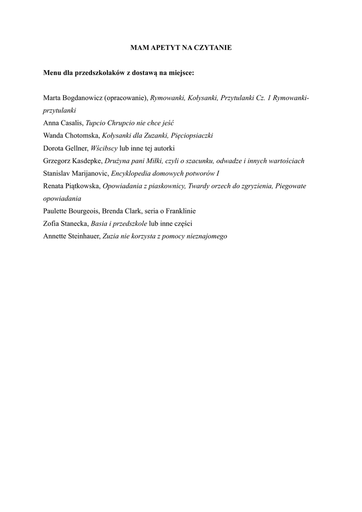MAM APETYT NA CZYTANIE Menu dla przedszkolaków z dostawą na miejsce: Marta Bogdanowicz (opracowanie), Rymowanki, Kołysanki, Przytulanki Cz. 1 Rymowankiprzytulanki Anna Casalis, Tupcio Chrupcio nie chce jeść Wanda Chotomska, Kołysanki dla Zuzanki, Pięciopsiaczki Dorota Gellner, Wścibscy lub inne tej autorki Grzegorz Kasdepke, Drużyna pani Miłki, czyli o szacunku, odwadze i innych wartościach Stanislav Marijanovic, Encyklopedia domowych potworów I Renata Piątkowska, Opowiadania z piaskownicy, Twardy orzech do zgryzienia, Piegowate opowiadania Paulette Bourgeois, Brenda Clark, seria o Franklinie Zofia Stanecka, Basia i przedszkole lub inne części Annette Steinhauer, Zuzia nie korzysta z pomocy nieznajomego