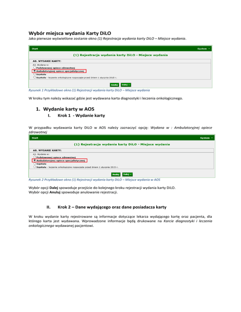 Wybór miejsca wydania Karty DiLO Jako pierwsze wyświetlone zostanie okno (1) Rejestracja wydania karty DiLO – Miejsce wydania. Rysunek 1 Przykładowe okno (1) Rejestracji wydania karty DiLO – Miejsce wydania W kroku tym należy wskazać gdzie jest wydawana karta diagnostyki i leczenia onkologicznego. 1. Wydanie karty w AOS I. Krok 1 - Wydanie karty W przypadku wydawania karty DiLO w AOS należy zaznaczyć opcję: Wydana w : Ambulatoryjnej opiece zdrowotnej Rysunek 2 Przykładowe okno (1) Rejestracji wydania karty DiLO – Miejsce wydania w AOS Wybór opcji Dalej spowoduje przejście do kolejnego kroku rejestracji wydania karty DiLO. Wybór opcji Anuluj spowoduje anulowanie rejestracji. II. Krok 2 – Dane wydającego oraz dane posiadacza karty W kroku wydanie karty rejestrowane są informacje dotyczące lekarza wydającego kartę oraz pacjenta, dla którego karta jest wydawana. Wprowadzone informacje będą drukowane na Karcie diagnostyki i leczenia onkologicznego wydawanej pacjentowi. Rysunek 3 Przykładowe okno (1) Rejestracji wydania karty DiLO – Wydanie karty w AOS Wszystkie pola oznaczone * (gwiazdką) są polami wymaganymi. AB.1 Lekarz wydający kartę W przypadku, gdy wydanie rejestrowane jest przez lekarza, część Lekarz wydający kartę zostanie uzupełniona na podstawie danych konta dostępowego. W przypadku, gdy wydanie rejestrowane jest przez operatora świadczeniodawcy, część Lekarz wydający kartę należy uzupełnić ręcznie wpisując imię, nazwisko oraz numer prawa wykonywania zawodu lekarza. Lekarz wskazany w rejestracji wydania karty musi być zarejestrowany w bazie OW NFZ oraz wykazany w potencjale świadczeniodawcy do umowy z NFZ, w ramach której nastąpi sprawozdanie wydania karty DiLO. AC. Informacje o posiadaczu karty W części Informacje o posiadaczu katy należy wprowadzić dane pacjenta, dla którego wydawana jest karta. Pola dostępne do uzupełnienia mogą się dynamicznie zmieniać w zależności od wybranych opcji. Dane osobowe pacjenta [AC.1.] Uzupełnienie informacji dla osoby dorosłej, zdolnej do świadomego wyrażania zgody Rejestracja danych pacjenta w części AC.1. wymaga wprowadzenia: o Nazwiska i imienia pacjenta o Typu identyfikatora, którym posługuje się pacjent: 1. PESEL 2. PIN (Personal Identyfication Number) uzupełniany w przypadku uprawnionych do świadczeń na podstawie przepisów o koordynacji 3. Dowód osobisty – seria i numer 4. Paszport – seria i numer 5. Inny dokument – seria i numer pacjentów Jeśli pacjent jest Polakiem i ma nadany numer PESEL należy wybrać PESEL jako typ identyfikatora o Wskazanie typu identyfikatora 2-5 spowoduje uaktywnienie dodatkowych pól do uzupełnienia (data urodzenia, płeć pacjenta) Wartość identyfikatora – w polu tym należy wpisać identyfikator pacjenta, np.: PESEL Wartość identyfikatora pacjenta w wydanej karcie powinna być zgodna z identyfikatorem pacjenta wykazywanym w komunikacie statystycznym z realizacji umowy z NFZ. o Rejestracja danych adresowych - adres miejsca zamieszkania pacjenta W przypadku, gdy pacjent mieszka poza granicami Polski należy zaznaczyć opcję Pacjent nie posiada adresu zamieszkania na terytorium Polski. Zaznaczenie opcji wymaga podania kodu państwa, w którym mieszka pacjent. W danych adresowych należy uzupełnić pola wymagane: kod pocztowy, miejscowości, ulica (jeśli występuje w adresie), numer domu, numer lokalu (jeśli występuje w adresie). Uzupełnienie pola miejscowość (na terytorium Polski) wymaga wprowadzenia przynajmniej trzech pierwszych znaków nazwy miejscowości i wybrania nazwy z wyświetlanego słownika. Im więcej znaków, tym dokładniej podpowiadany jest słownik. Jeśli nazwa nie zostanie wybrana ze słownika i system nie wykryje jednoznacznej zgodności wprowadzonej nazwy z nazwą pozycji słownikowej, pole zostanie oznaczone jako błędnie uzupełnione. Uzupełnienie informacji dla osoby małoletniej, całkowicie ubezwłasnowolnionej lub niezdolnej do świadomego wyrażania zgody W przypadku osób małoletnich uzupełnienie formularza danych osobowych wymaga zaznaczenia opcji Pacjent jest osobą małoletnią, całkowicie ubezwłasnowolnioną lub niezdolną do świadomego wyrażenia zgody. W efekcie zaznaczenia opcji wymaganą do uzupełnienia będzie część Dane przedstawiciela ustawowego albo opiekuna faktycznego (AC.2.). Dane personalne i adresowe uzupełnia się analogicznie do uzupełniania danych dla osoby dorosłej. Uzupełnienie informacji dla noworodka W przypadku noworodków uzupełniając część AC.1. konieczne jest zaznaczenie opcji: o Pacjent jest osobą małoletnią, całkowicie ubezwłasnowolnioną lub niezdolną do świadomego wyrażenia zgody o Wystawiono noworodkowi W efekcie zaznaczenia opcji dodatkowo wymagane do uzupełnienia będą pola: A13. Numer kolejny noworodka, A14. Data urodzenia (pacjenta), A15. Płeć (pacjenta) oraz część Dane przedstawiciela ustawowego albo opiekuna faktycznego (AC.2.). Dane osobowe pacjenta wymagają wprowadzenia: o Imienia i nazwiska pacjenta o Typu identyfikatora oraz wartości identyfikatora opiekuna o Danych adresowych pacjenta Rysunek 4 Przykładowe okno Danych osobowych pacjenta - noworodek AC.2. Dane przedstawiciela ustawowego albo opiekuna faktycznego Część Dane przedstawiciela ustawowego są wymagane w przypadku osób małoletnich, całkowicie ubezwłasnowolnionych lub niezdolnych do samodzielnego udzielenia zgody. Wymagane jest uzupełnienie pól: Imię , Nazwisko oraz sekcji zawierającej dane adresowe przedstawiciela. Rysunek 5 Przykładowe okno Danych przedstawiciela ustawowego Dodatkowe informacje: W przypadku, gdy dane adresowe przedstawiciela są takie same jak dane pacjenta należy zaznaczyć opcję Adres pacjenta oraz przedstawiciela ustawowego lub opiekuna faktycznego są takie same. Jeśli przedstawiciel ustawowy ma adres zamieszkania poza terytorium polski należy zaznaczyć opcję Przedstawiciel ustawowy albo opiekun faktyczny ni