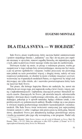EUGENIO MONTALE DLA ITALA SVEVA — W HOŁDZIE* Italo Svevo, pisarz współczesny, który zaczyna budzić zainteresowanie i podziw niejednego literata i „italianisty” zza Alp i do tej pory jest zupeł− nie nieznany w ojczyźnie, stanowi zagadkę literacką, nie najmniejszą zgoła z tych, jakie ta pierwsza ćwierć naszego wieku ma nam do zaoferowania. Dziwnym wydać się może, że pisząc o rodzimym pisarzu, trzeba go zaopatrywać w tego rodzaju listy uwierzytelniające, niezręczne być może, a już na pewno ogólnikowe i niejasne; ważkie przyczyny nie pozwalają nam jednak na razie powiedzieć więcej; z drugiej strony, należy od razu rozproszyć podejrzenie, że chodzić tu może o kolejny imaginary portrait, wzorowany na wspaniałych modelach Patera, co sugerować by mógł cień skrywający nie tylko dzieło, ale i nazwisko powieściopisarza który każe się nazywać Italo Svevo. Ten pisarz, dla którego kapryśna Sława nie nadużyła, ba, nawet nie zbliżyła do ust swego rogu, jest naprawdę osobą z krwi i kości, więcej, jed− ną z najkonkretniejszych i najbardziej znaczących postaci literackich na− szych czasów. Znaczących, bo Svevo, jak niewielu innych, odzwierciedla impulsy i dewiacje duszy współczesnego człowieka, ale, co najbardziej za− skakujące, pokazuje je w sposób naturalny, będący efektem sztuki, a nie profetycznych czy polemicznych ambicji. Rzadko widuje się u nas pisarza w równym stopniu pozbawionego instynktów kaznodziejskich i moraliza− torskich. Dla Itala Sveva świat twórczości estetycznej jest najwyraźniej światem samym w sobie i rządzące nim prawa poza tą strefą giną. Innymi słowy, aktualność Sveva jest aktualnością każdego prawdziwego artysty i trzeba ją rozumieć jako jego siłę wewnętrzną, a nie program. Nadal cały * Eugenio Montale / Italo Svevo, Lettere con gli scritti di Montale su Svevo. Bari, De Donato, 1966, s. 93–112. Szkic ten, ogłoszony w roku 1925 w piśmie „L’Esame” nr 11–12, zapoczątkował literacką sławę Sveva we Włoszech. 51 Eugenio Montale Dla Itala Sveva — w hołdzie i zdrowy, choć już niemłody, Svevo obdarzy nas jeszcze, być może, inny− mi owocami swego talentu; taką mamy przynajmniej nadzieję; ale nie zda− rzy się nigdy, by ze stronic jego powieści przemawiały postaci wyjątkowe, upozowane na symbole i brzemienne w proroctwa. To ta właśnie siła spontaniczna i szczera, ta zgodność obietnic z rezultatami, stanowią naj− ważniejszy walor jego książek. W tym pisarzu — a narodził się, gdy dogo− rywała mistyczno−erotyczna powieść Fogazzara, i nasza proza narracyjna nie zdążyła się jeszcze zagubić w bogactwie dannuncjańskich dwuznacz− ności, z których wyszła podzielona na twórczość komercyjną i mieszczań− ską, z jednej; specyficzną i niezwykłą (autorzy piszący dialektem lub ab− strakcyjni i „metafizyczni”), z drugiej strony — odradza się dawny i za− wsze rzadki rodzaj sztuki zrodzonej z inspiracji, z ludzką twarzą i sercem, posługującej się formą prostą, niekiedy ubogą. Mowa tu o latach dziś już odległych: 1893, 1898! Nasze rozważania nie dotyczą zatem nielicznych pisarzy dążących do osiągnięcia podobnych rezultatów dzisiaj. Można by również powiedzieć, że Svevo dał nam przynajmniej jedną z powieści o życiu i psychologii mieszczaństwa, takich, jakie próbował tworzyć Verga, zanim znalazł własną drogę w owej epopei chłopskiej, którą pewni pisarze, ze zmiennym szczęściem, po dziś dzień naśladują. Ten pobieżny schemat, który nie pretenduje oczywiście do objęcia ca− łej włoskiej literatury współczesnej, pomoże zrozumieć, jaka, naszym zdaniem, jest sytuacja Itala Sveva. Ktoś mógłby tu nie bez racji pomyśleć również o powieściach Orianiego. Ale choć dzieło Sveva jest skromniej− sze objętościowo, a jego postać uboższa w znaczenia, które by wykracza− ły poza nakreślone przez nas ramy, natura autora Jednego życia, Starości i Zena Cosini jest bardziej przejrzysta i bardziej nam bliska pod względem wymowy i wrażenia, jakie w nas budzą, a które dalej postaramy się bliżej określić. A teraz przejdźmy do właściwego tematu naszych rozważań. Powieści Una vita [Jedno życie] i Senilità [Starość] ukazały się kolej− no w latach 1893 i 1898 w triesteńskim wydawnictwie Ettore Vram; nie wydrukowano na nich ceny, noszą jedynie napis: Magazyn Królewski Bracia Drucker, Padwa. Trzecia powieść, La coscienza di Zeno [Zeno Cosini], wydana została przez bolońską oficynę Cappelli w 1923 i jest łatwiejsza do zdobycia. Między dwiema ostatnimi upłynęło zatem dwa− dzieścia pięć lat! Kolejny drobny, lecz znaczący problem, do którego wrócimy, z pełnym, rzecz jasna, poszanowaniem powściągliwości Sveva. Jedno życie jest obszerną powieścią obejmującą kilka pierwszoplanowych wątków, z których, jak się zdaje, żaden nie ma roli wiodącej: mamy tam temat edukacji sentymentalnej, doublée studium katastrofalnego przypad− ku przeniesienia się ze wsi do miasta. Mamy również bardzo drobiazgo− wą i precyzyjną analizę środowiska urzędniczego. Jakby tego nie było 52 Eugenio Montale Dla Itala Sveva — w hołdzie dosyć, autor odmalowuje życie domowe ubogiej drobnomieszczańskiej rodziny i pełen szczegółów „powrót syna marnotrawnego” do rodzinnego miasteczka. Jeśli dodamy, że bohater powieści, Alfonso Nitti, jest romantycznym chłopcem, niezdolnym do życia i podejmowania decyzji, zdominowanym przez „sprawy, które go przerastają” i niszczą, stanie się jasne, że Jedno życie jest przede wszystkim książką odważną. Pomoże to zrozumieć krótkie streszczenie. Ale trzeba z góry uprzedzić, że Svevo, co dla każdego, kto prześledził poprzednie uwagi o naturze jego sztuki, musiało stać się jasne, jest pisarzem niemożliwym do streszczenia. Dwudziestoletni Alfonso Nitti, ubogi w pienią