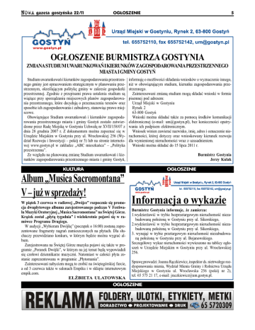 NOWA gazeta gostyñska 22/11 OG£OSZENIE 5 OG£OSZENIE BURMISTRZA GOSTYNIA ZMIANA STUDIUM UWARUNKOWAÑ I KIERUNKÓW ZAGOSPODAROWANIA PRZESTRZENNEGO MIASTA I GMINY GOSTYÑ Studium uwarunkowañ i kierunków zagospodarowania przestrzennego gminy jest opracowaniem strategicznym w planowaniu przestrzennym, okrelaj¹cym politykê gminy w zakresie gospodarki przestrzennej. Zgodnie z przepisami prawa ustalenia studium s¹ wi¹¿¹ce przy sporz¹dzaniu miejscowych planów zagospodarowania przestrzennego, które decyduj¹ o przeznaczeniu terenów oraz sposobie ich zagospodarowania i zabudowy, stanowi¹c prawo miejscowe. Obowi¹zuj¹ce Studium uwarunkowañ i kierunków zagospodarowania przestrzennego miasta i gminy Gostyñ zosta³o zatwierdzone przez Radê Miejsk¹ w Gostyniu Uchwa³¹ nr XVII/158/07 z dnia 28 grudnia 2007 r. Z dokumentem mo¿na zapoznaæ siê w Urzêdzie Miejskim w Gostyniu przy ul. Wroc³awskiej 256 (Wydzia³ Rozwoju i Inwestycji pokój nr 5) lub na stronie internetowej www.gostyn.pl w zak³adce ABC mieszkañca Polityka przestrzenna. Ze wzglêdu na planowan¹ zmianê Studium uwarunkowañ i kierunków zagospodarowania przestrzennego miasta i gminy Gostyñ, Fot. archiwum informujê o mo¿liwoci sk³adania wniosków o wyznaczenie innego, ni¿ w obowi¹zuj¹cym studium, kierunku zagospodarowania przestrzennego. Zainteresowani zmian¹ studium mog¹ sk³adaæ wnioski w formie pisemnej pod adresem: Urz¹d Miejski w Gostyniu Rynek 2 63-800 Gostyñ Wnioski mo¿na sk³adaæ tak¿e za pomoc¹ rodków komunikacji elektronicznej (e-mail: [email protected]), bez koniecznoci opatrywania ich podpisem elektronicznym. Wniosek winien zawieraæ nazwisko, imiê, adres i oznaczenie nieruchomoci, której dotyczy oraz wnioskowany kierunek rozwoju dla wymienionej nieruchomoci wraz z uzasadnieniem. Wnioski mo¿na sk³adaæ do 15 lipca 2011 r. KULTURA OG£OSZENIE Album Musica Sacromontana V ju¿ w sprzeda¿y! W pi¹tek 3 czerwca w radiowej Dwójce rozpocznie siê promocja dwup³ytowego albumu zarejestrowanego podczas V Festiwalu Muzyki Oratoryjnej Musica Sacromontana na wiêtej Górze. Kr¹¿ek zosta³ p³yt¹ tygodnia i wielokrotnie pojawi siê w ramówce Programu Drugiego. W audycji Wybieram Dwójkê (pocz¹tek o 16:00) zostan¹ zaprezentowane fragmenty nagrañ zamieszczonych na p³ytach. Dla s³uchaczy przewidziano konkurs, w którym bêdzie mo¿na wygraæ album. Zarejestrowana na wiêtej Górze muzyka pojawi siê tak¿e w programie Poranek Dwójki, w którym na jej temat bêd¹ wypowiadali siê czo³owi dziennikarze muzyczni. Natomiast w ca³oci p³yta zostanie zaprezentowana w programie P³ytomania. Zainteresowani nabyciem mog¹ to zrobiæ na wiêtogórskiej furcie, a od 3 czerwca tak¿e w salonach Empiku i w sklepie internetowym empik.com. EL¯BIETA ULATOWSKA Burmistrz Gostynia Jerzy Kulak Informacja o wykazie Burmistrz Gostynia informuje, ¿e zamierza: 1.wydzier¿awiæ w trybie bezprzetargowym nieruchomoæ niezabudowan¹ po³o¿on¹ w Gostyniu przy ul. Sikorskiego, 2.wydzier¿awiæ w trybie bezprzetargowym nieruchomoæ niezabudowan¹ po³o¿on¹ w Gostyniu przy ul. Sikorskiego, 3. wynaj¹æ w trybie przetargowym nieruchomoæ niezabudowan¹ po³o¿on¹ w Gostyniu przy ul. Bojanowskiego. Szczegó³owy wykaz nieruchomoci wywieszono na tablicy og³oszeñ w Urzêdzie Miejskim w Gostyniu przy ul. Wroc³awskiej 256. Sprawê prowadzi: Joanna R¹czkiewicz, inspektor ds. nietrwa³ego rozdysponowania mienia, Wydzia³ Mienia Gminy i Rolnictwa Urzêdu Miejskiego w Gostyniu ul. Wroc³awska 256 (pokój nr 2), tel. 65 575 21 17, e-mail: [email protected]. OG£OSZENIE