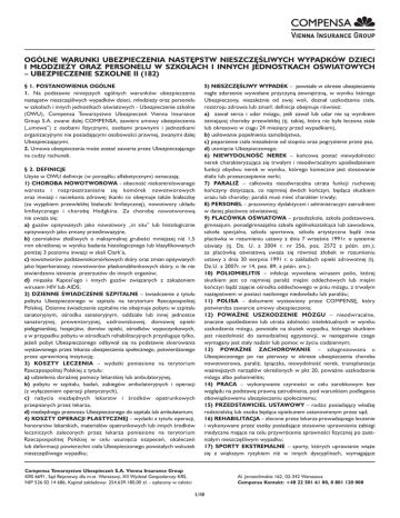 OGÓLNE WARUNKI UBEZPIECZENIA NASTĘPSTW NIESZCZĘŚLIWYCH WYPADKÓW DZIECI I MŁODZIEśY ORAZ PERSONELU W SZKOŁACH I INNYCH JEDNOSTKACH OŚWIATOWYCH – UBEZPIECZENIE SZKOLNE II (182) § 1. POSTANOWIENIA OGÓLNE 1. Na podstawie niniejszych ogólnych warunków ubezpieczenia następstw nieszczęśliwych wypadków dzieci, młodzieŜy oraz personelu w szkołach i innych jednostkach oświatowych - Ubezpieczenie szkolne (OWU), Compensa Towarzystwo Ubezpieczeń Vienna Insurance Group S.A. zwane dalej COMPENSA, zawiera umowy ubezpieczenia („umowa”) z osobami fizycznymi, osobami prawnymi i jednostkami organizacyjnymi nie posiadającymi osobowości prawnej, zwanymi dalej Ubezpieczającymi. 2. Umowa ubezpieczenia moŜe zostać zawarta przez Ubezpieczającego na cudzy rachunek. § 2. DEFINICJE UŜyte w OWU definicje (w porządku alfabetycznym) oznaczają: 1) CHOROBA NOWOTWOROWA - obecność niekontrolowanego wzrostu i rozprzestrzeniania się komórek nowotworowych oraz inwazji i naciekania zdrowej tkanki co obejmuje takŜe białaczkę (za wyjątkiem przewlekłej białaczki limfatycznej), nowotwory układu limfatycznego i chorobę Hodgkina. Za chorobę nowotworową nie uwaŜa się: a) guzów opisywanych jako nowotwory „in situ” lub histologicznie opisywanych jako zmiany przedinwazyjne, b) czerniaków złośliwych o maksymalnej grubości mniejszej niŜ 1,5 mm określonej w wyniku badania histologicznego lub klasyfikowanych poniŜej 3 poziomu inwazji w skali Clark’a, c) nowotworów podstawnokomórkowych skóry oraz zmian opisywanych jako hiperkeratozy, nowotworów płaskonabłonkowych skóry, o ile nie stwierdzono istnienia przerzutów do innych organów; d) mięsaka Kaposi’ego i innych guzów związanych z zakaŜeniem wirusem HIV lub AIDS; 2) DZIENNE ŚWIADCZENIE SZPITALNE – świadczenie z tytułu pobytu Ubezpieczonego w szpitalu na terytorium Rzeczpospolitej Polskiej. Dzienne świadczenie szpitalne nie obejmuje pobytu w szpitalu sanatoryjnym, ośrodku sanatoryjnym, oddziale lub innej jednostce sanatoryjnej, prewentoryjnej, uzdrowiskowej, domowej opieki pielęgniarskiej, hospicjów, domów opieki, ośrodków wypoczynkowych, a w przypadku pobytu w ośrodkach rehabilitacyjnych przysługuje tylko, jeŜeli pobyt Ubezpieczonego odbywał się na podstawie skierowania wystawionego przez lekarza ubezpieczenia społecznego, potwierdzonego przez uprawnioną instytucję; 3) KOSZTY LECZENIA – wydatki poniesione na terytorium Rzeczpospolitej Polskiej z tytułu: a) udzielenia doraźnej pomocy lekarskiej lub ambulatoryjnej, b) pobytu w szpitalu, badań, zabiegów ambulatoryjnych i operacji (z wyłączeniem operacji plastycznych), c) nabycia niezbędnych lekarstw i środków opatrunkowych przepisanych przez lekarza, d) niezbędnego przewozu Ubezpieczonego do szpitala lub ambulatorium; 4) KOSZTY OPERACJI PLASTYCZNEJ – wydatki z tytułu operacji, honorariów lekarskich, materiałów opatrunkowych lub innych środków leczniczych zaleconych przez lekarza poniesione na terytorium Rzeczpospolitej Polskiej w celu usunięcia oszpeceń, okaleczeń lub deformacji powierzchni ciała Ubezpieczonego powstałych wskutek nieszczęśliwego wypadku; 5) NIESZCZĘŚLIWY WYPADEK – powstałe w okresie ubezpieczenia nagłe zdarzenie wywołane przyczyną zewnętrzną, w wyniku którego Ubezpieczony, niezaleŜnie od swej woli, doznał uszkodzenia ciała, rozstroju zdrowia lub zmarł; definicja obejmuje równieŜ: a) zawał serca i udar mózgu, jeśli zawał lub udar nie są wynikiem istniejącej choroby przewlekłej (tj. takiej, która nie była leczona stale lub okresowo w ciągu 24 miesięcy przed wypadkiem), b) usiłowanie popełnienia samobójstwa, c) poparzenie ciała niezaleŜnie od stopnia oraz pogryzienie przez psa, d) utonięcie Ubezpieczonego; 6) NIEWYDOLNOŚĆ NEREK – końcowa postać niewydolności nerek charakteryzująca się trwałym i nieodwracalnym upośledzeniem funkcji obydwu nerek w wyniku, którego konieczne jest stosowanie dializ lub przeszczepienie nerki; 7) PARALIś – całkowita nieodwracalna utrata funkcji ruchowej kończyny dotycząca, co najmniej dwóch kończyn, będąca skutkiem urazu lub choroby; paraliŜ musi mieć charakter trwały; 8) PERSONEL – pracownicy dydaktyczni i administracyjni zatrudnieni w danej placówce oświatowej; 9) PLACÓWKA OŚWIATOWA – przedszkole, szkoła podstawowa, gimnazjum, ponadgimnazjalna szkoła ogólnokształcąca lub zawodowa, szkoła specjalna, szkoła sportowa, szkoła artystyczna bądź inna placówka w rozumieniu ustawy z dnia 7 września 1991r. o systemie oświaty (tj. Dz. U. z 2004 r. nr 256, poz. 2572 z późn. zm.); za placówkę oświatową uwaŜa się równieŜ Ŝłobek w rozumieniu ustawy z dnia 30 sierpnia 1991 r. o zakładach opieki zdrowotnej (tj. Dz.U. z 2007r. nr 14, poz. 89, z późn. zm.); 10) POLIOMIELITIS – infekcja wywołana wirusem polio, której skutkiem jest co najmniej paraliŜ mięśni oddechowych lub mięśni kończyn bądź zajęcie ośrodka oddechowego w pniu mózgu, z trwałym następstwem w postaci nasilonego niedowładu lub paraliŜu; 11) POLISA – dokument wystawiony przez COMPENSĘ, który potwierdza zawarcie umowy ubezpieczenia; 12) POWAśNE USZKODZENIE MÓZGU – nieodwracalne, znaczne upośledzenie lub utrata zdolności intelektualnych w wyniku uszkodzenia mózgu, powstałe na skutek wypadku, którego skutkiem jest niezdolność do samodzielnej egzystencji, w następstwie czego wymagany jest stały nadzór lub pomoc w Ŝyciu codziennym; 13) POWAśNE ZACHOROWANIE – zdiagnozowana u Ubezpieczonego po raz pierwszy w okresie ubezpieczenia choroba nowotworowa, paraliŜ, śpiączka, niewydolność nerek, transplantacja waŜniejszych narządów określonych w pkt 20, powaŜne uszkodzenie mózgu albo poliomielitis; 14) PRACA – wykonywanie czynności w celu zarobkowym bez względu na podstawę prawną zatrudnienia, pod warunkiem podlegania obowiązkowemu ubezpieczeniu społecznemu; 15) PRZEDSTAWICIEL USTAWOWY – rodz