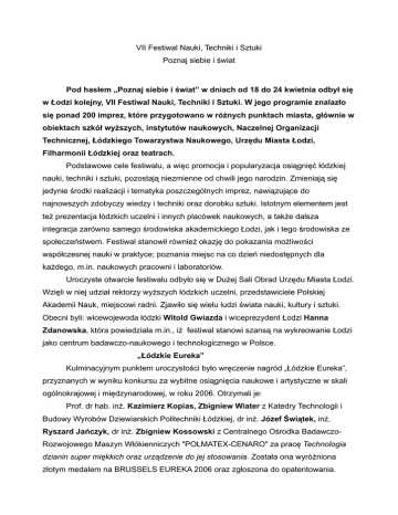 VII Festiwal Nauki, Techniki i Sztuki Poznaj siebie i świat Pod hasłem „Poznaj siebie i świat” w dniach od 18 do 24 kwietnia odbył się w Łodzi kolejny, VII Festiwal Nauki, Techniki i Sztuki. W jego programie znalazło się ponad 200 imprez, które przygotowano w różnych punktach miasta, głównie w obiektach szkół wyższych, instytutów naukowych, Naczelnej Organizacji Technicznej, Łódzkiego Towarzystwa Naukowego, Urzędu Miasta Łodzi, Filharmonii Łódzkiej oraz teatrach. Podstawowe cele festiwalu, a więc promocja i popularyzacja osiągnięć łódzkiej nauki, techniki i sztuki, pozostają niezmienne od chwili jego narodzin. Zmieniają się jedynie środki realizacji i tematyka poszczególnych imprez, nawiązujące do najnowszych zdobyczy wiedzy i techniki oraz dorobku sztuki. Istotnym elementem jest też prezentacja łódzkich uczelni i innych placówek naukowych, a także dalsza integracja zarówno samego środowiska akademickiego Łodzi, jak i tego środowiska ze społeczeństwem. Festiwal stanowił również okazję do pokazania możliwości współczesnej nauki w praktyce; poznania miejsc na co dzień niedostępnych dla każdego, m.in. naukowych pracowni i laboratoriów. Uroczyste otwarcie festiwalu odbyło się w Dużej Sali Obrad Urzędu Miasta Łodzi. Wzięli w niej udział rektorzy wyższych łódzkich uczelni, przedstawiciele Polskiej Akademii Nauk, miejscowi radni. Zjawiło się wielu ludzi świata nauki, kultury i sztuki. Obecni byli: wicewojewoda łódzki Witold Gwiazda i wiceprezydent Łodzi Hanna Zdanowska, która powiedziała m.in., iż festiwal stanowi szansą na wykreowanie Łodzi jako centrum badawczo-naukowego i technologicznego w Polsce. „Łódzkie Eureka” Kulminacyjnym punktem uroczystości było wręczenie nagród „Łódzkie Eureka”, przyznanych w wyniku konkursu za wybitne osiągnięcia naukowe i artystyczne w skali ogólnokrajowej i międzynarodowej, w roku 2006. Otrzymali je: Prof. dr hab. inż. Kazimierz Kopias, Zbigniew Wiater z Katedry Technologii i Budowy Wyrobów Dziewiarskich Politechniki Łódzkiej, dr inż. Józef Świątek, inż. Ryszard Jańczyk, dr inż. Zbigniew Kossowski z Centralnego Ośrodka BadawczoRozwojowego Maszyn Włókienniczych "POLMATEX-CENARO" za pracę Technologia dzianin super miękkich oraz urządzenie do jej stosowania. Została ona wyróżniona złotym medalem na BRUSSELS EUREKA 2006 oraz zgłoszona do opatentowania. Prof. dr hab. inż. Marek Snycerski, dr inż. Izabela Frontczak-Wasiak, dr inż. Henryk Suszek, dr inż. Aleksander Koryciński z Instytutu Architektury Tekstyliów, Politechniki Łódzkiej za pracę Włókienniczy wyrób wielowarstwowy oraz sposób jego wytwarzania, wyróżnioną złotym medalem na BRUSSELS EUREKA 2006 oraz zgłoszoną do opatentowania. Prof. dr hab. inż. Florian Nowicz z Katedra Elektrotechniki Ogólnej i Przekładników Politechniki Łódzkiej, współautor: dr inż. Bogusław Kuczałek z Polcontact Warszawa za opracowanie konstrukcji przetwornika prądowonapięciowego. Praca została wyróżniona srebrnym medalem na BRUSSELS EUREKA 2006. Prof. dr hab. Jerzy Niedzielski, dr Wojciech Kuzański z Klinika Chirurgii i Onkologii Dziecięcej Uniwersytetu Medycznego, prof. dr hab. inż. Andrzej Napieralski, mgr inż. Adam Olszewski z Katedry Mikroelektroniki i Technik Informatycznych Politechniki Łódzkiej za pracę: Termograficzna ocena żylaków powrózka nasiennego u młodych chłopców i młodzieży jako potencjalnego czynnika ryzyka upośledzenia płodności. Została ona wyróżniona złotym medalem na BRUSSELS EUREKA 2006 oraz złotym medalem na Międzynarodowej Wystawie Innowacji w Seulu - SIIF 2006. Prof. dr hab. Adam Dziki z Kliniki Chirurgii Ogólnej i Kolorektalnej Uniwersytetu Medycznego za osiągnięcia w dziedzinie medycyny w 2006 r. Członek honorowy Royal College of Surgeons of England, honorowy członek prestiżowego Amerykańskiego Towarzystwa Chirurgów. Statuetki nagród „Łódzkie Eureka” wręczył prezes Łódzkiego Towarzystwa Naukowego prof. Stanisław Liszewski. Wykład inauguracyjny nt. Globalny kryzys energetyczny – mit czy rzeczywistość? wygłosił prof. Marek Bartosik z Politechniki Łódzkiej. Rozpoczęcie artystyczne festiwalu odbyło się w Filharmonii Łódzkiej, gdzie otwarto wernisaż wystawy studentów prof. Marka Wagnera z Pracowni Rzeźby i Działań Przestrzennych Wydziału Edukacji Wizualnej Akademii Sztuk Pięknych. Następnie w koncercie inauguracyjnym wystąpiły: Łódzka Orkiestra Kameralna Akademii Muzycznej pod dyrekcją Macieja Łabęckiego i Big Band Akademii Muzycznej pod dyrekcją Jacka Delonga. Festiwalowe imprezy podzielone zostały podzielone na dziesięć następujących bloków tematycznych: „Horyzonty techniki”, „Dialogi humanistyczne”, „Przyroda wokół nas”, „Myśleć ekonomicznie”, „Nobliści 2006”, „Łódź – twoje miasto”, „Człowiek i jego zdrowie”, „Życie kulturalne i artystyczne Łodzi”, „Sztuka wokół nas”, „Co nowego w naukach ścisłych?”. Były to m.in. wykłady, pokazy, wystawy i konferencje naukowe. Przygotowano też kilkanaście imprez towarzyszących, związanych głównie z życiem kulturalnym i artystycznym Łodzi. Z pokładu szybowca W tym roku wprowadzono do programu festiwalu nowy blok, wspomniany wyżej „Nobliści 2006”, poświęcony m.in. prezentacji naukowców i ich osiągnięć, które stanowiły podstawę przyznania Nagrody Nobla w minionym roku w sześciu dyscyplinach naukowych. Imprezy tego bloku odbyły się w siedzibie Łódzkiego Towarzystwa Naukowego. Sylwetki noblistów z minionego roku: Rogera D. Kronberga (chemia), Craiga C. Mello i Andrew Z. Fire (medycyna), Muhammada Yunusa (nagroda pokojowa), Edmunda S. Phelpsa (ekonomia), Orhana Pamuka (literatura), Georga F. Smoota i Johna Mathera (fizyka) zaprezentowali – prof. Lucyna Woźniak, prof. Maria Koziołkiewicz, dr Jakub Kronenberg, prof. Janina Godłów-Legiędź, prof. Jarosław P