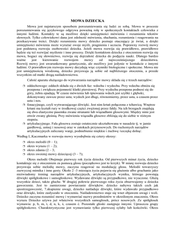 MOWA DZIECKA Mowa jest najstarszym sposobem porozumiewania się ludzi ze sobą. Mowa w procesie porozumiewania się językowego odgrywa poważną rolę w społecznych kontaktach człowieka z innymi ludźmi. Kontakty te są możliwe dzięki umiejętności mówienia i rozumienia tekstów słownych. Tylko człowiekowi dana jest zdolność mówienia, słuchania, rozumienia i reagowania na przekazywane treści. Dzięki rozumieniu mowy dziecko poznaje otaczający je świat, a dzięki umiejętności mówienia może wyrażać swoje myśli, pragnienia i uczucia. Poprawny rozwój mowy jest podstawą rozwoju osobowości dziecka. Jeżeli mowa rozwija się prawidłowo, prawidłowo będzie się też rozwijać myślenie i inne procesy. Dzięki kontaktom dziecka z otoczeniem rozwija się mowa, bogaci się słownictwo, rozwija się dojrzałość dziecka do podjęcia nauki. Dlatego bardzo ważne jest kierowanie rozwojem mowy od najwcześniejszego dzieciństwa. Rozwój mowy jest uwarunkowany genetycznie, ale możliwy jest jedynie w kontakcie z innymi ludźmi. O prawidłowym rozwoju mowy decydują więc czynniki biologiczne i społeczne. Mowa nie jest umiejętnością wrodzoną, dziecko przyswaja ją sobie od najbliższego otoczenia, a przede wszystkim od matki drogą naśladownictwa. Całość aparatu służącego do wytwarzania narządów mowy składa się z trzech narządów: oddechowego: oddech składa się z dwóch faz: wdechu i wydechu. Przy wdechu obniża się przepona i zwiększa pojemność klatki piersiowej. Przy wydechu przepona podnosi się do góry, żebra opadają. W czasie mówienia lub śpiewania wdech jest szybki i głęboki, dokonywany zawsze przez usta; wydech jest długi, równomierny, przez usta, a czasem przez usta i nos. fonacyjnego, czyli wytwarzającego dźwięki. Jest nim krtań połączona z tchawicą. Wnętrze krtani ma kształt rury w środkowej części zwężonej przez fałdy. Na ich brzegach znajdują się dwa elastyczne pasemka zwane strunami lub wiązadłami głosowymi. Między nimi jest otwór zwany głośnią. Przy mówieniu wiązadła głosowe zbliżają się do siebie w różnym stopniu. artykulacyjnego. Fala głosowa zostaje ostatecznie ukształtowana w nasadzie tj. w jamie gardłowej, ustnej i nosowej oraz w zatokach przynosowych. Do ruchomych narządów artykulacyjnych zaliczany wargi, podniebienie miękkie i żuchwę /szczękę dolną/. Według L.Kaczmarka w rozwoju mowy wyodrębnia się cztery okresy: okres melodii (0 – 1); okres wyrazu (1 – 2); okres zdania (2 – 3; okres swoistej mowy dziecięcej (3 – 7); Okres melodii Obejmuje pierwszy rok życia dziecka. Od pierwszych minut życia, dziecko kontaktuje się z otoczeniem za pomocą głosu (początkowo jest to krzyk). W miarę rozwoju dziecko przyswaja sobie melodię mowy, zaczyna reagować na modulację głosu. Melodii towarzyszy zazwyczaj mimika i inne gesty. Około 2 -3 miesiąca życia pojawia się głużenie albo gruchanie jako nieświadomy trening narządów artykulacyjnych, artykulacyjnych wyniku, którego powstają dźwięki spółgłoskowe i samogłoskowe. Wydawane dźwięki są przypadkowe, nie wyuczone. Głużą wszystkie dzieci, także głuche. W drugiej połowie pierwszego roku życia obserwujemy u dziecka gaworzenie. Jest to zamierzone powtarzanie dźwięków. dziecko nabywa takich cech jak spostrzegawczość, 7.skupienie uwagi, dziecko naśladuje dźwięki, które wydawało przypadkowo oraz dźwięki, które zasłyszało w otoczeniu. Naśladownictwo staje się wnet objawem uwagi i woli. Dziecko zaczyna rozumieć mowę i wymawiać nazwy przedmiotów w określonym znaczeniu. Okres wyrazu Dziecko używa już właściwie wszystkich samogłosek, prócz nosowych. Ze spółgłosek wymawia: p, b, m, t, d, n, k, ś, czasem ć. Pozostałe głoski zastępuje innymi. Upraszcza grupy spółgłoskowe. Charakterystyczne jest wymawianie tylko pierwszej sylaby lub końcówki. Okres zdania W tym czasie mowa ulega dalszemu doskonaleniu. Dziecko powinno już wymawiać spółgłoski: p, b, m, pi, bi, mi,, f, w, fi, wi, ś, ź, ć, dź, ń, ki, gi, k, g, ch, t, d, n, l. Pod koniec tego okresu mogą się już pojawić głoski s, z, c a nawet sz, ż, cz, dź. Często dziecko wie jak dana głoska powinna brzmieć, ale nie umie jej jeszcze wypowiedzieć. Okres swoistej mowy dziecięcej Mowę dziecka wstępującego do przedszkola charakteryzuje już duża umiejętność odtwarzania elementów słowa. Dziecko 3-letnie powinno już wymawiać wszystkie .samogłoski (a, e, i o,u, y, ą, ę), chociaż w mowie może występować zamiana a=o; e=a; i=y. dziecko powinno również wymawiać następujące spółgłoski: m, mi, b, bi, p, pi, f, fi, w, wi, ś, ć, ź, dź, ń, k, g, ki, gi, ch, t, d, n, z, l, li, j, ł. Zaczynają się też pojawiać głoski: s, z, c, dz. Często w mowie spontanicznej głoski są zamieniane na łatwiejsze.. Mowę dziecka 3-letniego charakteryzuje zmiękczanie głosek, upraszczanie grup spółgłoskowych w nagłosie ( na początku wyrazu), śródgłosie ( w środku wyrazu) i brak wyraźnych końcówek słów. „Wymowa dziecka 4-letniego będzie się już różniła pod względem dźwiękowym. Utrwalają się takie głoski jak: s, z, c, dz. Pojawia się głoska r, choć jej opóźnienie nie powinno jeszcze niepokoić. Opanowanie r jest dla dziecka wielkim sukcesem, i często jej nadużywa...Głoski sz, ż, cz, dż są zamienianie a grupy spółgłoskowe, choć lepiej brzmiące są jednak jeszcze upraszczane. Mowa dziecka 5-letniego jest już w zasadzie zrozumiała. Głoski sz, cz, ż, dż zaczynają się ustalać. Dziecko potrafi je poprawnie powtórzyć, choć w mowie potocznej mogą być wymawiane jako s, z, c, dz. Głoska r powinna już być wymawiana, ale często pojawia się dopiero w tym okresie. Grupy spółgłoskowe są upraszczane zarówno w nagłosie wyrazu jak i w śródgłosie... U 6-latków mowa powinna już być opanowana pod względem dźwiękowym...Zdarzają się kłopoty z wymową gr