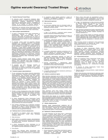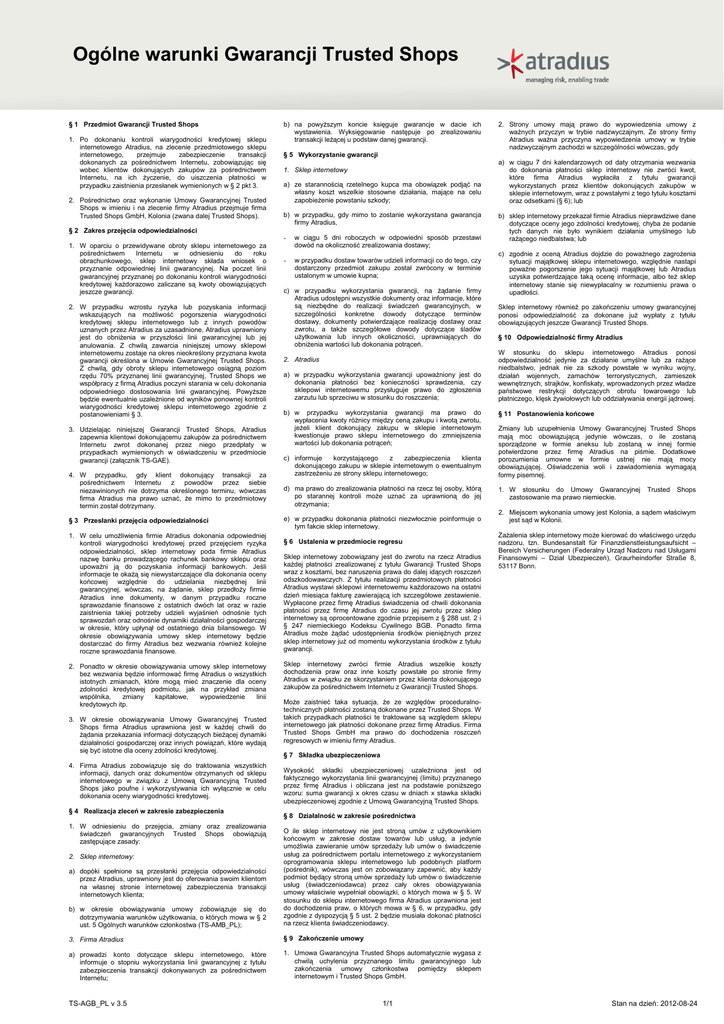 Ogólne warunki Gwarancji Trusted Shops § 1 Przedmiot Gwarancji Trusted Shops 1. Po dokonaniu kontroli wiarygodności kredytowej sklepu internetowego Atradius, na zlecenie przedmiotowego sklepu internetowego, przejmuje zabezpieczenie transakcji dokonanych za pośrednictwem Internetu, zobowiązując się wobec klientów dokonujących zakupów za pośrednictwem Internetu, na ich życzenie, do uiszczenia płatności w przypadku zaistnienia przesłanek wymienionych w § 2 pkt 3. 2. Pośrednictwo oraz wykonanie Umowy Gwarancyjnej Trusted Shops w imieniu i na zlecenie firmy Atradius przejmuje firma Trusted Shops GmbH, Kolonia (zwana dalej Trusted Shops). b) na powyższym koncie księguje gwarancje w dacie ich wystawienia. Wyksięgowanie następuje po zrealizowaniu transakcji leżącej u podstaw danej gwarancji. § 5 Wykorzystanie gwarancji 1. Sklep internetowy a) ze starannością rzetelnego kupca ma obowiązek podjąć na własny koszt wszelkie stosowne działania, mające na celu zapobieżenie powstaniu szkody; b) w przypadku, gdy mimo to zostanie wykorzystana gwarancja firmy Atradius, § 2 Zakres przejęcia odpowiedzialności 1. W oparciu o przewidywane obroty sklepu internetowego za pośrednictwem Internetu w odniesieniu do roku obrachunkowego, sklep internetowy składa wniosek o przyznanie odpowiedniej linii gwarancyjnej. Na poczet linii gwarancyjnej przyznanej po dokonaniu kontroli wiarygodności kredytowej każdorazowo zaliczane są kwoty obowiązujących jeszcze gwarancji. 2. W przypadku wzrostu ryzyka lub pozyskania informacji wskazujących na możliwość pogorszenia wiarygodności kredytowej sklepu internetowego lub z innych powodów uznanych przez Atradius za uzasadnione, Atradius uprawniony jest do obniżenia w przyszłości linii gwarancyjnej lub jej anulowania. Z chwilą zawarcia niniejszej umowy sklepowi internetowemu zostaje na okres nieokreślony przyznana kwota gwarancji określona w Umowie Gwarancyjnej Trusted Shops. Z chwilą, gdy obroty sklepu internetowego osiągną poziom rzędu 70% przyznanej linii gwarancyjnej, Trusted Shops we współpracy z firmą Atradius poczyni starania w celu dokonania odpowiedniego dostosowania linii gwarancyjnej. Powyższe będzie ewentualnie uzależnione od wyników ponownej kontroli wiarygodności kredytowej sklepu internetowego zgodnie z postanowieniami § 3. 3. Udzielając niniejszej Gwarancji Trusted Shops, Atradius zapewnia klientowi dokonującemu zakupów za pośrednictwem Internetu zwrot dokonanej przez niego przedpłaty w przypadkach wymienionych w oświadczeniu w przedmiocie gwarancji (załącznik TS-GAE). 4. W przypadku, gdy klient dokonujący transakcji za pośrednictwem Internetu z powodów przez siebie niezawinionych nie dotrzyma określonego terminu, wówczas firma Atradius ma prawo uznać, że mimo to przedmiotowy termin został dotrzymany. § 3 Przesłanki przejęcia odpowiedzialności 1. W celu umożliwienia firmie Atradius dokonania odpowiedniej kontroli wiarygodności kredytowej przed przejęciem ryzyka odpowiedzialności, sklep internetowy poda firmie Atradius nazwę banku prowadzącego rachunek bankowy sklepu oraz upoważni ją do pozyskania informacji bankowych. Jeśli informacje te okażą się niewystarczające dla dokonania oceny końcowej względnie do udzielania niezbędnej linii gwarancyjnej, wówczas, na żądanie, sklep przedłoży firmie Atradius inne dokumenty, w danym przypadku roczne sprawozdanie finansowe z ostatnich dwóch lat oraz w razie zaistnienia takiej potrzeby udzieli wyjaśnień odnośnie tych sprawozdań oraz odnośnie dynamiki działalności gospodarczej w okresie, który upłynął od ostatniego dnia bilansowego. W okresie obowiązywania umowy sklep internetowy będzie dostarczać do firmy Atradius bez wezwania również kolejne roczne sprawozdania finansowe. 2. Ponadto w okresie obowiązywania umowy sklep internetowy bez wezwania będzie informować firmę Atradius o wszystkich istotnych zmianach, które mogą mieć znaczenie dla oceny zdolności kredytowej podmiotu, jak na przykład zmiana wspólnika, zmiany kapitałowe, wypowiedzenie linii kredytowych itp. 3. W okresie obowiązywania Umowy Gwarancyjnej Trusted Shops firma Atradius uprawniona jest w każdej chwili do żądania przekazania informacji dotyczących bieżącej dynamiki działalności gospodarczej oraz innych powiązań, które wydają się być istotne dla oceny zdolności kredytowej. 4. Firma Atradius zobowiązuje się do traktowania wszystkich informacji, danych oraz dokumentów otrzymanych od sklepu internetowego w związku z Umową Gwarancyjną Trusted Shops jako poufne i wykorzystywania ich wyłącznie w celu dokonania oceny wiarygodności kredytowej. § 4 Realizacja zleceń w zakresie zabezpieczenia 1. W odniesieniu do przejęcia, zmiany oraz zrealizowania świadczeń gwarancyjnych Trusted Shops obowiązują zastępujące zasady: - w ciągu 5 dni roboczych w odpowiedni sposób przestawi dowód na okoliczność zrealizowania dostawy; - w przypadku dostaw towarów udzieli informacji co do tego, czy dostarczony przedmiot zakupu został zwrócony w terminie ustalonym w umowie kupna; c) w przypadku wykorzystania gwarancji, na żądanie firmy Atradius udostępni wszystkie dokumenty oraz informacje, które są niezbędne do realizacji świadczeń gwarancyjnych, w szczególności konkretne dowody dotyczące terminów dostawy, dokumenty potwierdzające realizację dostawy oraz zwrotu, a także szczegółowe dowody dotyczące śladów użytkowania lub innych okoliczności, uprawniających do obniżenia wartości lub dokonania potrąceń. 2. Atradius a) w przypadku wykorzystania gwarancji upoważniony jest do dokonania płatności bez konieczności sprawdzenia, czy sklepowi internetowemu przysługuje prawo do zgłoszenia zarzutu lub sprzeciwu w stosunku do roszczenia; b) w przypadku wykorzystania gwarancji ma prawo do wypłacenia kwoty różnicy między ceną zakupu i kwotą zwrotu, jeżeli klient dokonujący zakupu w sklepie interneto