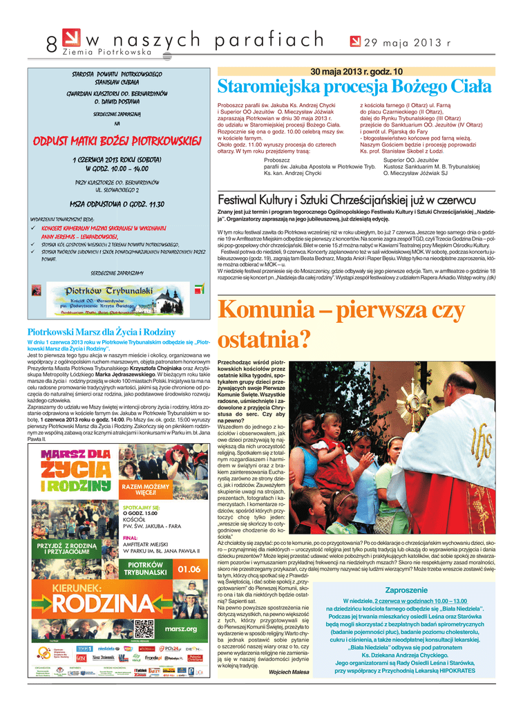 8 w naszych parafiach Ziemia Piotrkowska 29 maja 2013 r 30 maja 2013 r. godz. 10 Staromiejska procesja Bożego Ciała Proboszcz parafii św. Jakuba Ks. Andrzej Chycki i Superior OO Jezuitów O. Mieczysław Jóźwiak zapraszają Piotrkowian w dniu 30 maja 2013 r. do udziału w Staromiejskiej procesji Bożego Ciała. Rozpocznie się ona o godz. 10.00 celebrą mszy św. w kościele farnym. Około godz. 11.00 wyruszy procesja do czterech ołtarzy. W tym roku przejdziemy trasą: z kościoła farnego (I Ołtarz) ul. Farną do placu Czarnieckiego (II Ołtarz), dalej do Rynku Trybunalskiego (III Ołtarz) przejście do Sanktuarium OO. Jezuitów (IV Ołtarz) i powrót ul. Pijarską do Fary - błogosławieństwo końcowe pod farną wieżą. Naszym Gościem będzie i procesję poprowadzi Ks. prof. Stanisław Skobel z Łodzi. Proboszcz parafii św. Jakuba Apostoła w Piotrkowie Tryb. Ks. kan. Andrzej Chycki Superior OO. Jezuitów Kustosz Sanktuarim M. B. Trybunalskiej O. Mieczysław Jóźwiak SJ Festiwal Kultury i Sztuki Chrześcijańskiej już w czerwcu Znany jest już termin i program tegorocznego Ogólnopolskiego Festiwalu Kultury i Sztuki Chrześcijańskiej „Nadzieja”. Organizatorzy zapraszają na jego jubileuszową, już dziesiątą edycję. W tym roku festiwal zawita do Piotrkowa wcześniej niż w roku ubiegłym, bo już 7 czerwca. Jeszcze tego samego dnia o godzinie 19 w Amfiteatrze Miejskim odbędzie się pierwszy z koncertów.Na scenie zagra zespół TGD, czyli Trzecia Godzina Dnia – polski pop-gospelowy chór chrześcijański.Bilet w cenie 15 zł można nabyć w Kawiarni Teatralnej przy Miejskim Ośrodku Kultury. Festiwal potrwa do niedzieli, 9 czerwca.Koncerty zaplanowano też w sali widowiskowej MOK.W sobotę, podczas koncertu jubileuszowego (godz.19), zagrają tam Beata Bednarz, Magda Anioł i Raper Bęsiu.Wstęp tylko na nieodpłatne zaproszenia, które można odbierać w MOK – u. W niedzielę festiwal przeniesie się do Moszczenicy, gdzie odbywały się jego pierwsze edycje.Tam, w amfiteatrze o godzinie 18 rozpocznie się koncert pn.„Nadzieja dla całej rodziny”.Wystąpi zespół festiwalowy z udziałem Rapera Arkadio.Wstęp wolny.(dk) Piotrkowski Marsz dla Życia i Rodziny W dniu 1 czerwca 2013 roku w Piotrkowie Trybunalskim odbędzie się „Piotrkowski Marsz dla Życia i Rodziny”. Jest to pierwsza tego typu akcja w naszym mieście i okolicy, organizowana we współpracy z ogólnopolskim ruchem marszowym, objęta patronatem honorowym Prezydenta Miasta Piotrkowa Trybunalskiego Krzysztofa Chojniaka oraz Arcybiskupa Metropolity Łódzkiego Marka Jędraszewskiego. W bieżącym roku takie marsze dla życia i rodziny przejdą w około 100 miastach Polski.Inicjatywa ta ma na celu radosne promowanie tradycyjnych wartości, jakimi są życie chronione od poczęcia do naturalnej śmierci oraz rodzina, jako podstawowe środowisko rozwoju każdego człowieka. Zapraszamy do udziału we Mszy świętej w intencji obrony życia i rodziny, która zostanie odprawiona w kościele farnym św. Jakuba w Piotrkowie Trybunalskim w sobotę, 1 czerwca 2013 roku o godz. 14:00. Po Mszy św. ok. godz. 15:00 wyruszy pierwszy Piotrkowski Marsz dla Życia i Rodziny. Zakończy się on piknikiem rodzinnym ze wspólną zabawą oraz licznymi atrakcjami i konkursami w Parku im.bł.Jana Pawła II. 6327.$-0< 6,ą O GODZ. 15.00 .2ė&,Ðâ 3: ė: -$.8%$ )$5$ 2:6.,(*2 &+(â02č6.,(*2 6.,(*277$ ),1$â $0),7($75 0,(-6., : 3$5.8 ,0 %â -$1$ 3$:â$ ,, PIOTRKÓW TRYBUNALSKI 01.06 Komunia – pierwsza czy ostatnia? Przechodząc wśród piotrkowskich kościołów przez ostatnie kilka tygodni, spotykałem grupy dzieci przeżywających swoje Pierwsze Komunie Święte. Wszystkie radosne, uśmiechnięte i zadowolone z przyjęcia Chrystusa do serc. Czy aby na pewno? Wszedłem do jednego z kościołów i obserwowałem, jak owe dzieci przeżywają tę największą dla nich uroczystość religijną. Spotkałem się z totalnym rozgardiaszem i harmidrem w świątyni oraz z brakiem zainteresowania Eucharystią zarówno ze strony dzieci, jak i rodziców. Zauważyłem skupienie uwagi na strojach, prezentach, fotografach i kamerzystach. I komentarze rodziców, spośród których przytoczyć chcę tylko jeden: „wreszcie się skończy to cotygodniowe chodzenie do kościoła.” Aż chciałoby się zapytać:po co te komunie, po co przygotowania? Po co deklaracje o chrześcijańskim wychowaniu dzieci, skoro – przynajmniej dla niektórych – uroczystość religijna jest tylko pustą tradycją lub okazją do wyprawienia przyjęcia i dania dziecku prezentów? Może lepiej przestać udawać wielce pobożnych i praktykujących katolików, dać sobie spokój ze stwarzaniem pozorów i wymuszaniem przykładnej frekwencji na niedzielnych mszach? Skoro nie respektujemy zasad moralności, skoro nie przestrzegamy przykazań, czy dalej możemy nazywać się ludźmi wierzącymi? Może trzeba wreszcie zostawić święta tym, którzy chcą spotkać się z Prawdziwą Świętością, i dać sobie spokój z „przygotowaniem” do Pierwszej Komunii, skoZaproszenie ro ona i tak dla niektórych będzie ostatnią? Sapienti sat. W niedziele, 2 czerwca w godzinach 10.00 – 13.00 Na pewno powyższe spostrzeżenia nie na dziedzińcu kościoła farnego odbędzie się „Biała Niedziela”. dotyczą wszystkich, na pewno większość Podczas jej trwania mieszkańcy osiedli Leśna oraz Starówka z tych, którzy przygotowywali się będą mogli skorzystać z bezpłatnych badań spirometrycznych do Pierwszej Komunii Świętej, przeżyła to pojemności płuc), badanie poziomu cholesterolu, (badanie wydarzenie w sposób religijny.Warto chyba jednak postawić sobie pytanie cukru i ciśnienia, a także nieodpłatnej konsultacji lekarskiej. o szczerość naszej wiary oraz o to, czy „Biała Niedziela”odbywa się pod patronatem pewne wydarzenia religijne nie zamieniaKs. Dziekana Andrzeja Chyckiego. ją się w naszej świadomości jedynie Jego organizatorami są 