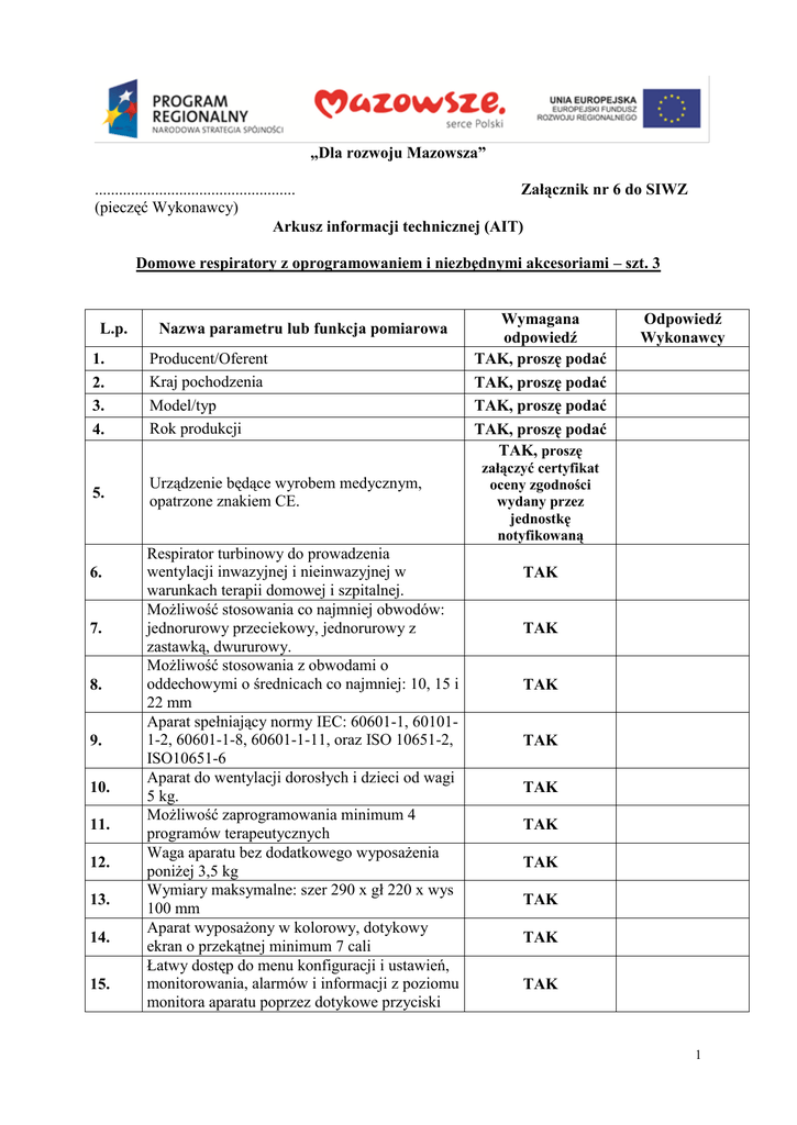 „Dla rozwoju Mazowsza” .................................................. Załącznik nr 6 do SIWZ (pieczęć Wykonawcy) Arkusz informacji technicznej (AIT) Domowe respiratory z oprogramowaniem i niezbędnymi akcesoriami – szt. 3 L.p. Nazwa parametru lub funkcja pomiarowa 1. 2. 3. 4. Producent/Oferent Kraj pochodzenia Model/typ Rok produkcji 5. Urządzenie będące wyrobem medycznym, opatrzone znakiem CE. 6. 7. 8. 9. 10. 11. 12. 13. 14. 15. Respirator turbinowy do prowadzenia wentylacji inwazyjnej i nieinwazyjnej w warunkach terapii domowej i szpitalnej. Możliwość stosowania co najmniej obwodów: jednorurowy przeciekowy, jednorurowy z zastawką, dwururowy. Możliwość stosowania z obwodami o oddechowymi o średnicach co najmniej: 10, 15 i 22 mm Aparat spełniający normy IEC: 60601-1, 601011-2, 60601-1-8, 60601-1-11, oraz ISO 10651-2, ISO10651-6 Aparat do wentylacji dorosłych i dzieci od wagi 5 kg. Możliwość zaprogramowania minimum 4 programów terapeutycznych Waga aparatu bez dodatkowego wyposażenia poniżej 3,5 kg Wymiary maksymalne: szer 290 x gł 220 x wys 100 mm Aparat wyposażony w kolorowy, dotykowy ekran o przekątnej minimum 7 cali Łatwy dostęp do menu konfiguracji i ustawień, monitorowania, alarmów i informacji z poziomu monitora aparatu poprzez dotykowe przyciski Wymagana odpowiedź TAK, proszę podać TAK, proszę podać TAK, proszę podać TAK, proszę podać TAK, proszę Odpowiedź Wykonawcy załączyć certyfikat oceny zgodności wydany przez jednostkę notyfikowaną TAK TAK TAK TAK TAK TAK TAK TAK TAK TAK 1 TAK 22.1. 22.2. 22.3. 22.4. 22.5. Samoczynna blokada ekranu dotykowego Dwa poziomy dostępu do menu użytkownika: pacjenta (ograniczony) i kliniczny (pełny) Turbina o wysokiej zdolności kompensacji przecieków, wydajność minimum 220 l/min Możliwość doposażenia aparatu w szpitalny wózek jezdny, podstawę na stolik, torbę podróżną przystosowaną również do mocowania na wózku inwalidzkim. Respirator przystosowany do pracy ciągłej Certyfikat możliwości użytkowania aparatu przez pacjenta w samolocie podczas podroży Dostępne tryby pracy: z docelową objętością i ciśnieniem CPAP S T ST PAC 22.6. PC TAK 22.7. ACV TAK 22.8. TAK 22.11. CV PS z funkcją zapewnienia bezpiecznej objętości TV PACV z funkcją zapewnienia bezpiecznej objętości TV PCV 22.12. P-SIMV TAK 22.13. V-SIMV TAK Regulowane wyzwalacze ciśnieniowy i TAK objętościowy o regulacji minimum 5 stopni Zakres generowanych ciśnień, co najmniej: IPAP: 2÷50 mbar, TAK EPAP: 0÷25 mbar, TAK CPAP: 3÷20mbar. TAK Objętość oddechowa nastawiana (Vt) co TAK najmniej z zakresu: 50÷2500 ml Automatyczny algorytm kompensujący zmienne TAK, proszę opisać przecieki Możliwość zaprogramowania westchnięć TAK Możliwość włączenia wdechu manualnego TAK Kontrola czasu narastania ciśnienia wdechowego co najmniej z zakresu od min 90 TAK do 900 ms Regulowany czas wdechu w zakresie co TAK najmniej od 0,2 do 5 sekund Monitorowanie 16. 17. 18. 19. 20. 21. 22. 22.9. 22.10. 23. 24. 24.1. 24.2. 24.3. 25. 26. 27. 28. 29. 30. 31. TAK TAK TAK TAK TAK TAK TAK TAK TAK TAK TAK TAK TAK TAK 2 31.1. 31.2. 31.3. 31.4. 31.5. 31.6. 31.7. 31.8. Krzywe skalarne: ciśnienie i przepływ w czasie rzeczywistym Graficzny wskaźnik ciśnienia aktualnego, PEEP/EPAP, średniego Pomiar przecieków niezamierzonych Cyfrowy wskaźnik ciśnienia szczytowego Pomiar wskaźnika I:E Pomiar w % oddechów inicjowanych i kończonych przez pacjenta Aparat wyposażony w funkcję testującą konfigurację obwodu oraz przecieki zamierzone Czytelny symbol wskazujący na rozpoczęcie i zakończenie wdechu przez pacjenta TAK TAK TAK TAK TAK TAK TAK TAK 31.9. Zintegrowany pomiar stężenia O2 w układzie oddechowym wychodzącym do pacjenta TAK 31.10. Zintegrowany pulsoksymetr wykonujący pomiary również w trybie czuwania TAK 31.11. 31.12. Szczegółowe dane dotyczące pracy aparatu i wentylacji w ciągu co najmniej ostatnich 7 dni dostępne na ekranie aparatu i do pobrania przy użyciu PC z zainstalowanym dedykowanym oprogramowaniem Dane sumaryczne dotyczące pracy aparatu i wentylacji za ostanie co najmniej 365 dni dostępne na ekranie aparatu i do pobrania przy użyciu PC z zainstalowanym dedykowanym oprogramowaniem TAK TAK 31.13. Oprogramowanie do analizy danych dostępne dla użytkownika bezpłatnie 32. Alarmy 32.1. Awarii zasilania TAK 32.2. TAK 32.10. Braku ładowania Krytycznego poziomu naładowania baterii wewnętrznej Braku przejścia testu Niewłaściwej konfiguracji urządzenia (nieprawidłowa maska, adapter, obwód) Wysokiej nieszczelności Objętości oddechowej wdechowej i wydechowej (niska, wysoka) Wentylacji minutowej wdechowej i wydechowej (wysoka, niska) Wysokiego poziomu ciśnienia i/lub niedrożności Niskiego poziomu ciśnienia 32.11. Niskiej i wysokiej częstości oddechowej TAK 32.3. 32.4. 32.5. 32.6. 32.7. 32.8. 32.9. TAK TAK TAK TAK TAK TAK TAK TAK TAK 3 32.13. Bezdechu (z możliwością regulacji czasu reakcji) Niski i wysoki poziom FiO2 oraz tętna 32.14. Niski i wysoki poziom SpO2 TAK 32.15. Niski i wysoki PEEP TAK 32.16. Niski poziom baterii TAK 32.17. 32.18. 32.19. Rozłączenie układu Alarmy o 3 priorytetach (wysoki, średni i niski) Możliwość wyciszenia alarmów na 2 minuty Alarm bezdechu z możliwością wyboru: tylko alarm lub alarm z wentylacją bezdechu Alarm bezdechu z możliwością wyboru: bezdech pacjenta lub każdy bezdech Dostępny ekran z podglądem aktywnych alarmów Zintegrowana litowo-jonowa bateria wewnętrzna umożliwiająca pracę respiratora przy w pełni naładowanej baterii przez co najmniej 8 godzin. Wskaźnik naładowania baterii na ekranie respiratora. Możliwość rozbudowy o zewnętrzne baterie do czasu zasilania minimum 24 godziny Możliwość podłączenia nawilżacza z podgrzewaczem lub filtra typu HME Głośność pracy respiratora - maksymalnie 35dB Gwarancja minimum 2 lata Serwis turbiny nie częściej niż co 4 lata lub minimum 35 000 godzin pracy turbi