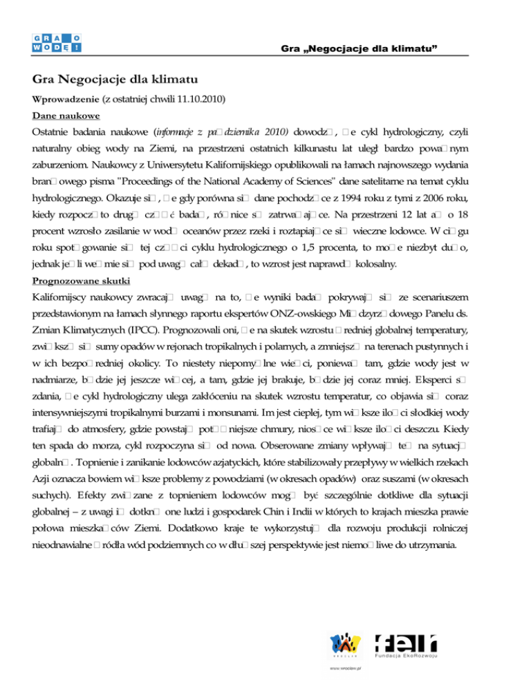 Gra „Negocjacje dla klimatu” Gra Negocjacje dla klimatu Wprowadzenie (z ostatniej chwili 11.10.2010) Dane naukowe Ostatnie badania naukowe (informacje z pa dziernika 2010) dowodz , e cykl hydrologiczny, czyli naturalny obieg wody na Ziemi, na przestrzeni ostatnich kilkunastu lat uległ bardzo powa nym zaburzeniom. Naukowcy z Uniwersytetu Kalifornijskiego opublikowali na łamach najnowszego wydania bran owego pisma "Proceedings of the National Academy of Sciences" dane satelitarne na temat cyklu hydrologicznego. Okazuje si , e gdy porówna si dane pochodz ce z 1994 roku z tymi z 2006 roku, kiedy rozpocz to drug ć bada , ró nice s cz zatrwa aj ce. Na przestrzeni 12 lat a procent wzrosło zasilanie w wod oceanów przez rzeki i roztapiaj ce si roku spot gowanie si tej cz o 18 wieczne lodowce. W ci gu ci cyklu hydrologicznego o 1,5 procenta, to mo e niezbyt du o, jednak je li we mie si pod uwag cał dekad , to wzrost jest naprawd kolosalny. Prognozowane skutki Kalifornijscy naukowcy zwracaj uwag na to, e wyniki bada pokrywaj si ze scenariuszem przedstawionym na łamach słynnego raportu ekspertów ONZ-owskiego Mi dzyrz dowego Panelu ds. Zmian Klimatycznych (IPCC). Prognozowali oni, e na skutek wzrostu redniej globalnej temperatury, zwi ksz si sumy opadówwrejonach tropikalnych i polarnych, a zmniejsz na terenach pustynnych i w ich bezpo redniej okolicy. To niestety niepomy lne wie ci, poniewa tam, gdzie wody jest w nadmiarze, b dzie jej jeszcze wi cej, a tam, gdzie jej brakuje, b dzie jej coraz mniej. Eksperci s zdania, e cykl hydrologiczny ulega zakłóceniu na skutek wzrostu temperatur, co objawia si coraz intensywniejszymi tropikalnymi burzami i monsunami. Im jest cieplej, tym wi ksze ilo ci słodkiej wody trafiaj do atmosfery, gdzie powstaj pot ten spada do morza, cykl rozpoczyna si niejsze chmury, nios ce wi ksze ilo ci deszczu. Kiedy od nowa. Obserowane zmiany wpływaj te na sytuacj globaln . Topnienie i zanikanie lodowcówazjatyckich, które stabilizowały przepływy wwielkich rzekach Azji oznacza bowiem wi ksze problemy z powodziami (w okresach opadów) oraz suszami (w okresach suchych). Efekty zwi zane z topnieniem lodowców mog być szczególnie dotkliwe dla sytuacji globalnej – z uwagi i dotkn one ludzi i gospodarek Chin i Indii w których to krajach mieszka prawie połowa mieszka ców Ziemi. Dodatkowo kraje te wykorzystuj dla rozwoju produkcji rolniczej nieodnawialne ródła wód podziemnych co wdłu szej perspektywie jest niemo liwe do utrzymania. Gra „Negocjacje dla klimatu” Cel zaj ć: zapoznanie ze skutkami zmian klimatu oraz mi dzynarodowymi inicjatywami na rzecz jego ochrony. Cele operacyjne: - ucze rozumie potrzeb ochrony klimatu oraz skutki zmian klimatu w temacie zaopatrzenia ludzi wwod , - ucze wymienia wybrane inicjatywy mi dzynarodowe na rzecz klimatu, - uczestniczy w symulacji obrad Konferencji Stron Ramowej Konwencji Narodów Zjednoczonych w sprawie zmian klimatu (UNFCCC), argumentuje swoje stanowisko, wnioskuje, prognozuje rozwój wypadków, negocjuje - ucze rozumie, e działalno ć ludzi zamieszkuj cych bogate kraje północy ma wpływ na ycie ludzi na całym wiecie a w szczególno ci na mieszka cówkrajów ubogiego południa (równie w kontek cie bezpiecze stwa globalnego). rodki: plansza ilustruj ca wiatow emisj CO2, tabela „Wska niki redukcji emisji”, tabela „Informacje o krajach”, karta Sekretarza Konferencji Stron Konwencji Klimatycznej, karta Prezesa Funduszu Adaptacyjnego, karty dla poszczególnych krajów, wizytówki dla krajów, karty katastrof, 200 monet (np. jednogroszowych albo guzików, etonów), 2 pojemniki na monety (jeden mały, drugi wi kszy np. pudełeczka, słoiki, talerzyki), zegarek lub minutnik (np. do gotowania jajek). Czas trwania: dwie godziny lekcyjne Miejsce zaj ć: sala lekcyjna Grupa wiekowa: gimnazja i szkoły ponadgimnazjalne Przebieg zaj ć: Prowadz cy pyta uczniów czy słyszeli o krajowych lub mi dzynarodowych inicjatywach maj cych na celu ograniczenie emisji gazów cieplarnianych. Wypowiedzi uczniów nauczyciel uzupełnia w formie krótkiego wykładu na ten temat. Omawiamy pokrótce histori mi dzynarodowych wysiłków od Rio do Cancún. W Cancún (Meksyk) konferencja odb dzie si 29.11 – 10.12.2010. Po drodze były konferencje wPoznaniu (2008) i wKopenhadze (2009). Je li negocjacje wCancún nie przynios efektu ostatnia szansa to negocjacje w RPA (pod koniec roku 2011)/ patrz m.in. : „Małe ABC… ochrony klimatu” oraz inne informacje o Ramowej Konwencji Narodów Zjednoczonych w sprawie zmian klimatu – np. z wikipedii). Uzmysławiamy jak trudne s mi dzynarodowe negocjacje (ró ne interesy i naciski grup lobbystycznych) oraz jak wa ny jest zbli aj cy si szczyt wPołudniowej Afryce (ustalenia z ko ca 2011 roku to ostatnia szansa na powa ne zmiany - w 2012 roku wygasa Protokół z Kioto, potrzebne s nowe mi dzynarodowe wi ce ustalenia). Gra „Negocjacje dla klimatu” Cel gry Przechodzimy do II cz ci zaj ć – gry czyli uproszczonej symulacji obrad Konferencji Stron Konwencji Klimatycznej (COP). Celem tej gry jest ukazanie mechanizmów negocjacyjnych, stanowisk stron oraz pomysłów składaj cych si redukcj na nowe porozumienie ws. ochrony klimatu, które obejmuje: emisji gazów cieplarnianych w poszczególnych krajach, adaptowanie do zmian klimatycznych oraz transfer przyjaznych klimatowi technologii do krajówubo szych, a tak e mechanizmy finansowe. Celem wszystkich uczestników gry jest uratowanie wiata przed nadmiernym ociepleniem klimatu i jego skutkami. Jest to mo liwe tylko poprzez ograniczenie emisji gazów cieplarnianych (zarówno poprzez zamykanie fabryk-trucicieli lub modernizowanie ich oraz poprzez edukacj społecze stwa), a tak e poprzez bezpo rednie zapobieganie skutkom zmian klimatu (przeznaczanie adaptacyjny). Wa ne jest tak e to, dbać o sytuacj ekonomiczn rodków na fundusz e kraje oprócz redukowania emisji gazów cieplarnianych, musz swojego kraju. W wiecie rzeczywistym wyst puj ogromne