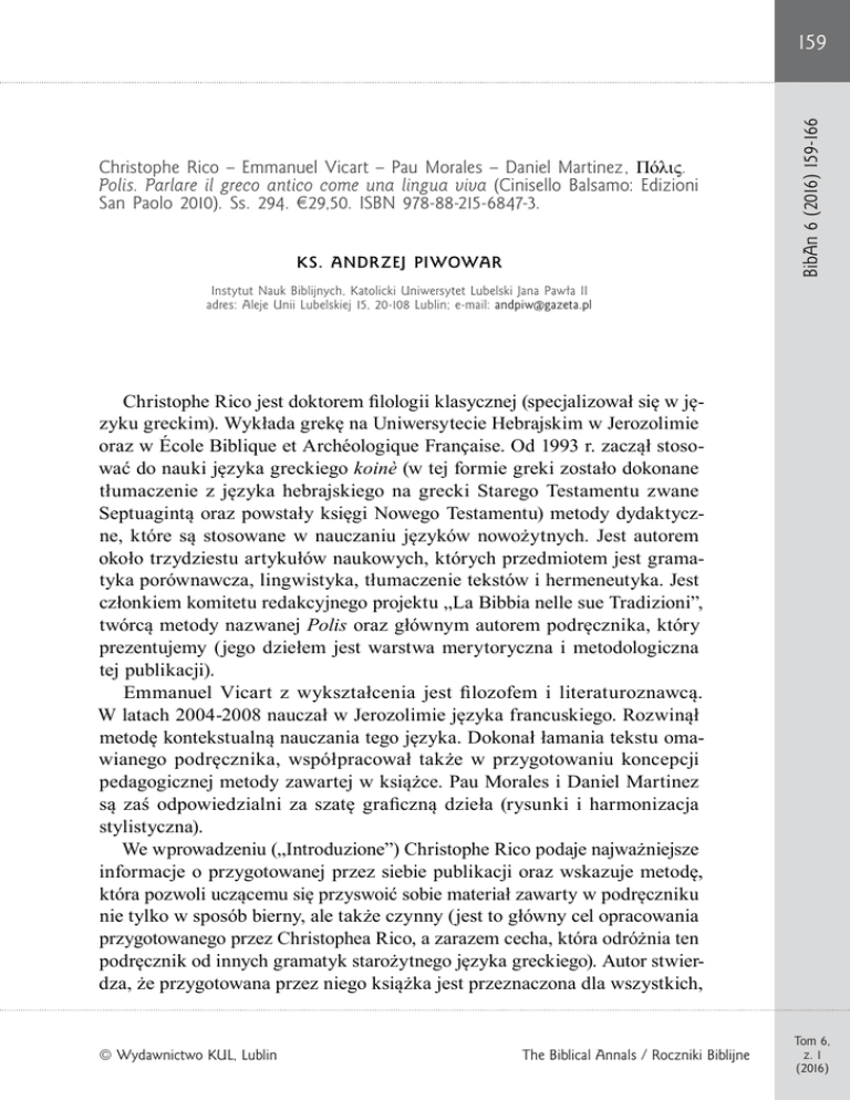 Christophe Rico – Emmanuel Vicart – Pau Morales – Daniel Martinez, Πόλις. Polis. Parlare il greco antico come una lingua viva (Cinisello Balsamo: Edizioni San Paolo 2010). Ss. 294. €29,50. ISBN 978-88-215-6847-3. KS. ANDRZEJ PIWOWAR BibAn 6 (2016) 159-166 159 Instytut Nauk Biblijnych, Katolicki Uniwersytet Lubelski Jana Pawła II adres: Aleje Unii Lubelskiej 15, 20-108 Lublin; e-mail: [email protected] Christophe Rico jest doktorem filologii klasycznej (specjalizował się w języku greckim). Wykłada grekę na Uniwersytecie Hebrajskim w Jerozolimie oraz w École Biblique et Archéologique Française. Od 1993 r. zaczął stosować do nauki języka greckiego koinè (w tej formie greki zostało dokonane tłumaczenie z języka hebrajskiego na grecki Starego Testamentu zwane Septuagintą oraz powstały księgi Nowego Testamentu) metody dydaktyczne, które są stosowane w nauczaniu języków nowożytnych. Jest autorem około trzydziestu artykułów naukowych, których przedmiotem jest gramatyka porównawcza, lingwistyka, tłumaczenie tekstów i hermeneutyka. Jest członkiem komitetu redakcyjnego projektu „La Bibbia nelle sue Tradizioni”, twórcą metody nazwanej Polis oraz głównym autorem podręcznika, który prezentujemy (jego dziełem jest warstwa merytoryczna i metodologiczna tej publikacji). Emmanuel Vicart z wykształcenia jest filozofem i literaturoznawcą. W latach 2004-2008 nauczał w Jerozolimie języka francuskiego. Rozwinął metodę kontekstualną nauczania tego języka. Dokonał łamania tekstu omawianego podręcznika, współpracował także w przygotowaniu koncepcji pedagogicznej metody zawartej w książce. Pau Morales i Daniel Martinez są zaś odpowiedzialni za szatę graficzną dzieła (rysunki i harmonizacja stylistyczna). We wprowadzeniu („Introduzione”) Christophe Rico podaje najważniejsze informacje o przygotowanej przez siebie publikacji oraz wskazuje metodę, która pozwoli uczącemu się przyswoić sobie materiał zawarty w podręczniku nie tylko w sposób bierny, ale także czynny (jest to główny cel opracowania przygotowanego przez Christophea Rico, a zarazem cecha, która odróżnia ten podręcznik od innych gramatyk starożytnego języka greckiego). Autor stwierdza, że przygotowana przez niego książka jest przeznaczona dla wszystkich, © Wydawnictwo KUL , Lublin The Biblical Annals / Roczniki Biblijne Tom 6, z. 1 (2016) 160 B ook R ev i ew s Ks. Andrzej Piwowar Vol. 6, no. 1 (2016) którzy zapragnęliby czytać starożytne teksty greckie. Zaznacza od razu, że chodzi o język grecki koinè, w którym zostały napisane najważniejsze dla naszej kultury dzieła, począwszy od Plutarcha, a na Nowym Testamencie zakończywszy. Mimo że celem podręcznika jest nauka języka starożytnego – martwego (nieużywanego już dzisiaj), to jednak zastosowano w niej współczesne metody nauczania języków obcych. Christophe Rico sięgnął do dzieł powstałych w tej odmianie języka greckiego, aby zaczerpnąć z nich słownictwo, które było używane w przeszłości przez autorów tworzących w koinè. Tylko w wyjątkowych sytuacjach (słowa zaznaczone gwiazdką) autor stworzył neologizmy, aby za ich pomocą określić rzeczywistości, które w czasach, gdy koinè było językiem żywym (powszechnie używanym), jeszcze nie istniały (np. adres elektroniczny – he oikēsis he ēlektronikē; numer telefonu – ho arithmos tou tēlefōnou, s. 32 czy pociąg – ōkyporon, s. 159). Dzięki temu język grecki, którego poznanie jest celem Πόλις. Polis. Parlare il greco antico come una lingua viva z jednej strony jest autentyczny (starożytny), z drugiej sprawia wrażenie języka żywego (obecnie używanego). Książka powstała jako podręcznik, który może być wykorzystany zarówno w nauczaniu grupowym pod kierunkiem lektora, jak również przez osoby, które samodzielnie chciałyby nauczyć się greki. Każda lekcja oparta jest na dwóch lub trzech tekstach, których tłumaczenie znajduje się na końcu książki (poczynając od s. 195). Nie są to przekłady literalne, lecz oddające sens danego zdania, który według autora jest ważniejszy niż analiza każdego ze słów z osobna. W każdej jednostce dydaktycznej znajdują się rysunki, które zostały tak opracowane i dobrane, aby pomóc uczącemu się zapamiętać materiał teoretyczny przedstawiony w danej lekcji. Ćwiczenia zaproponowane przez autora posiadają zróżnicowany charakter: np. wypełnienie pustych miejsc, połączenie części zdań, udzielenie odpowiedzi na pytania czy napisanie tekstu. Celem ich jest wzbudzenie zainteresowania uczącego się. Na końcu podręcznika (poczynając od s. 213) znajduje się klucz zawierający poprawne odpowiedzi do każdego z zaproponowanych ćwiczeń. Słowniczek, który zamieszczony jest na końcu podręcznika (poczynając od s. 237), nie posiada klasycznej formy słowniczków, które każdemu słowu przypisują jego znaczenie. Jest to raczej wykaz zdań (tłumaczenie ich zostało podane przez autora poniżej), które pozwalają uczącemu się poznać użycie danego słowa w różnych kontekstach. Dzięki temu, zdaniem autora, uniknął on przekonania, że każdemu słowu greckiemu odpowiada jedno ściśle określone słowo zaczerpnięte z danego języka nowożytnego. Do książki została dołączona płyta CD, która zawiera nagrania dialogów i tekstów oznaczonych przez słuchawki w tekście każdej z lekcji. W nagraniu została zastosowana wymowa z początków powstania koinè. Wybór tej The Biblical Annals / Roczniki Biblijne 161 formy autor uzasadnił motywami pedagogicznymi. Typ wymowy, w jakiej zostały nagrane teksty, lepiej odpowiada zapisowi ortograficznemu greki niż jej późniejsze formy, w których liczne dyftongi zostały upodobnione do samogłosek (np. ai wymawiało się jak e, czy ei jak i). Ponadto jedność koinè opiera się nie na wymowie, lecz na ortografii, dlatego właśnie Rico wybrał tę, a nie inną formę